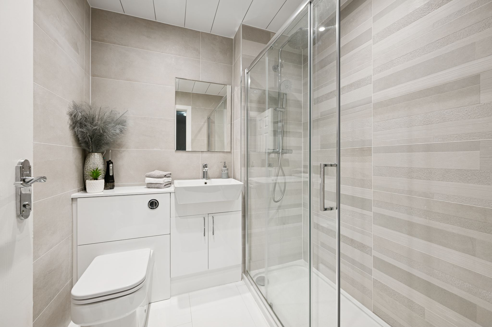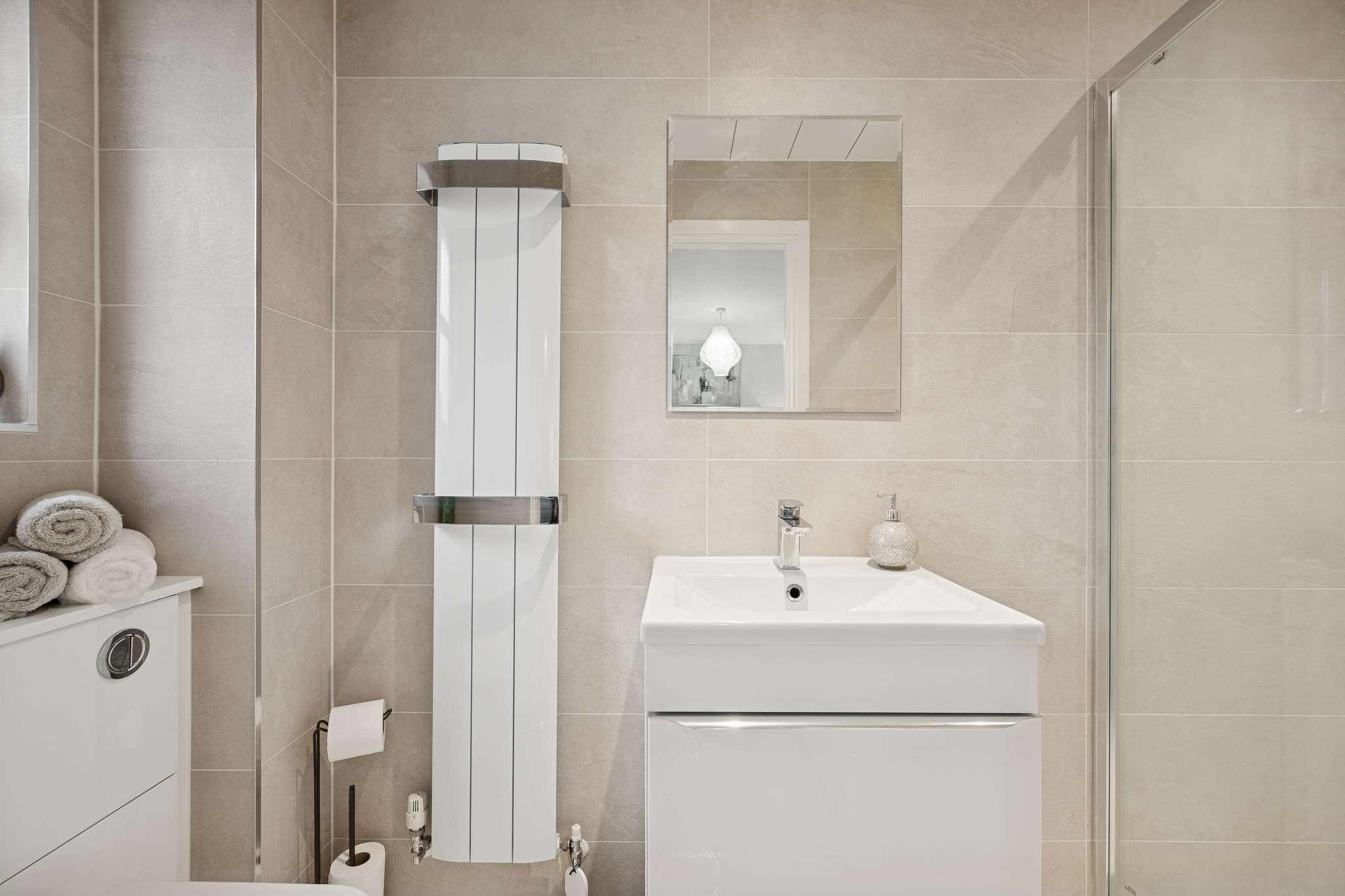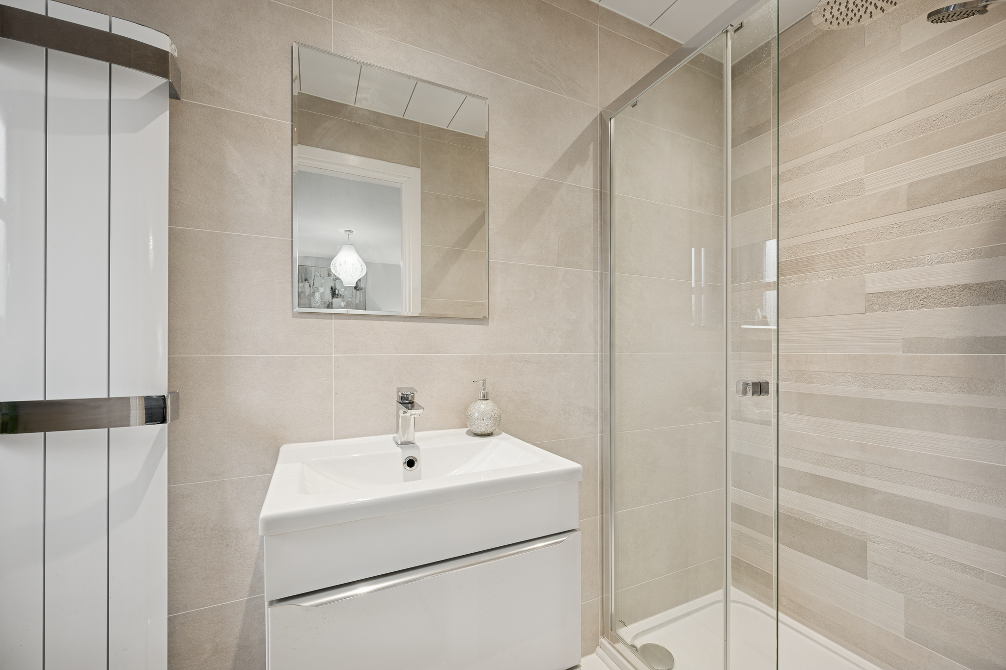 Completing this floor is a beautifully appointed family bathroom, finished with full height tiling in elegant neutral shades, a fantastic sized walk in shower in a modern white suite and clean, contemporary feel throughout. The result is a space that feels both practical and luxurious ,ideal for family use while retaining a refined, high end feel.