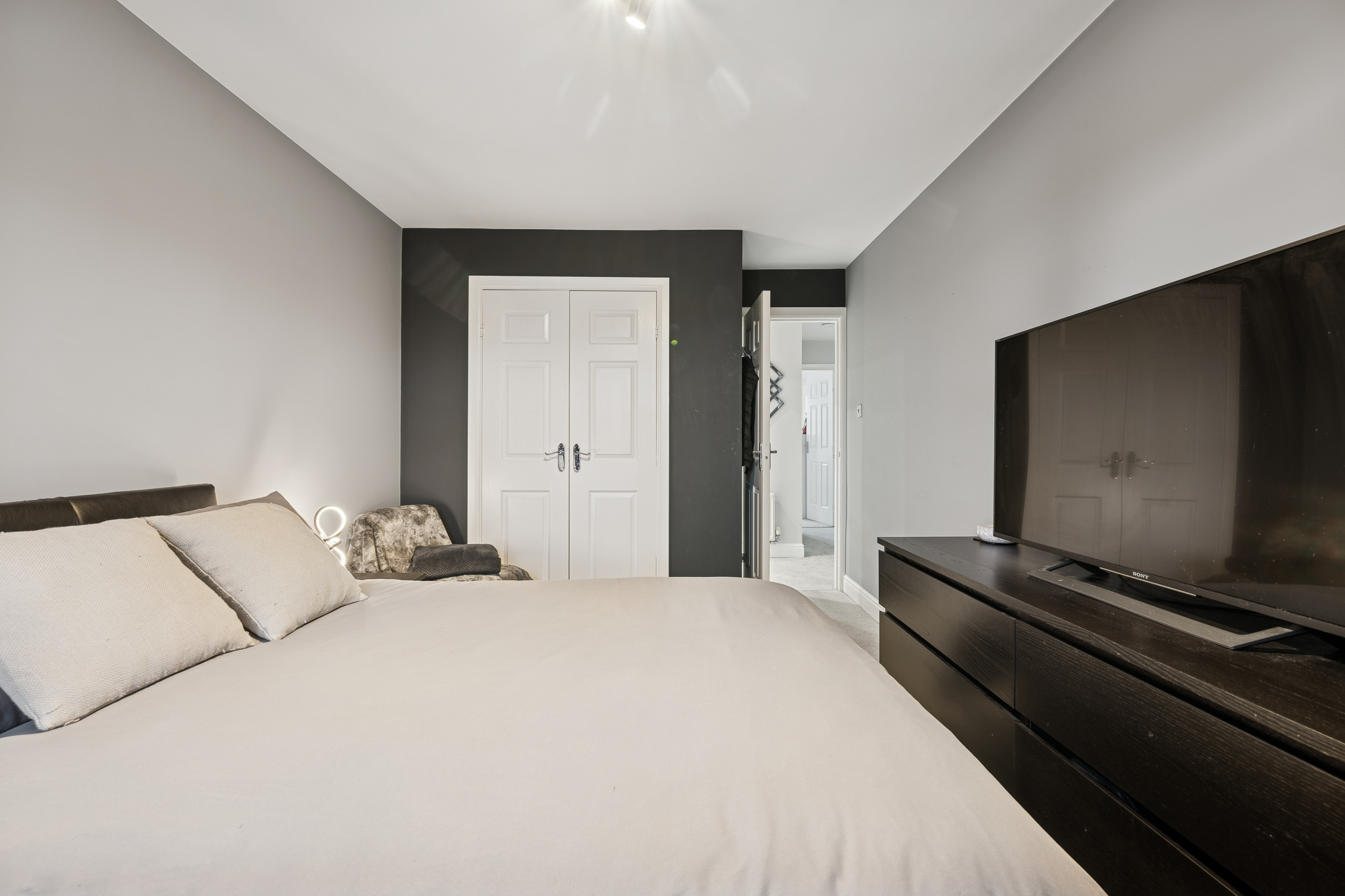 To the right hand side at the rear of the property on the ground floor is Bedroom Four, currently styled as a cosy and inviting room with darker feature walls and wood effect flooring. This versatile space lends itself perfectly to use as a guest bedroom, home office, snug or playroom, offering excellent flexibility to suit a wide range of lifestyles, this room also benefits from french doors open directly out to the rear garden, creating a seamless connection between indoor and outdoor living and making this an ideal setting for both everyday family life and entertaining.