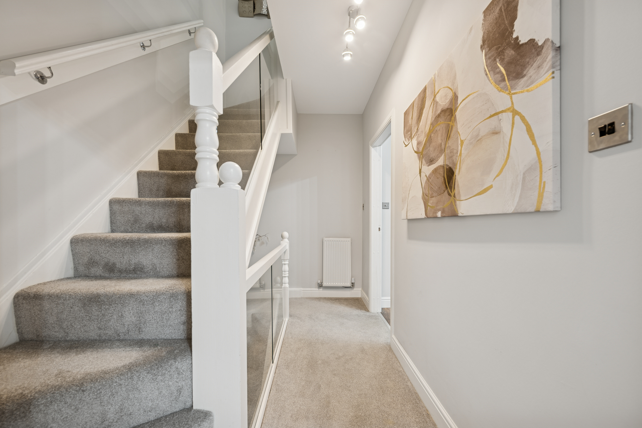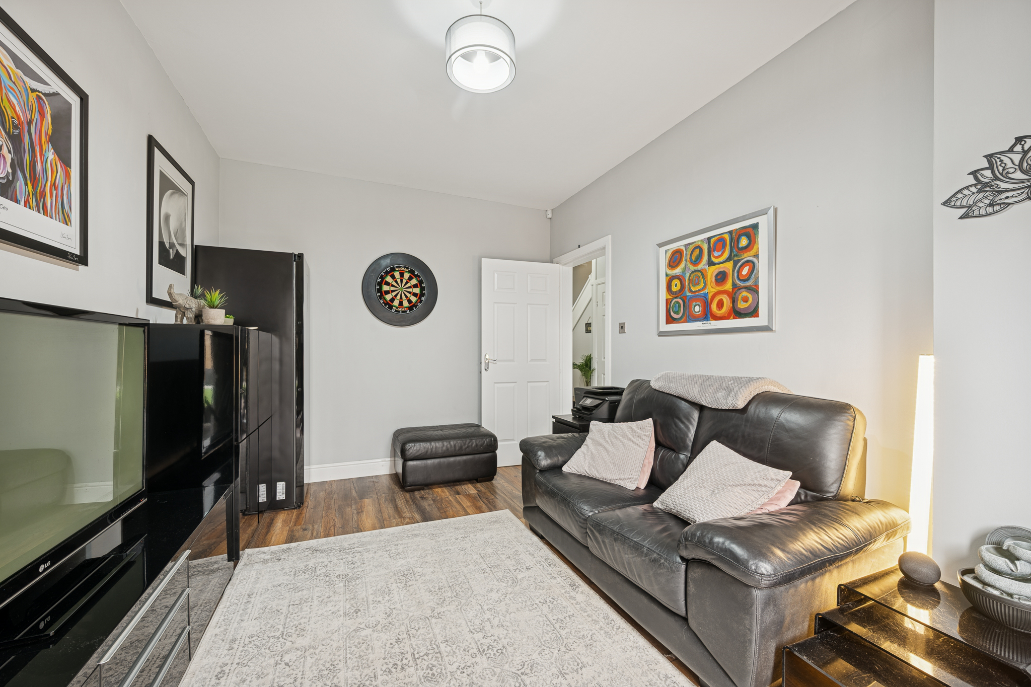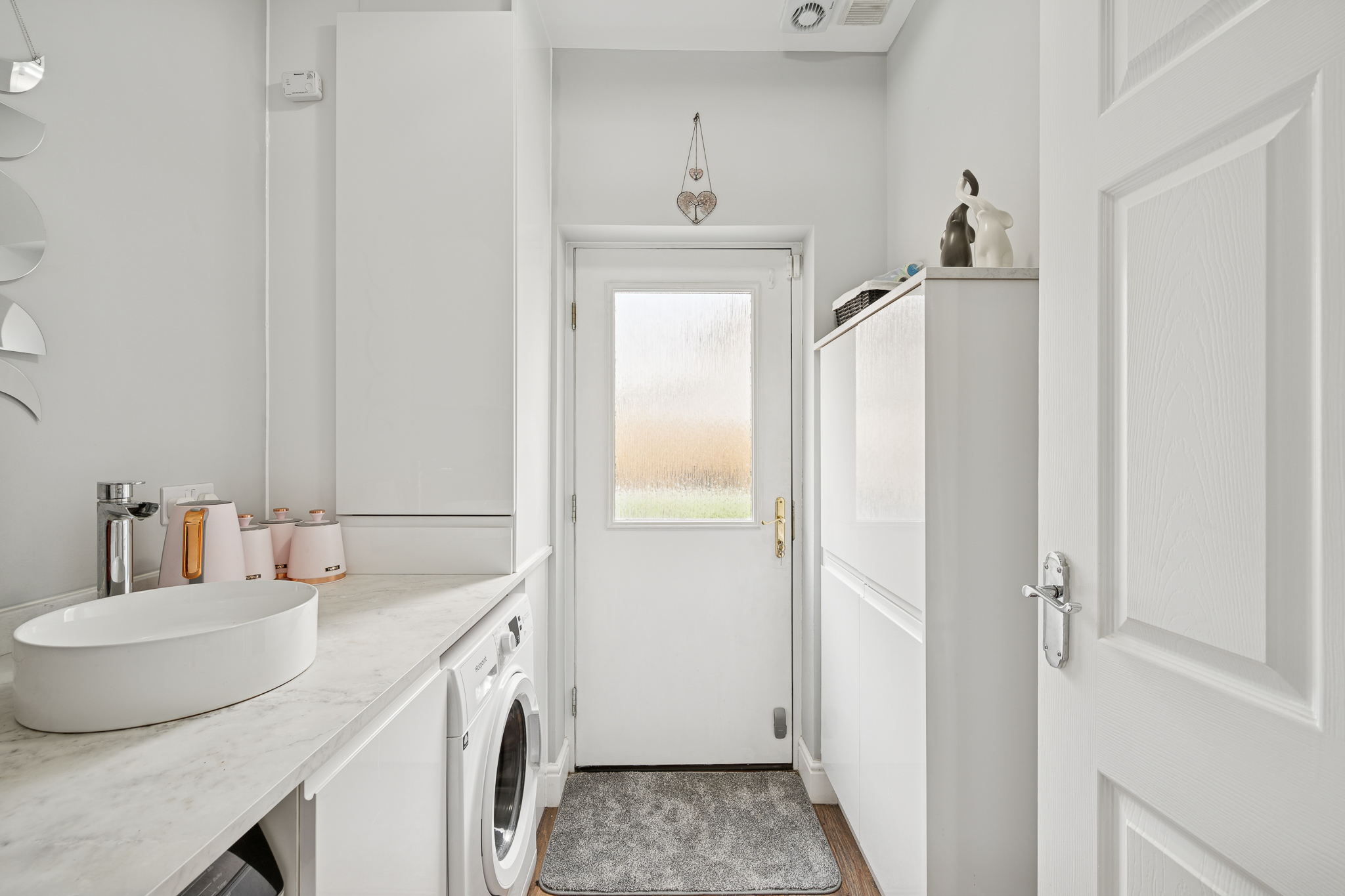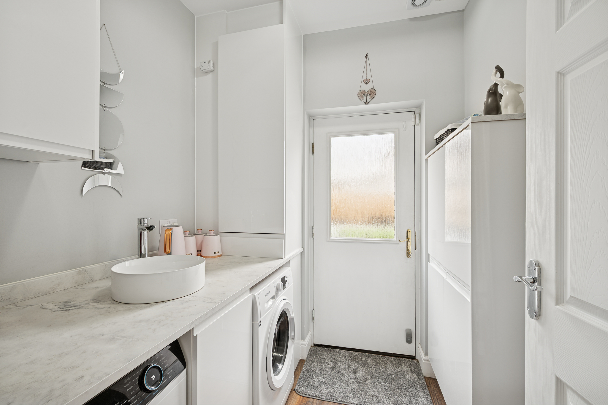 Upon entering, you’re welcomed into a bright and well kept hallway that sets the standard for the rest of the property. To the left is a stylish ground floor WC, ideal for guests and day to day convenience. Straight ahead at the end of the hallway sits a separate utility room, keeping laundry appliances discreetly tucked away and maintaining the sleek feel of the main living spaces, this room also has a door leading out to the rear garden.