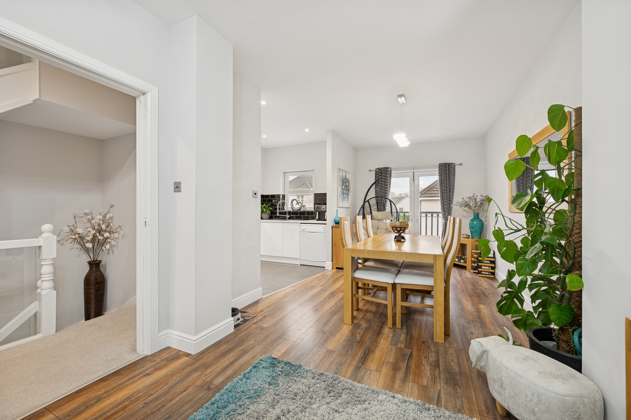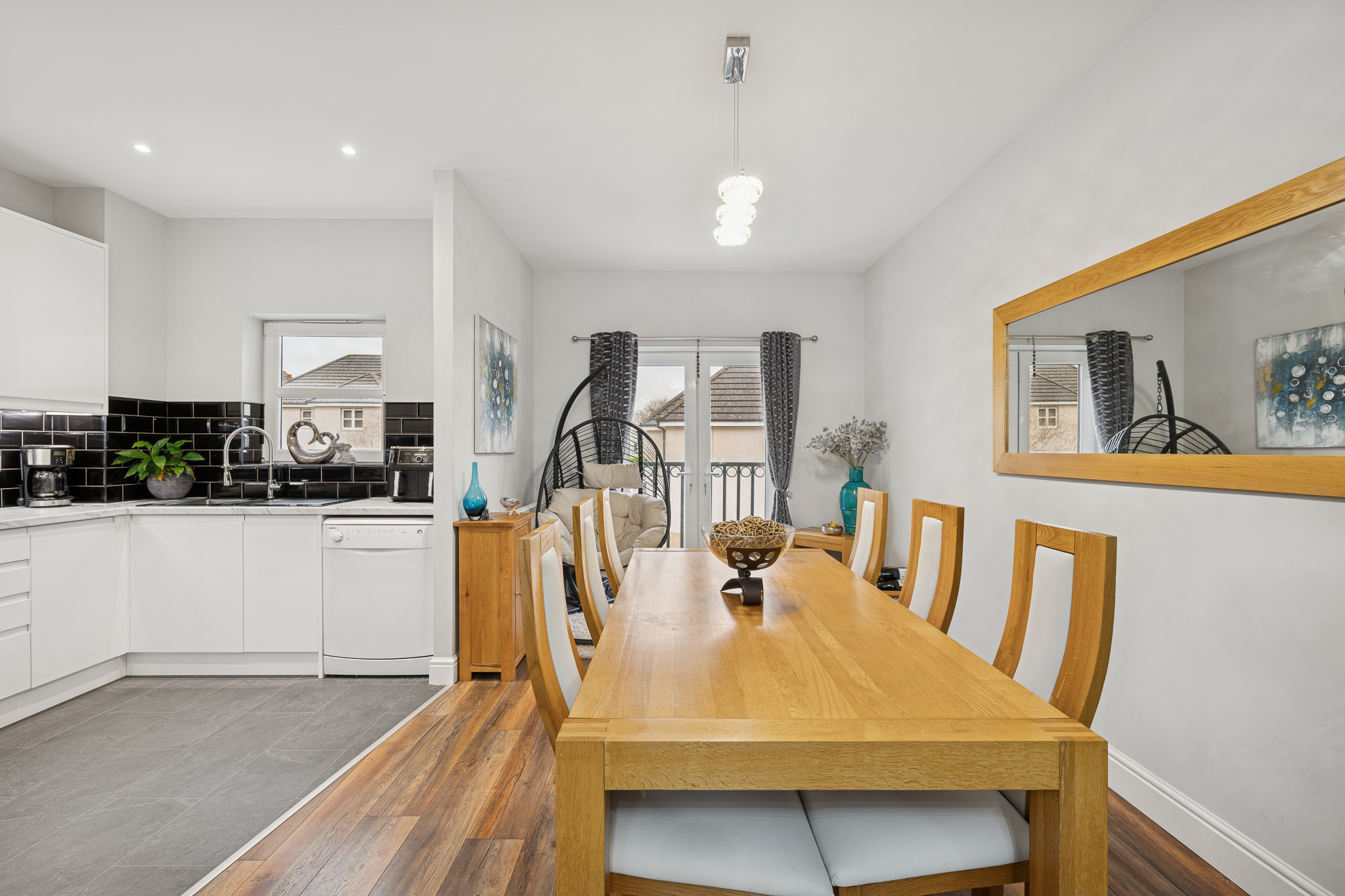 The living and dining areas on this level are bright, spacious and beautifully presented, with the wood effect flooring running seamlessly throughout to create warmth and cohesion. Large windows with a Juliet balcony allow natural light to pour in, giving the entire floor an airy, open feel that works perfectly for both relaxing evenings and social gatherings.