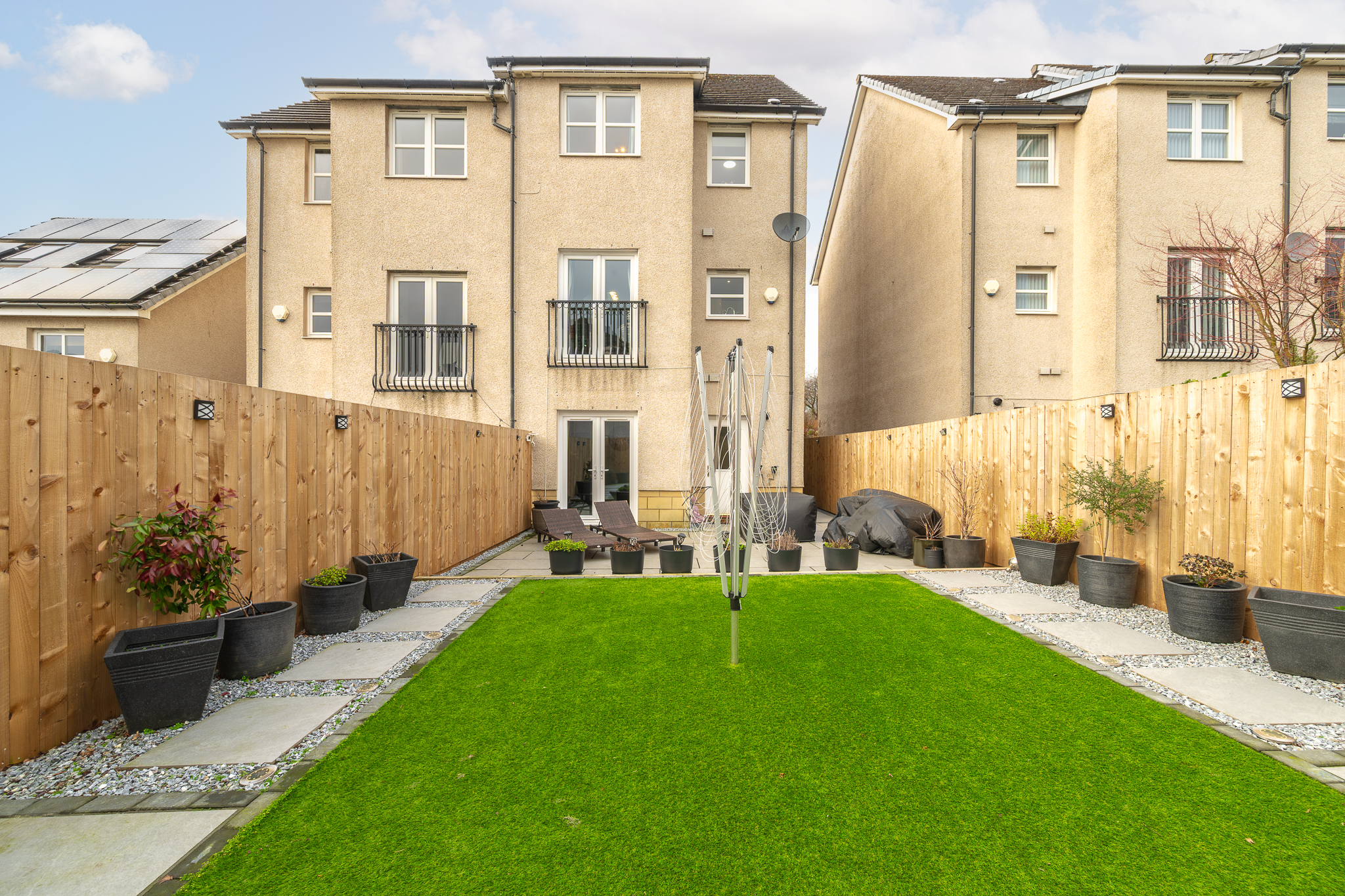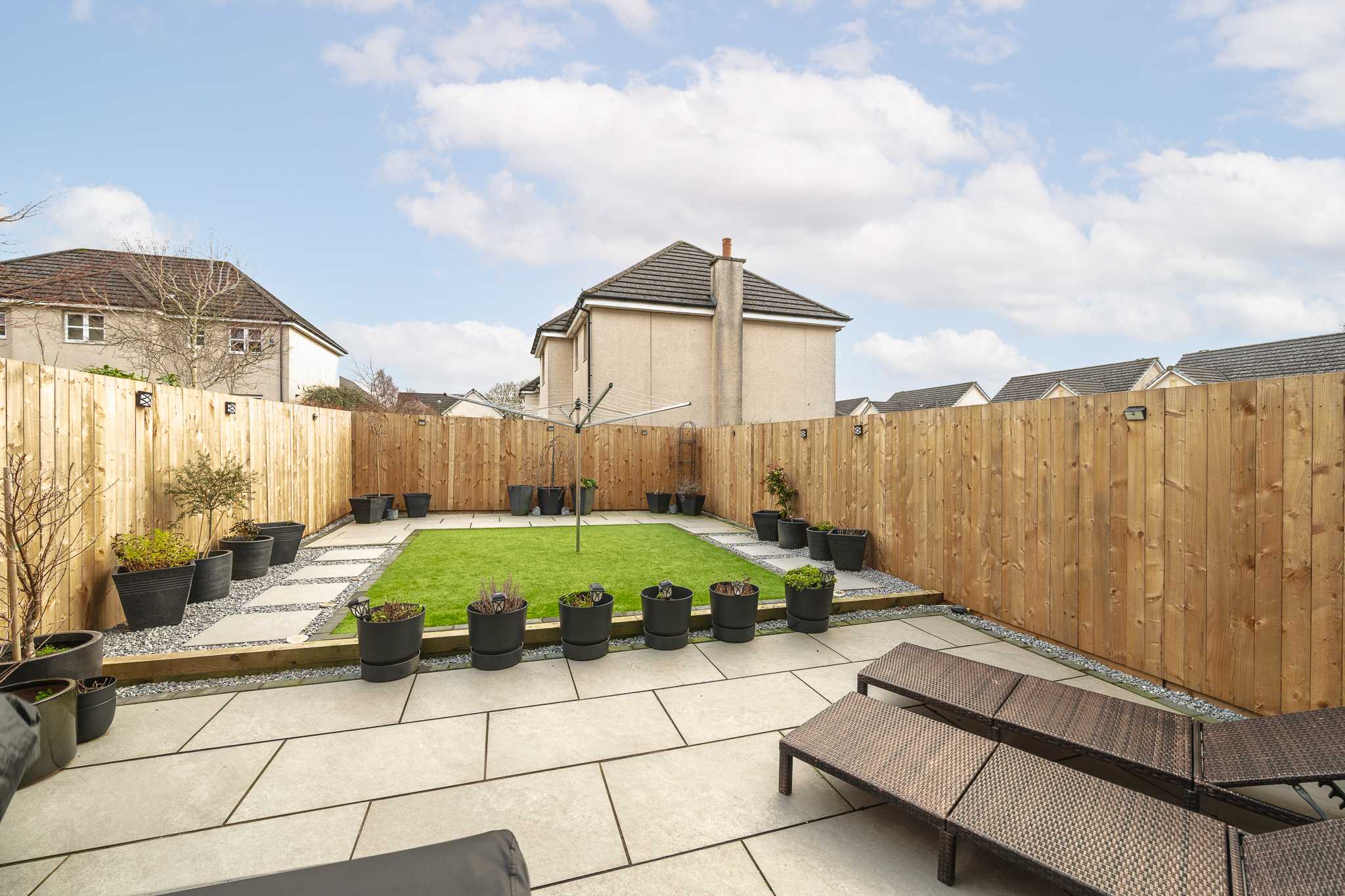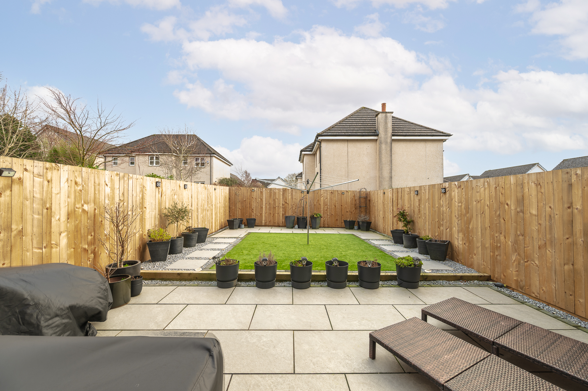The south facing rear garden has been thoughtfully landscaped with low maintenance firmly in mind, combining generous patio areas with artificial lawn and clean, modern borders. The layout offers excellent space for outdoor dining, relaxing or hosting, while remaining pleasantly private without feeling enclosed or overlooked.