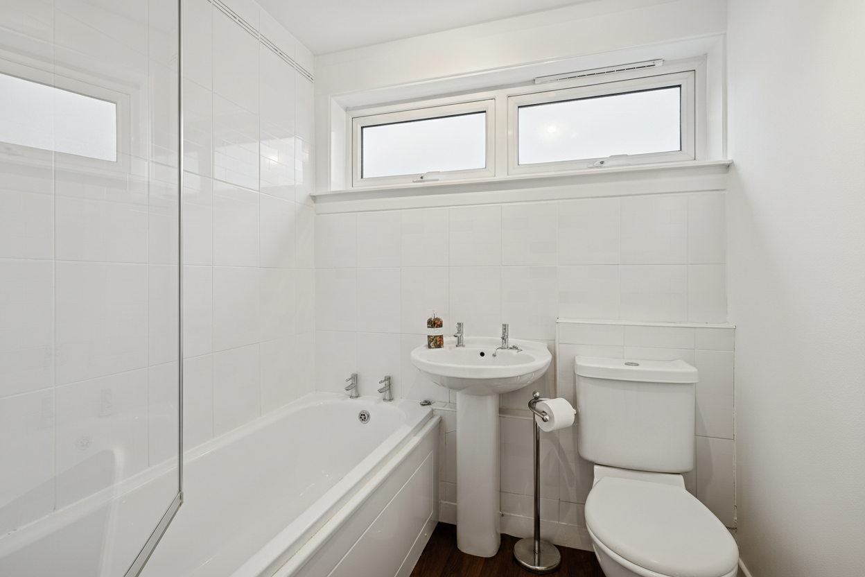 The family bathroom is clean, modern and ready for immediate use, featuring a dark brown vinyl floor which contrasts nicely with the white fittings and tiled splashbacks. It includes a WC, sink and a shower over the bath, all presented in a bright, fresh condition.