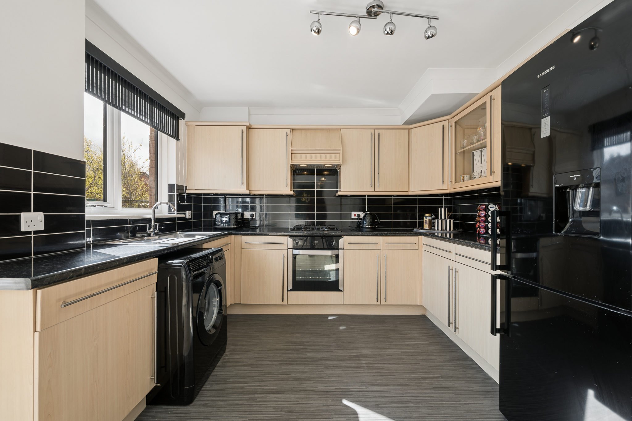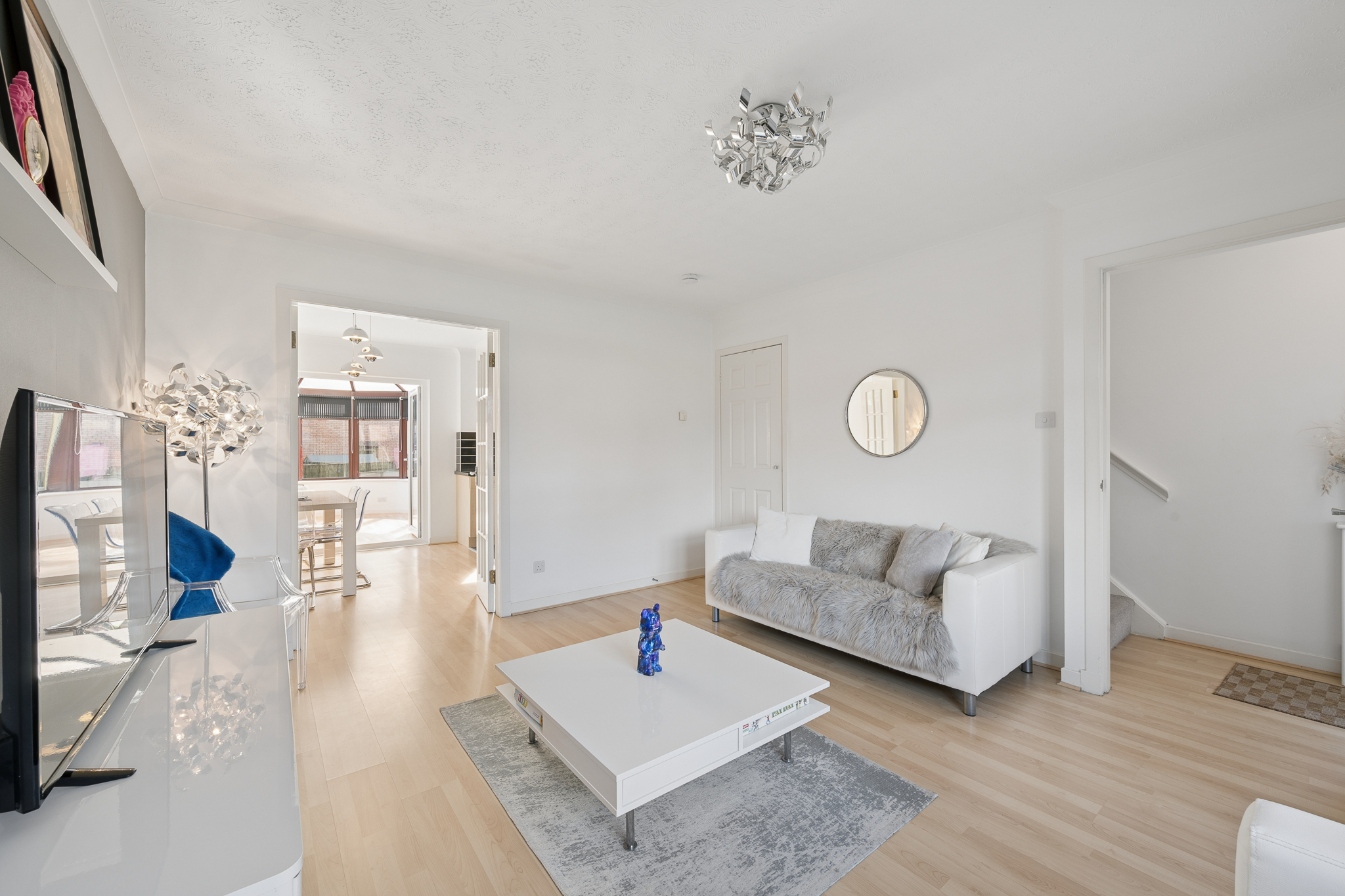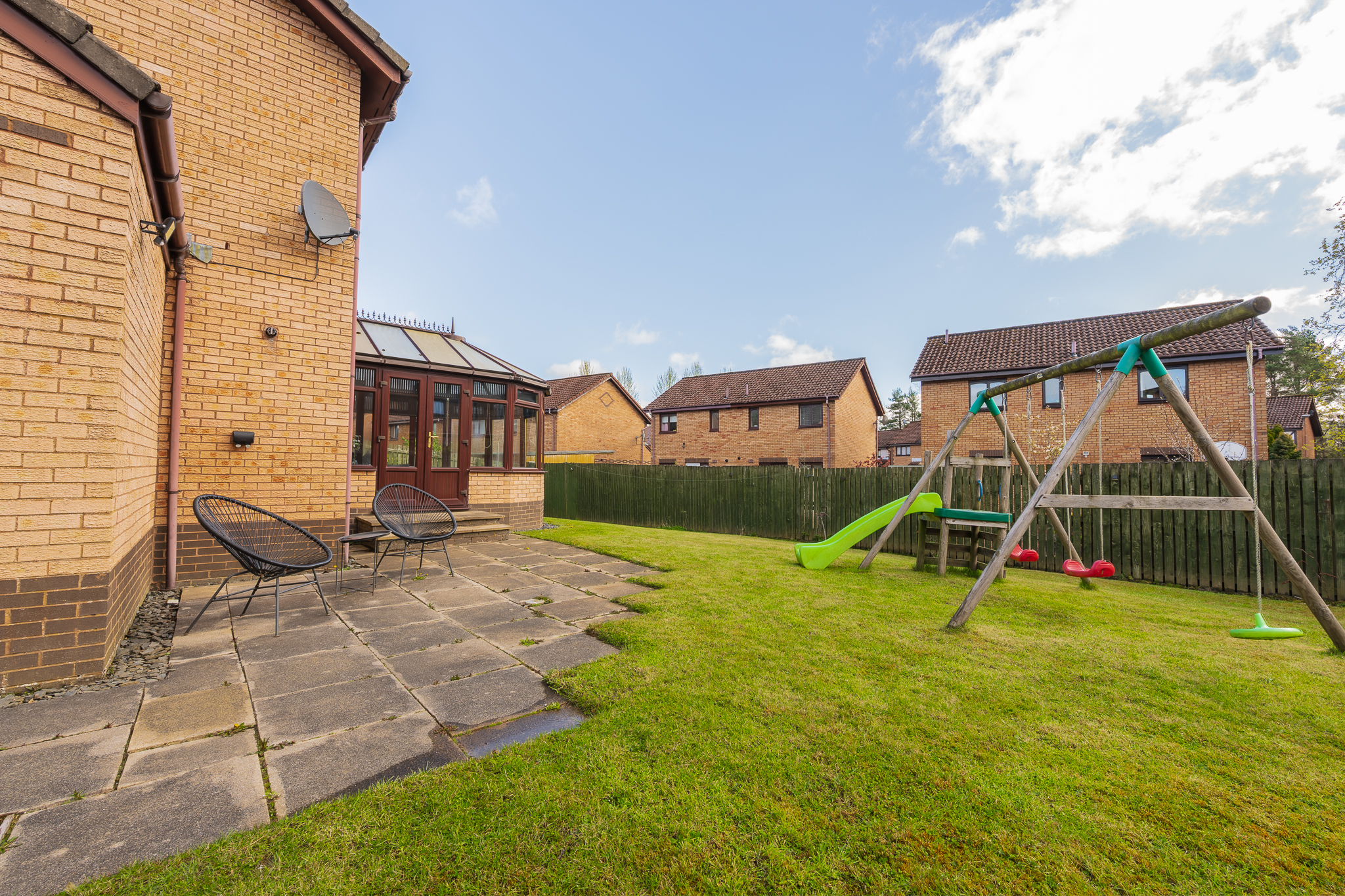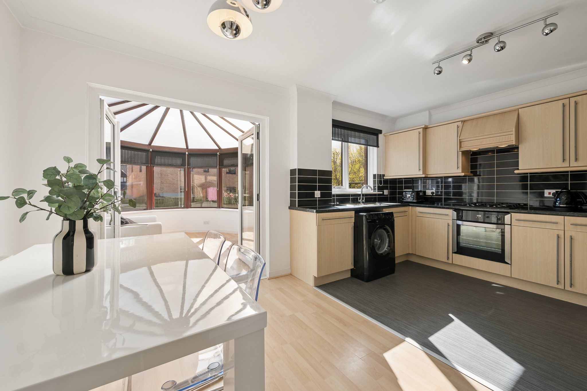 To the rear of the property is the open plan kitchen and dining area. This space comfortably accommodates a dining table for four to six people and is ideal for everyday living and entertaining. The kitchen is fitted with ample cabinetry, splashback tiling and offers space for appliances including a dishwasher, washing machine, fridge freezer and a four point gas hob with oven. Patio doors lead through to the conservatory, a bright and versatile space that can be used as a second lounge, dining area or relaxing retreat, with direct access to the rear garden.