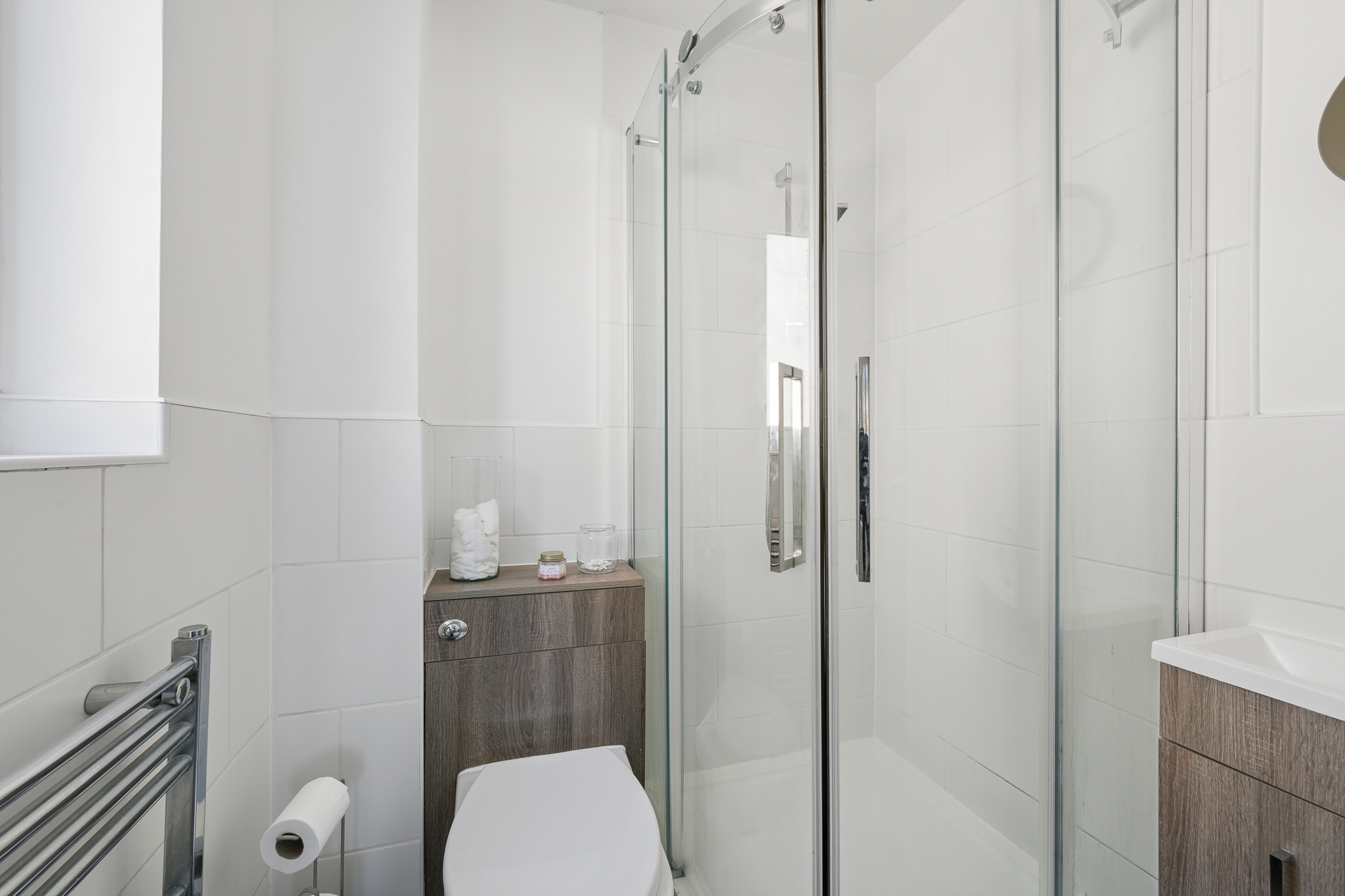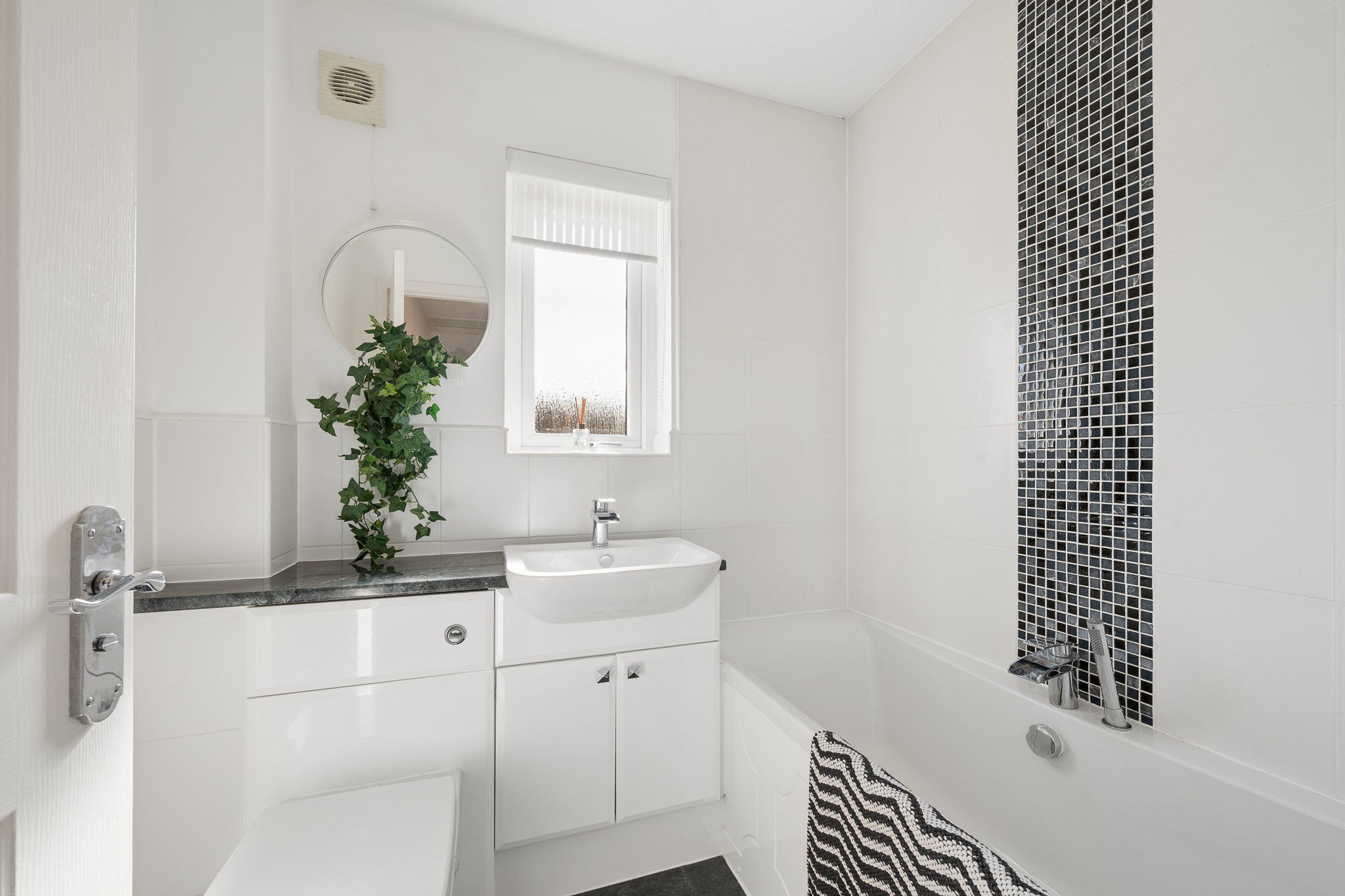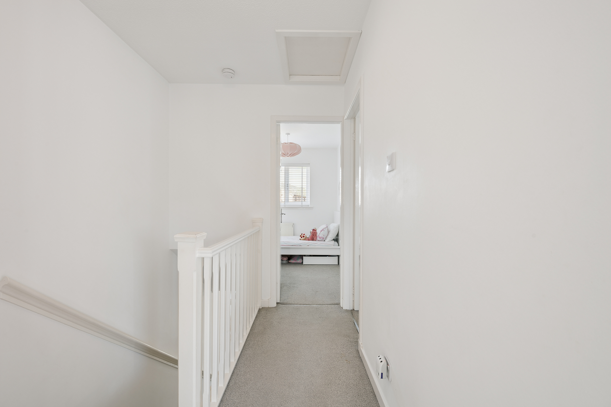 The main family bathroom is also located on the upper level and comprises a three piece suite with a bathtub and overhead shower, finished with tiling around the bath area and neutral décor.