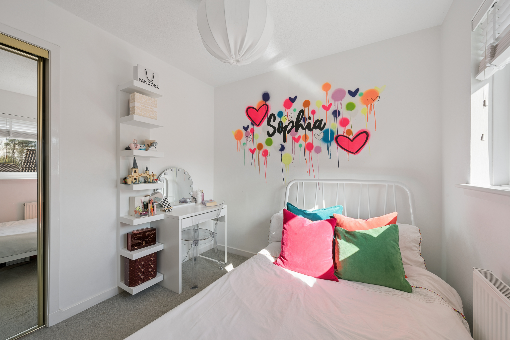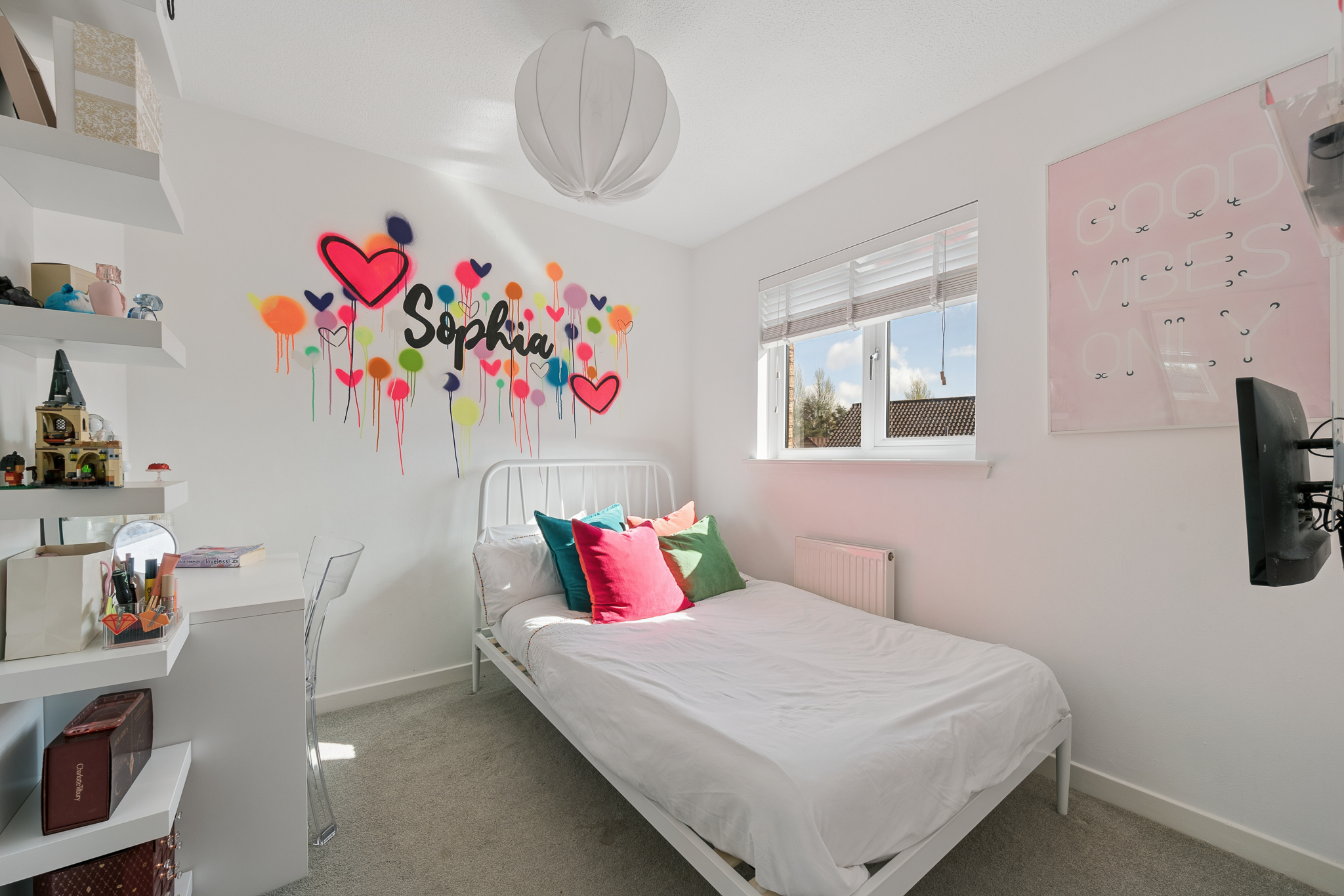 Upstairs, the property offers three well proportioned bedrooms. The principal bedroom comfortably accommodates a king size bed with bedside cabinets and benefits from a fitted wardrobe and a private ensuite shower room, comprising a three piece suite with standing shower and tiling. Bedroom two is another generous double room with a fitted wardrobe and space for additional furnishings. Bedroom three is a versatile room with a large storage cupboard, ideal as a single bedroom, home office or dressing room.