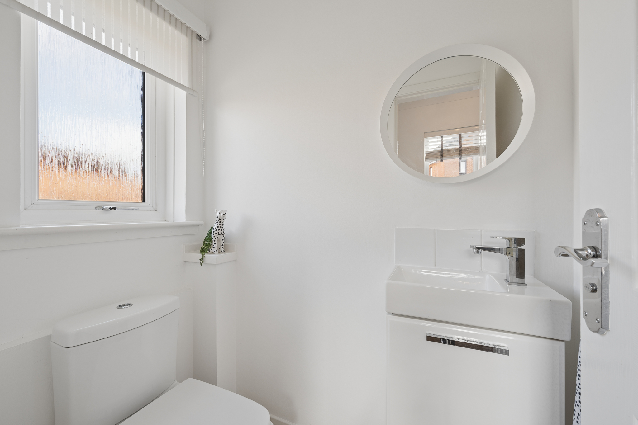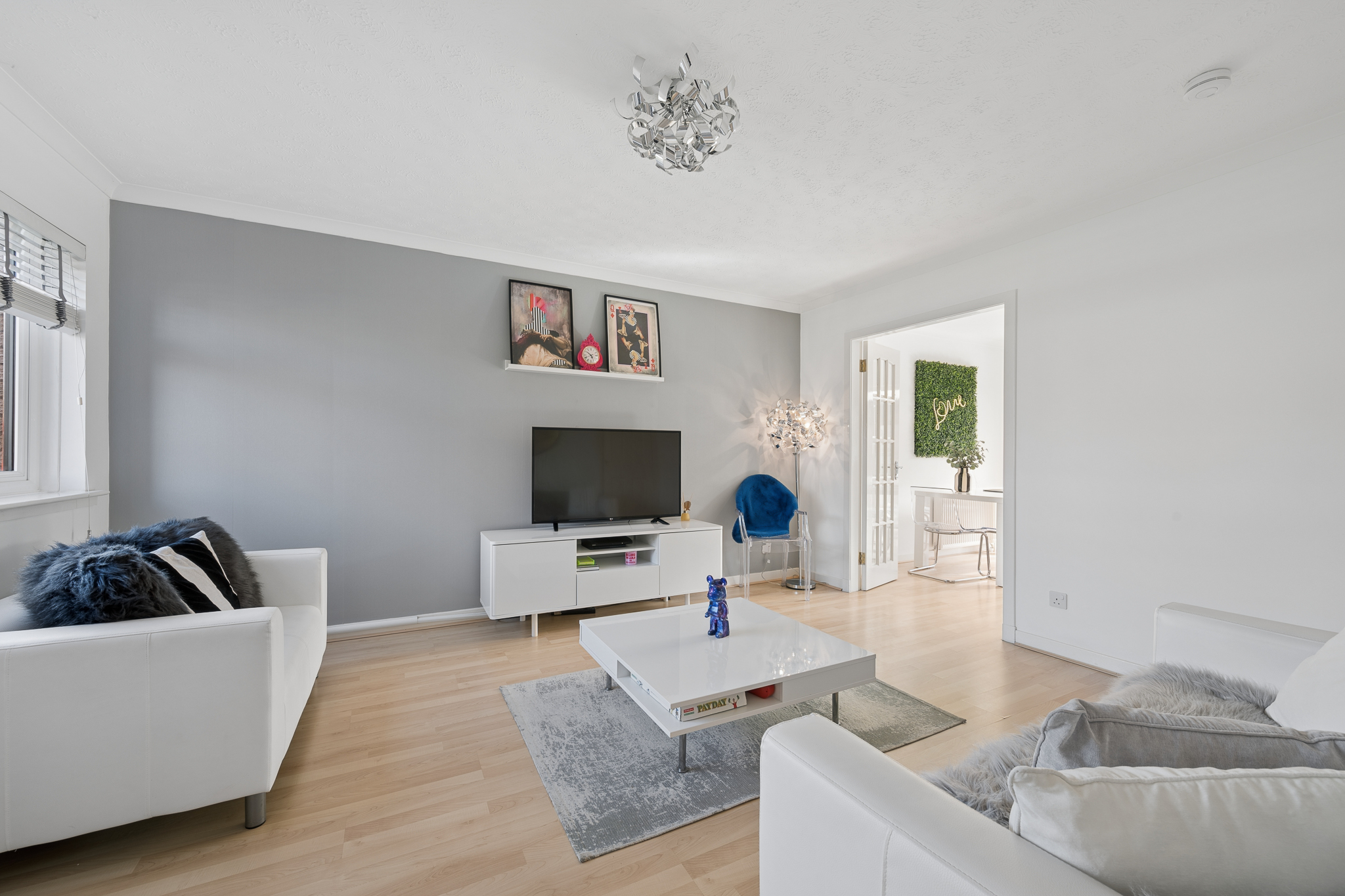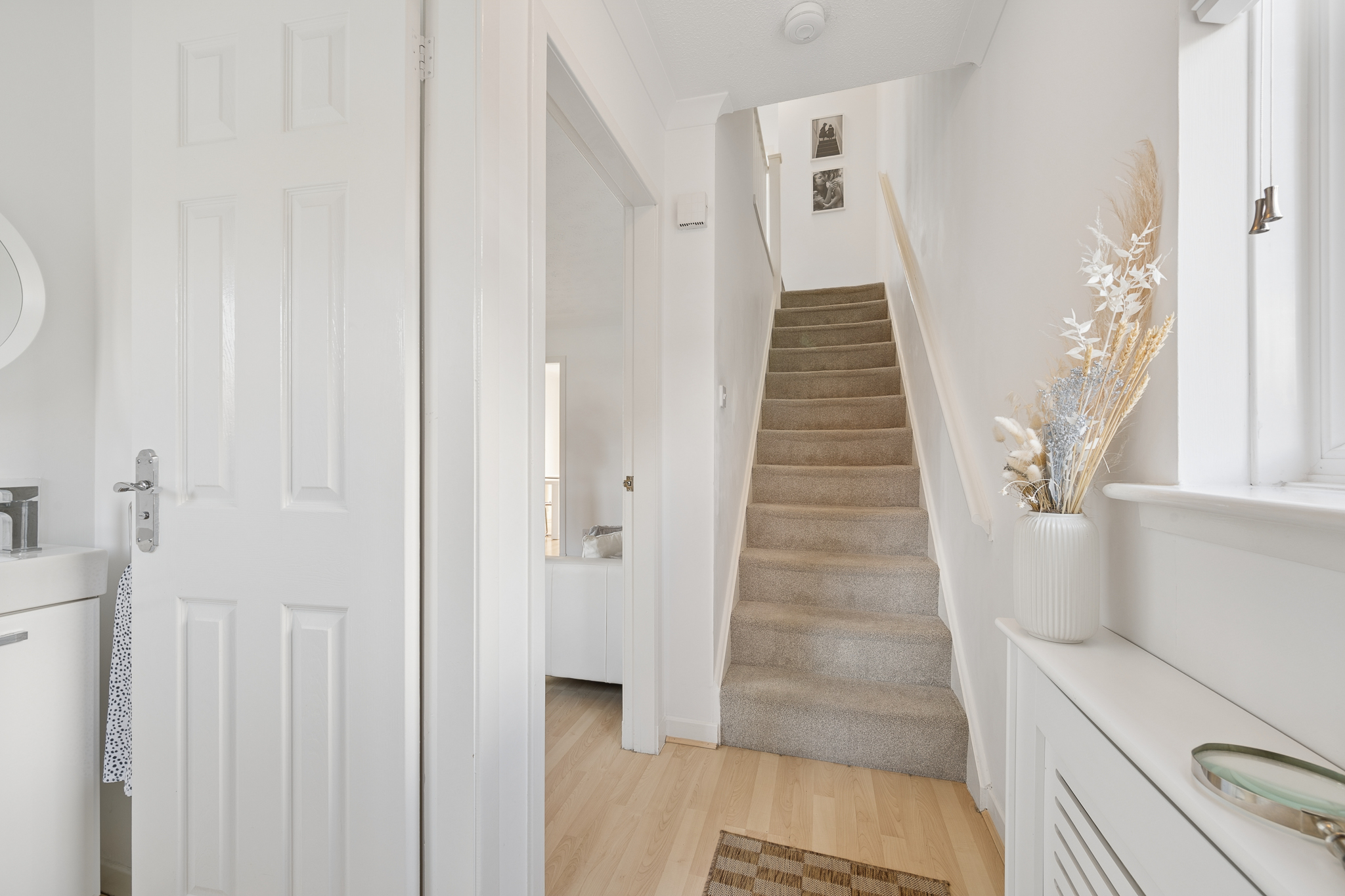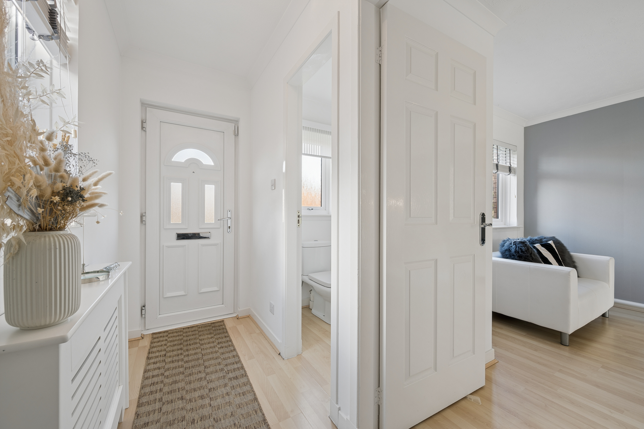 Upon entering, you are welcomed into a bright and spacious hallway. Positioned to the left hand side is the downstairs WC, fitted with a two piece suite. Further along the hallway, also to the left, is the lounge, a comfortable and well proportioned space that easily accommodates two large sofas along with a media wall. A large front facing window allows plenty of natural light to fill the room, while a useful storage cupboard is located underneath the stairs.