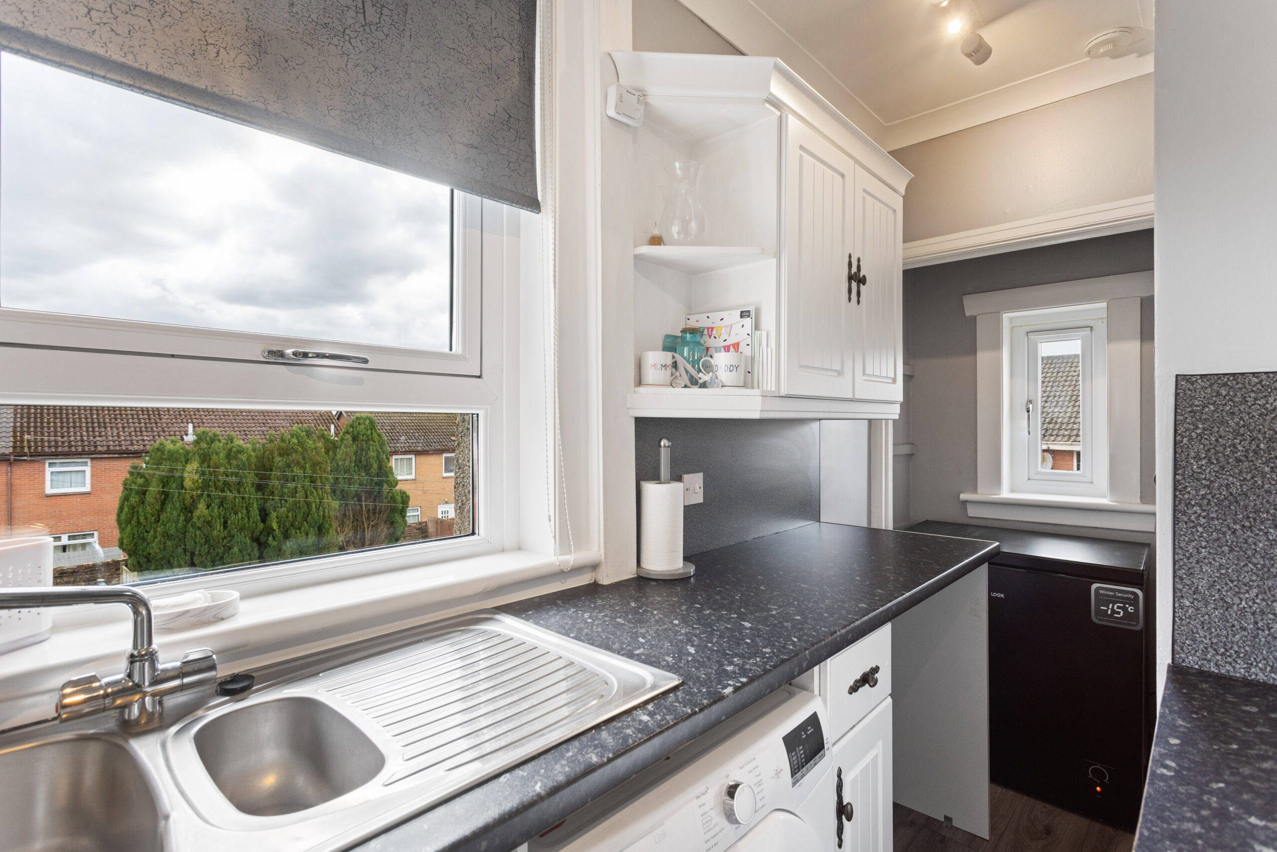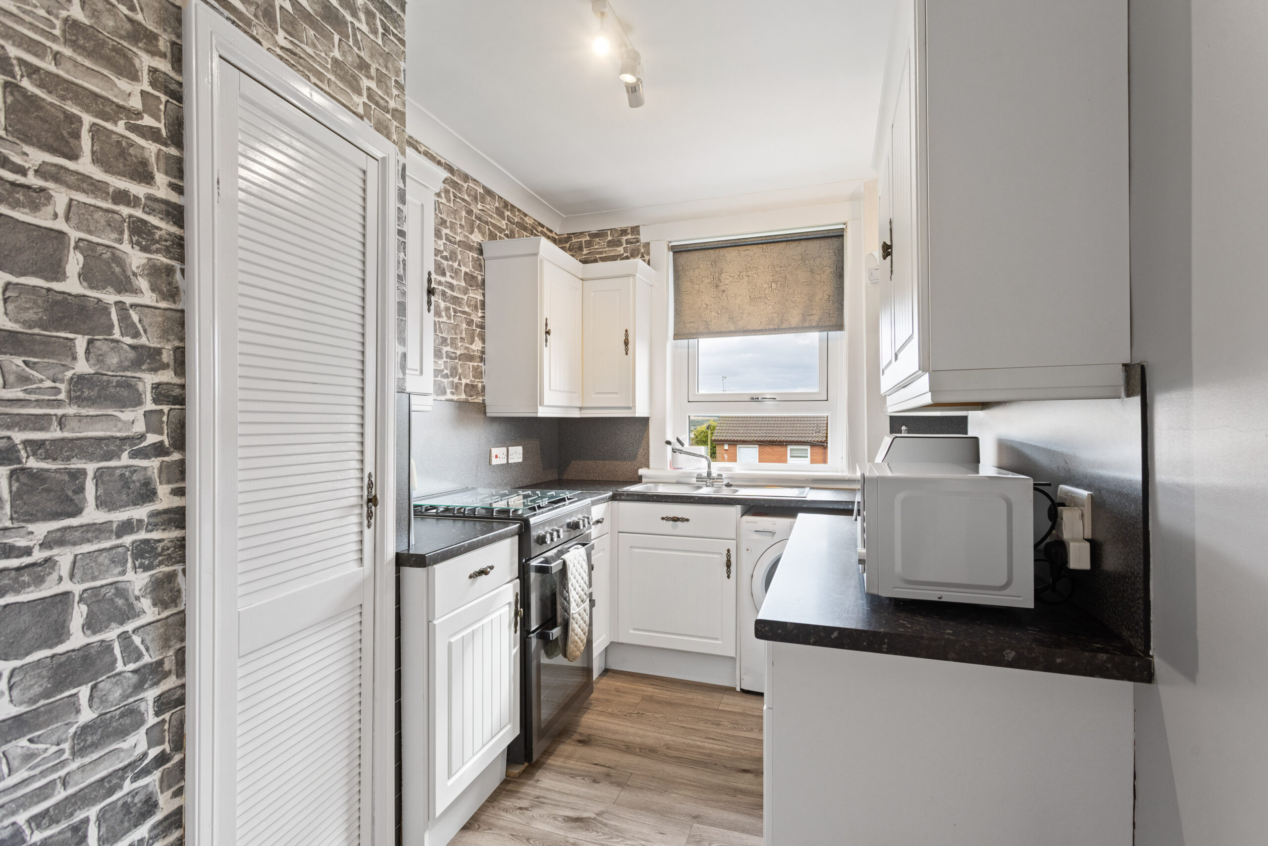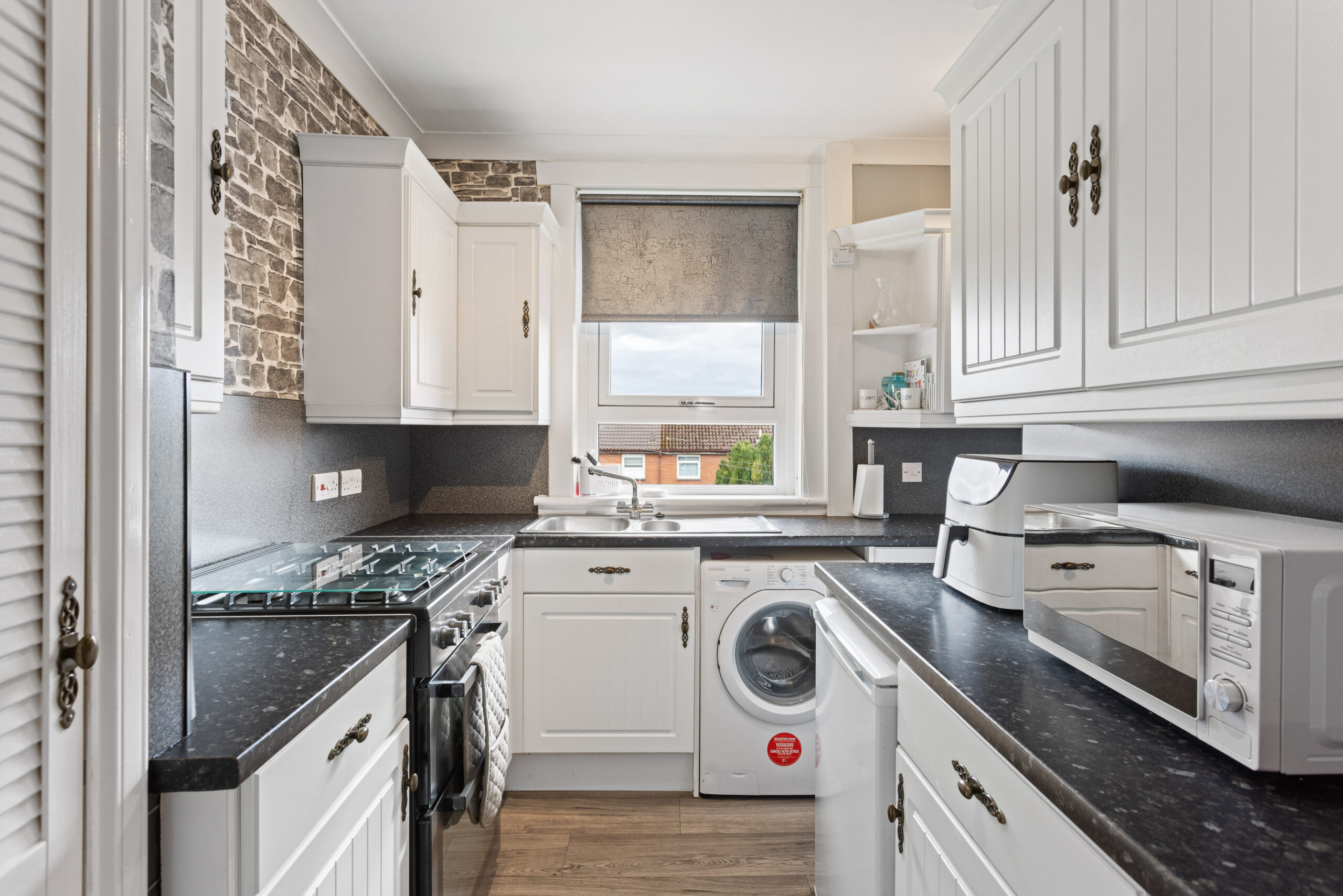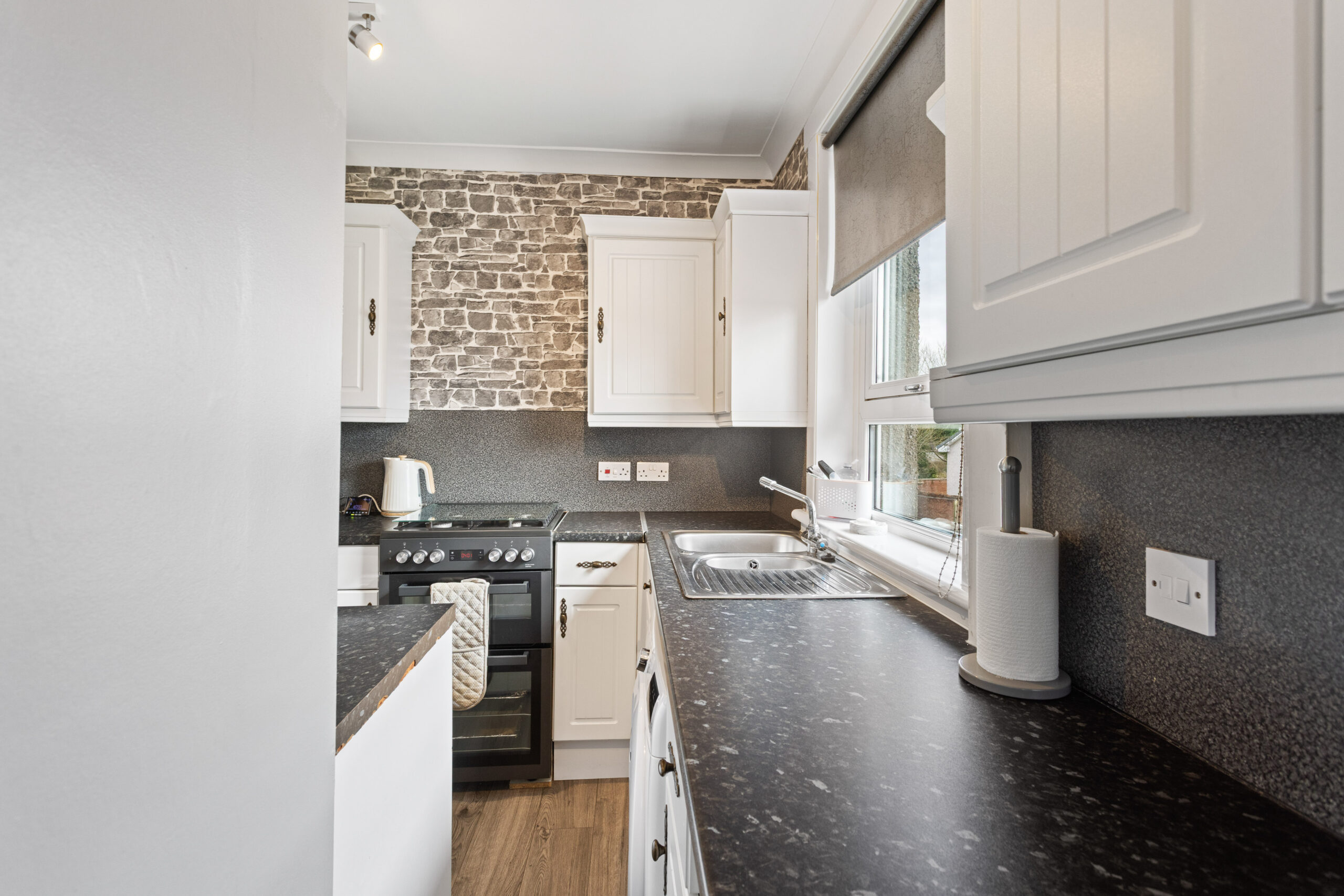 The kitchen is sleek and well appointed, featuring a range of white shaker style wall and base units complemented by dark stone effect worktops. A combination of brick style wallpaper and modern splashback finishes adds character and texture, while ample worktop space make it highly practical for everyday use. A large window above the sink allows natural light to flood the space, further enhancing its bright and functional design.