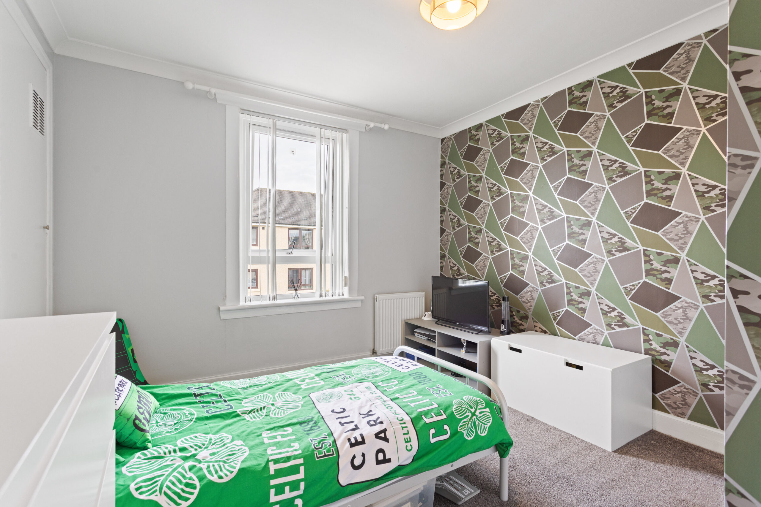 To the rear of the property, the living room is a standout space, beautifully presented with contemporary laminate flooring and a modern, neutral colours. A striking geometric feature wall frames a stylish fireplace, creating a natural focal point within the room, while large windows allow for an abundance of natural light, enhancing the bright and airy feel. This is an ideal space for both relaxing and entertaining.