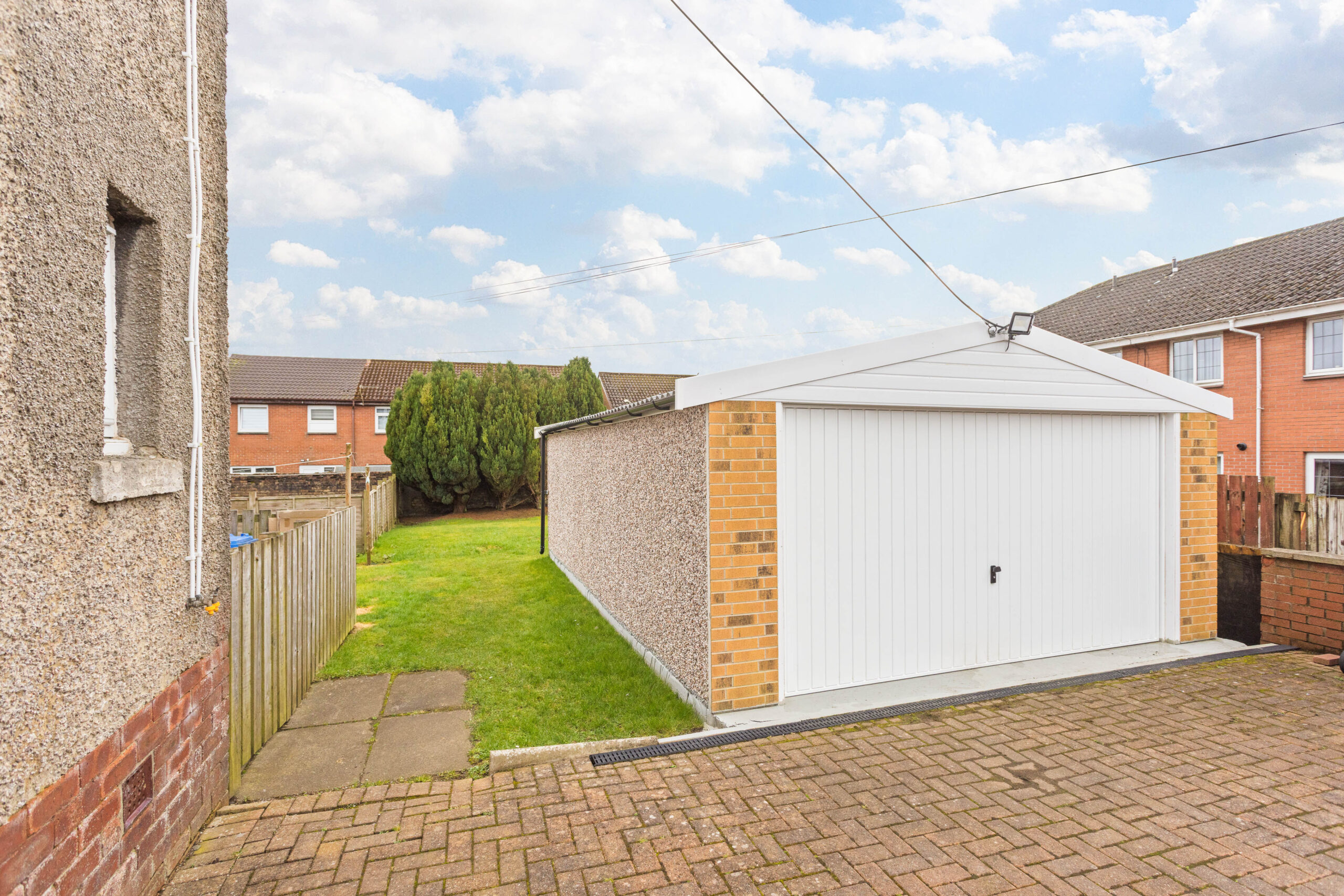 To the front, there is a well maintained monoblock driveway offering ample off street parking. A significant addition to the property is the large detached garage, which is fully equipped with power, multiple sockets and strip lighting, making it perfect for a workshop, storage or secure parking. The garage also benefits from both a main up and over door and a convenient rear access door.