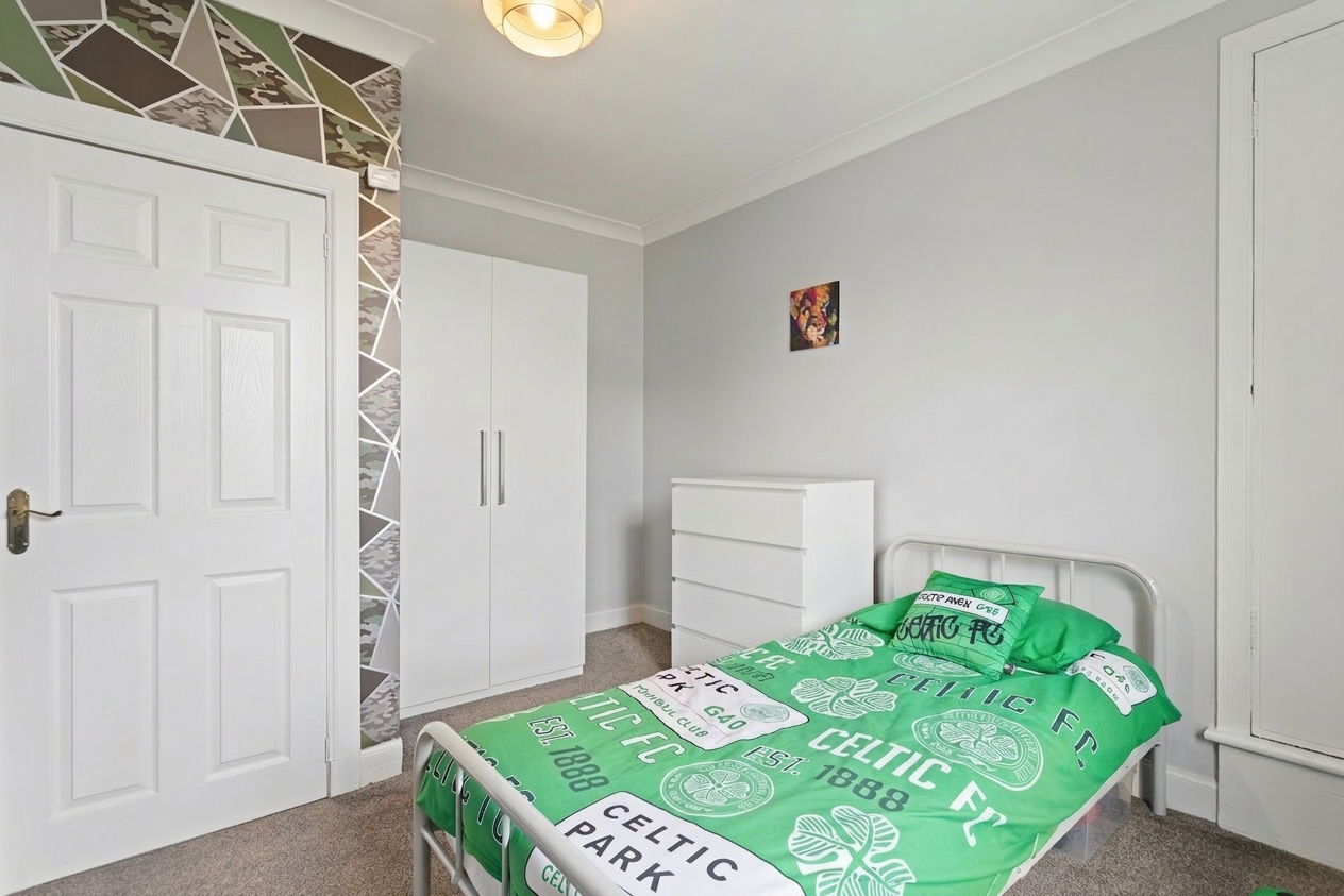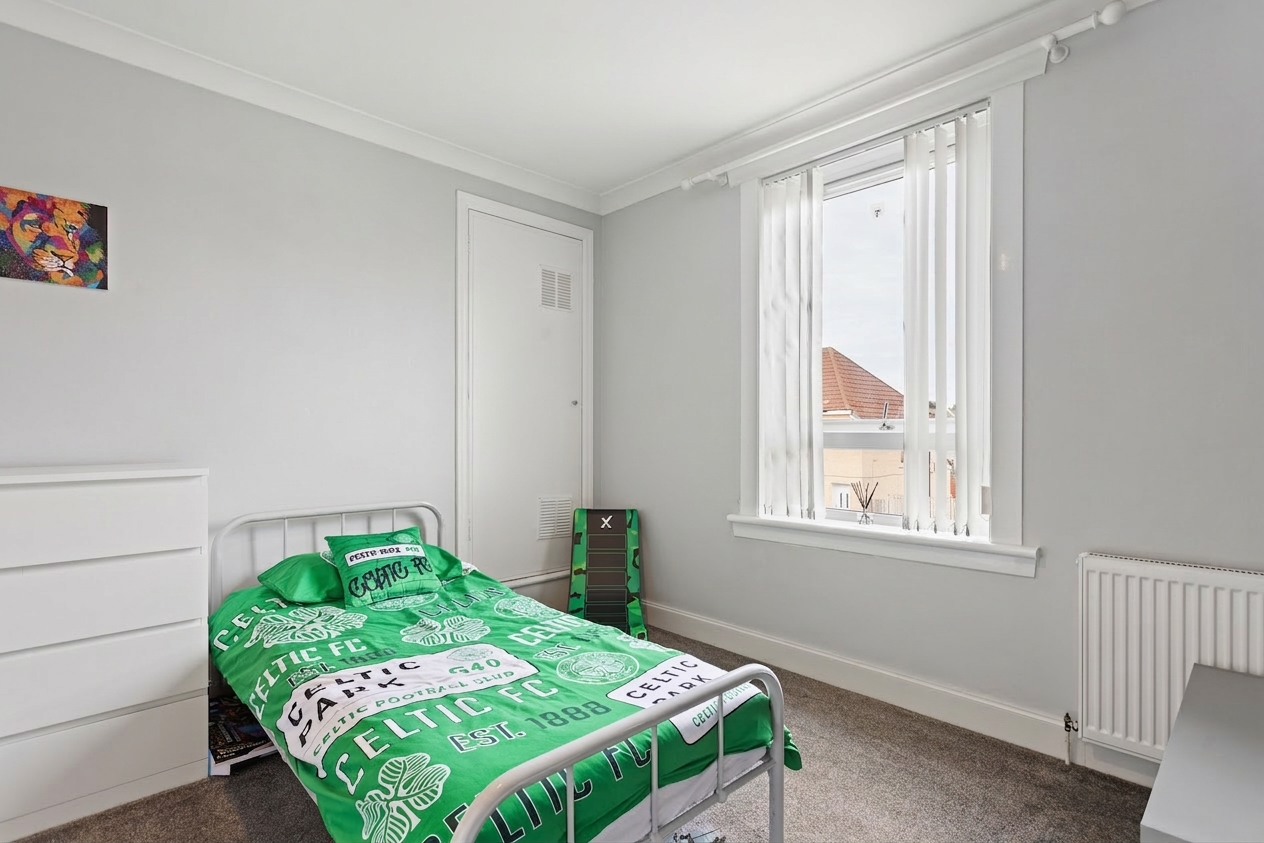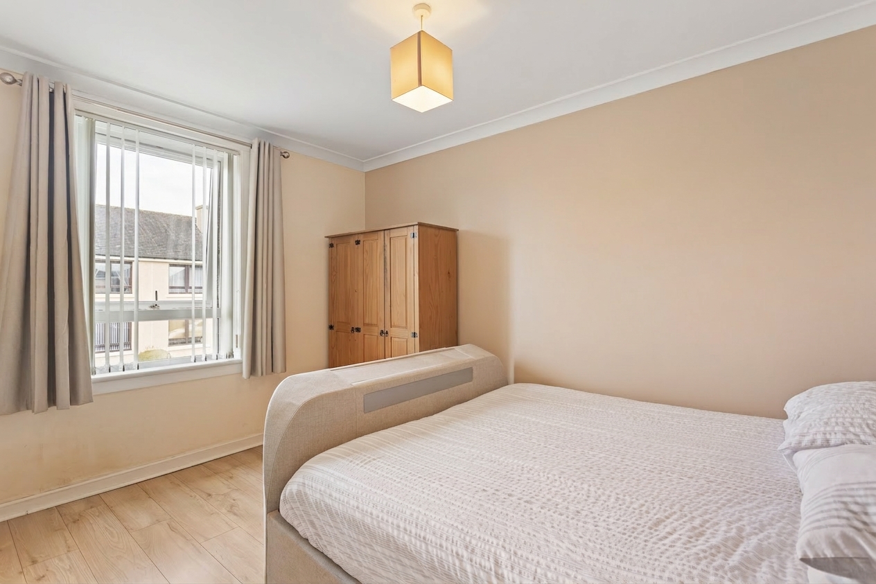 Both bedrooms are well proportioned and continue the home’s modern aesthetic. The principal bedroom is finished with wood effect flooring and neutral tones, offering a calm and comfortable retreat, while the second bedroom is equally well presented with soft carpeting and built-in storage, making it ideal as a guest room, child’s bedroom or home office.