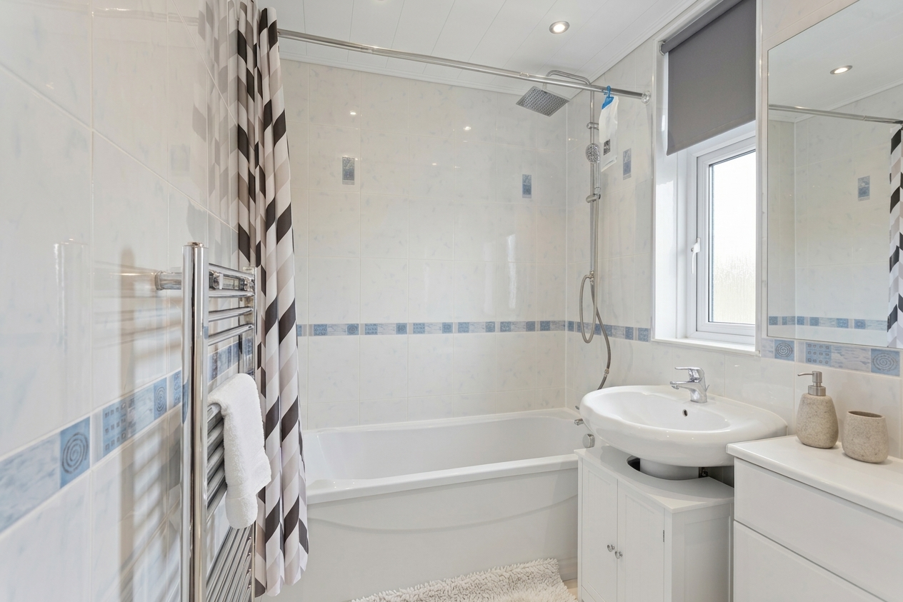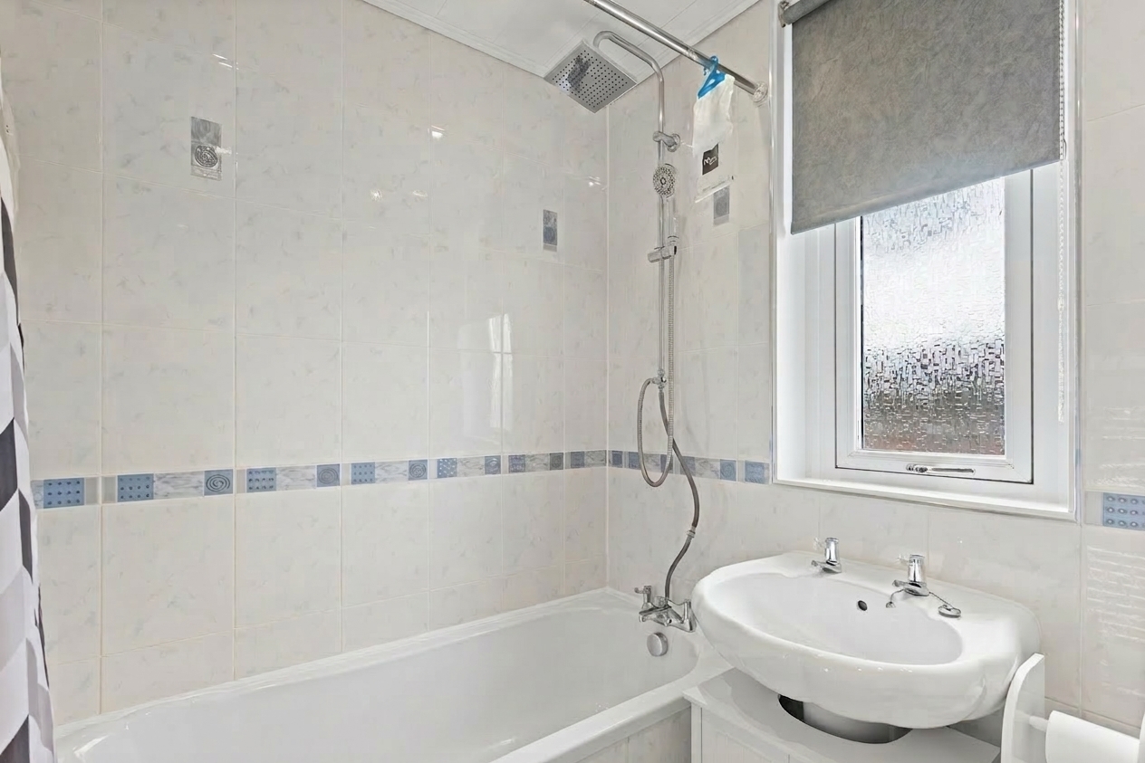 The bathroom is finished in a clean, contemporary style, with full height tiling, a modern suite including bath with overhead rainfall shower, wash hand basin and WC. Additional features such as a heated towel rail, recessed lighting, and a frosted window provide both comfort and privacy.