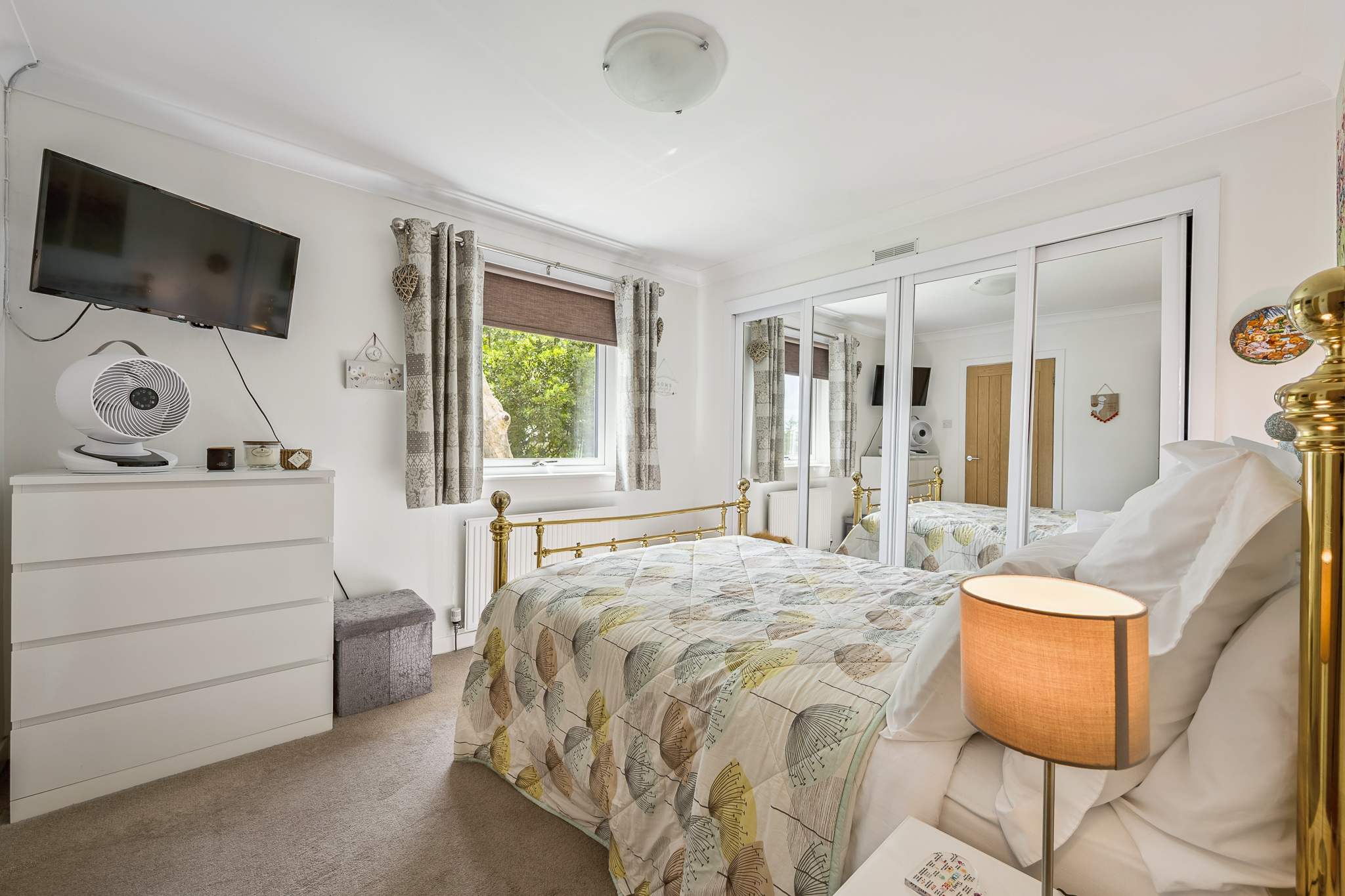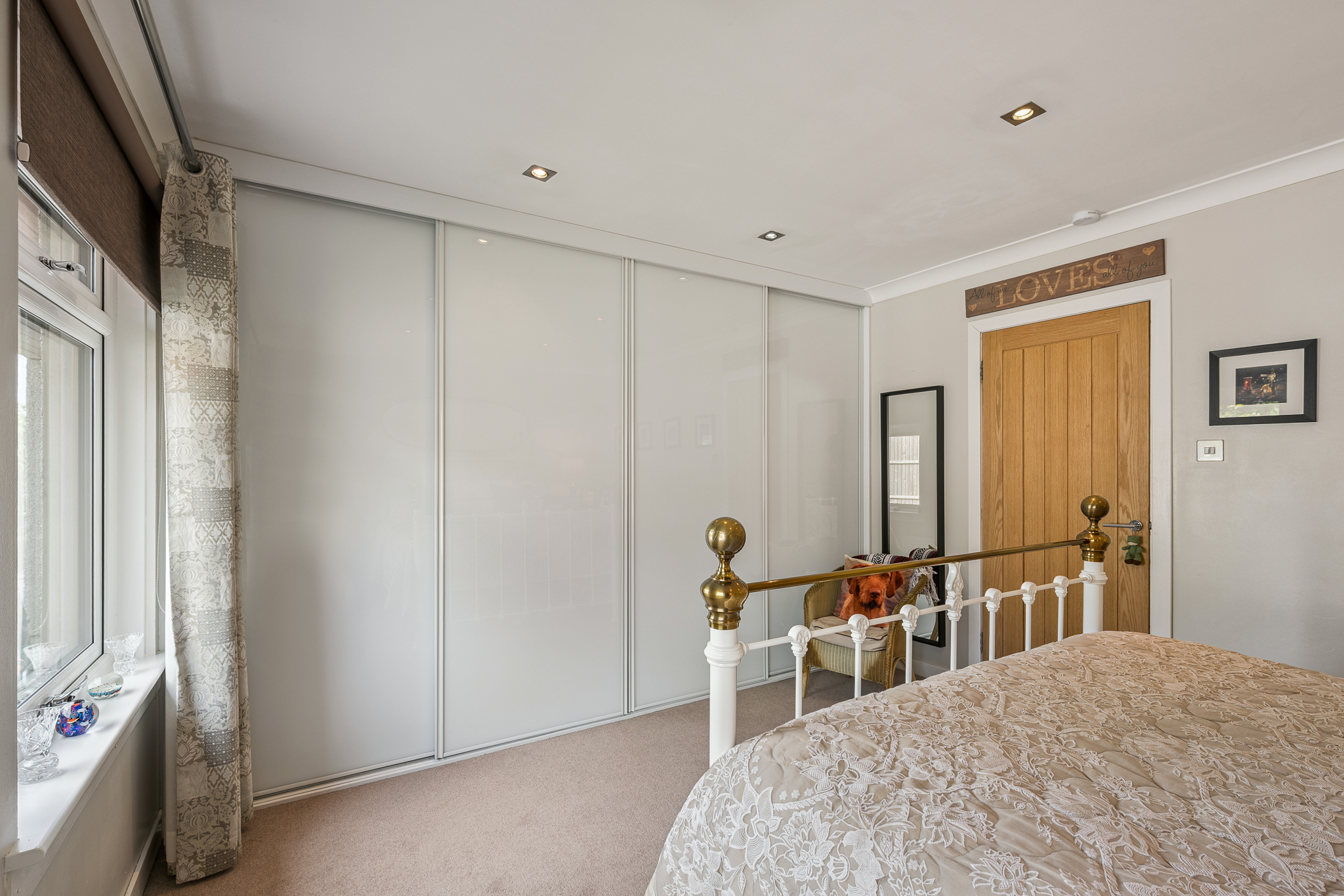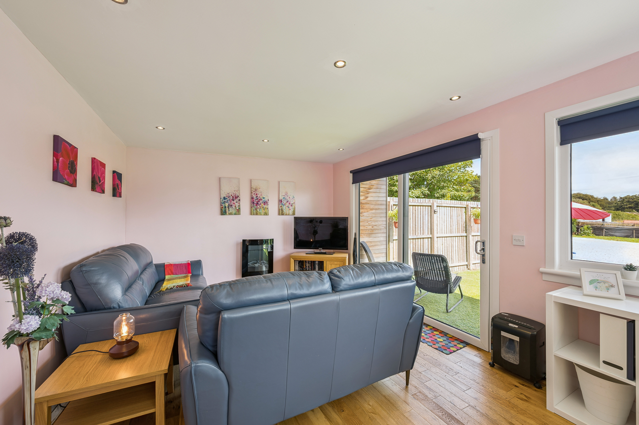 A substantial storage cupboard at the end of the hall ensures day-to-day organisation is effortless. Bedroom One, positioned at the end of the hallway and to the front of the property, is a wonderfully spacious retreat, currently accommodating a king-size bed and featuring two sets of integrated double wardrobes. Beyond the main home, the property’s outdoor offering is equally impressive. The landscaped rear garden has been thoughtfully designed for entertaining, with breath-taking open views, plenty of seating areas, and space for gatherings. A recently added summer house, complete with electricity and internet, provides the ideal work-from-home office, creative studio, or even a stylish garden bar for summer parties. Additional features include triple glazing for comfort and energy efficiency, as well as solar panels to help reduce running costs.