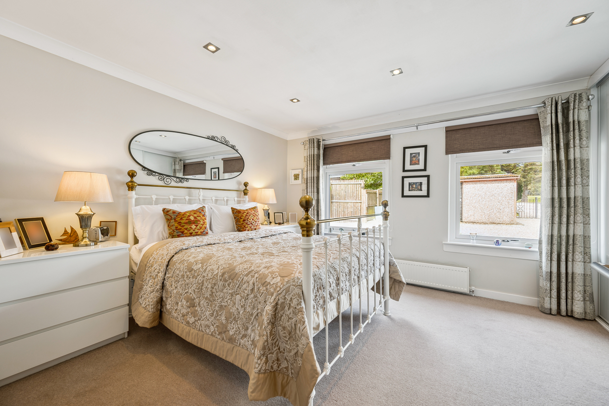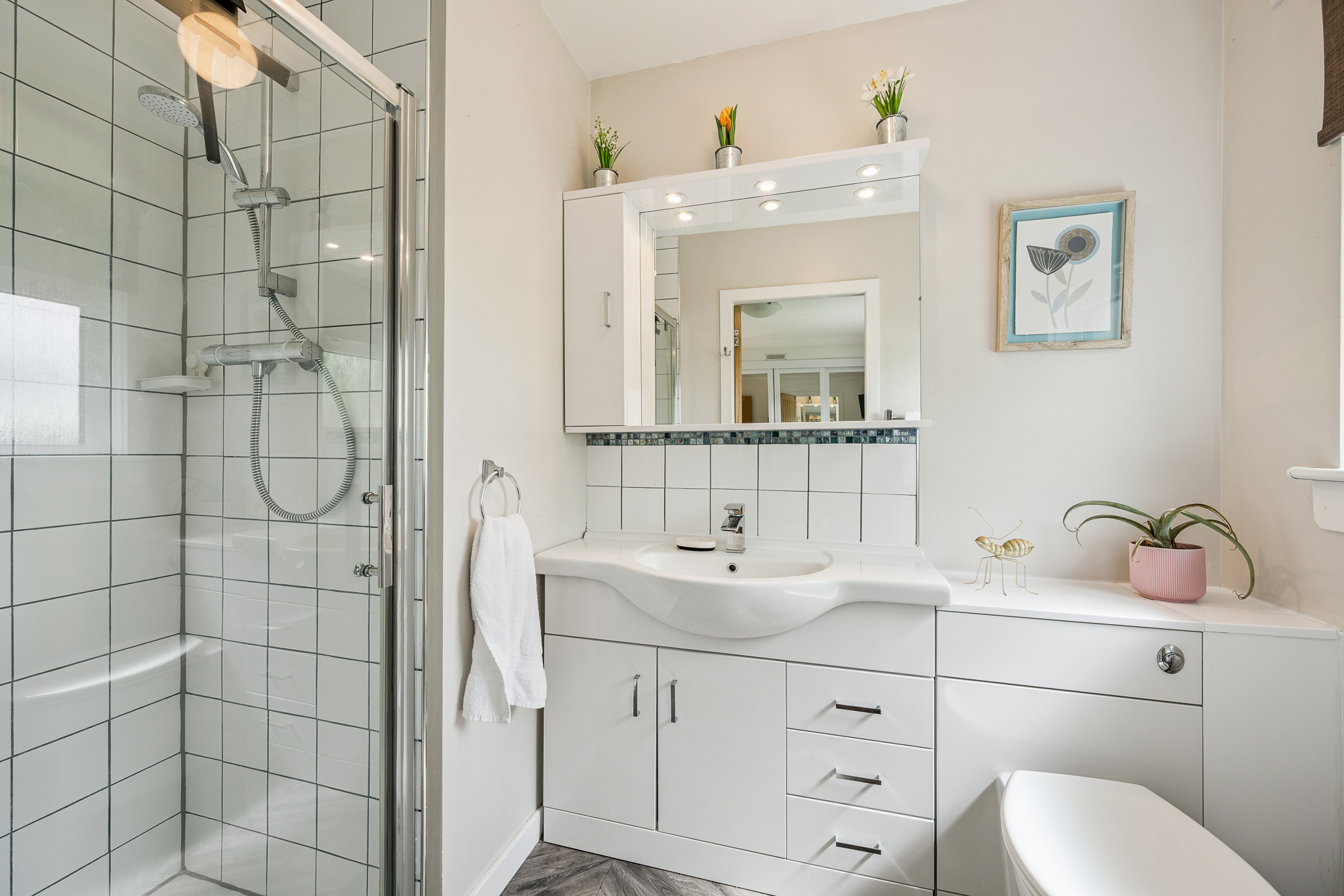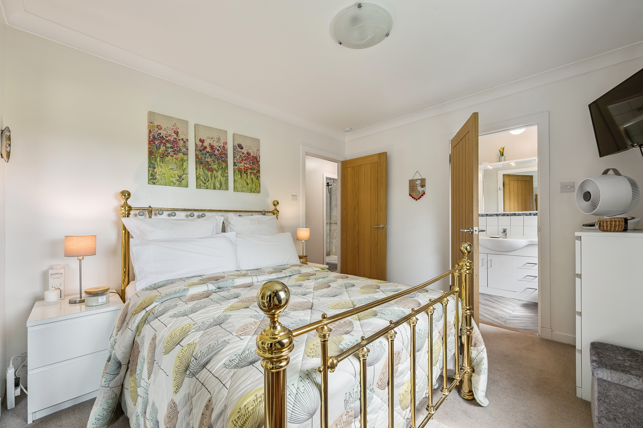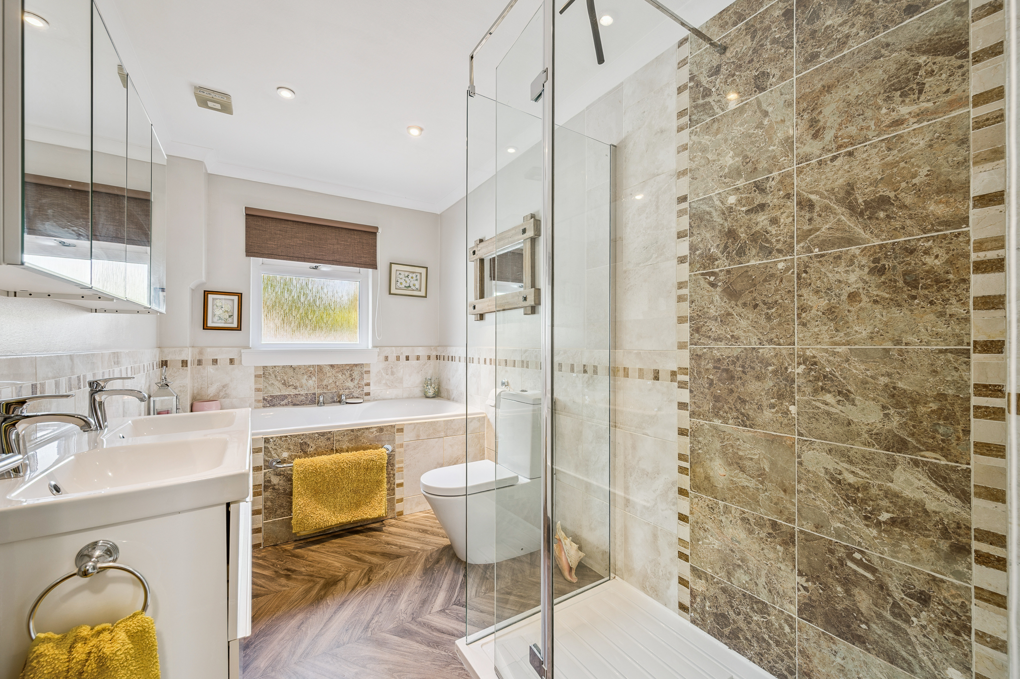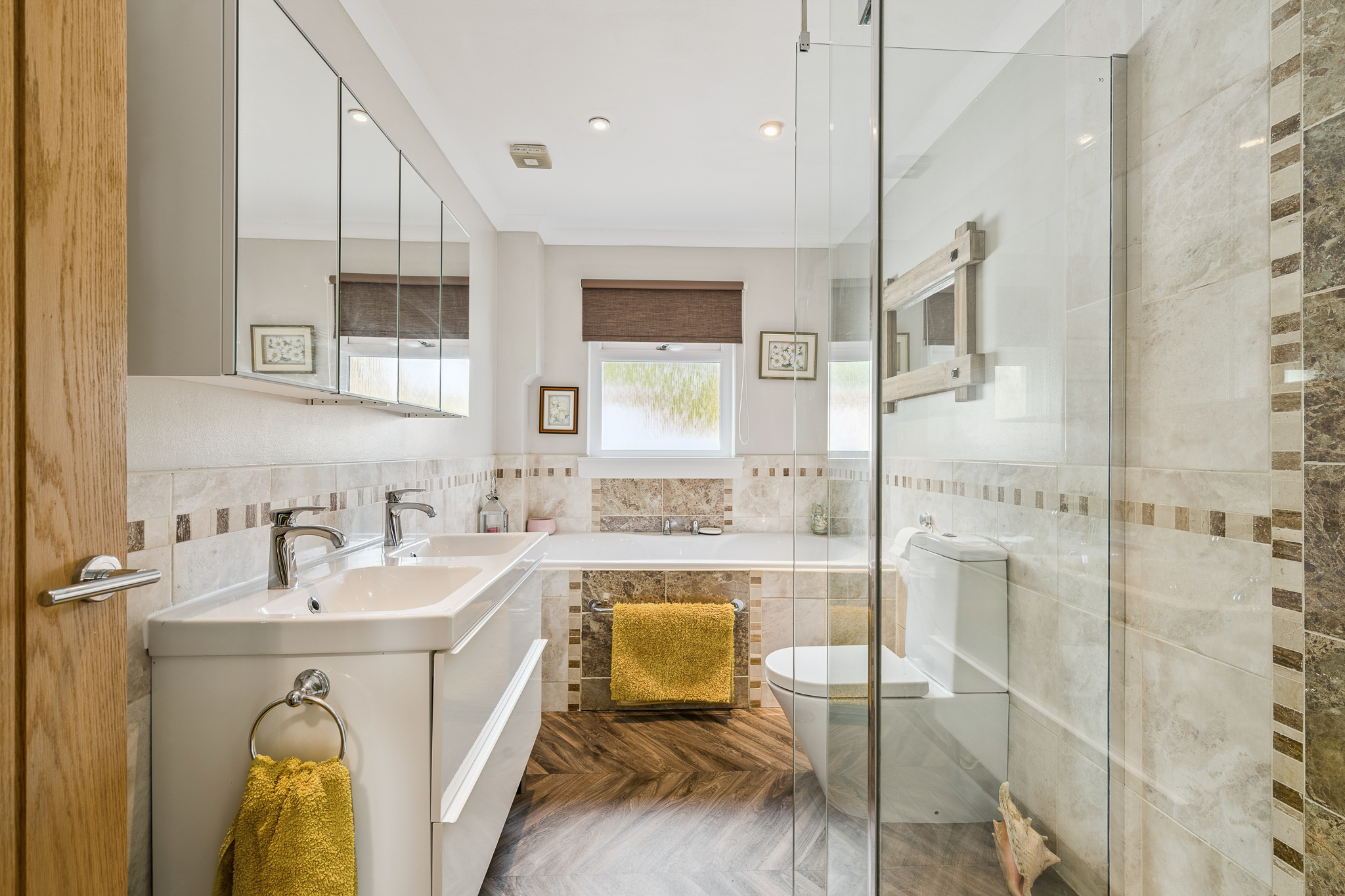 Bedroom Two benefits from a recently upgraded en-suite shower room, while the family bathroom across the hallway is a luxurious four-piece suite featuring a grand, deep bathtub and a large walk-in shower, the perfect space to unwind in style.