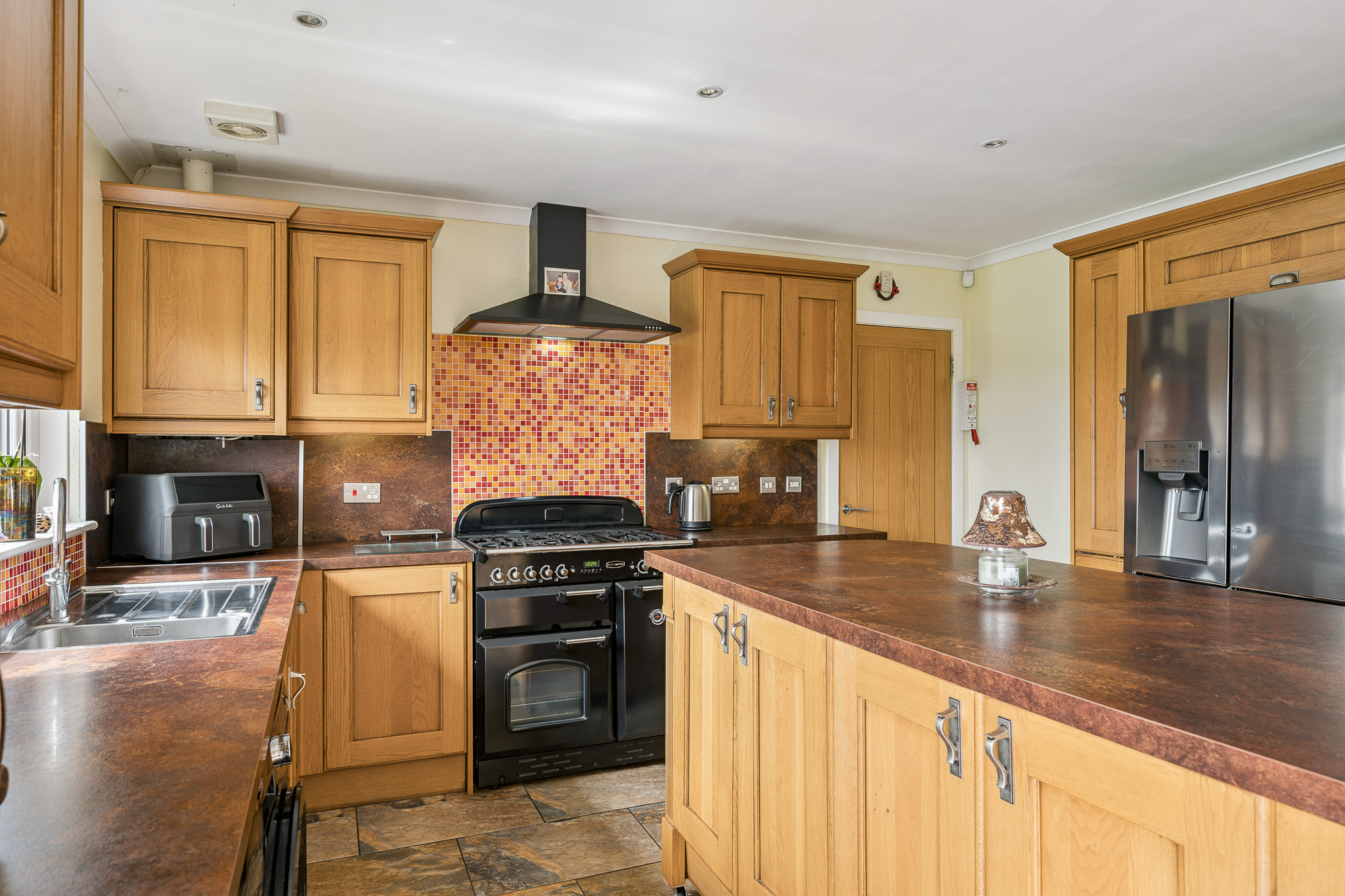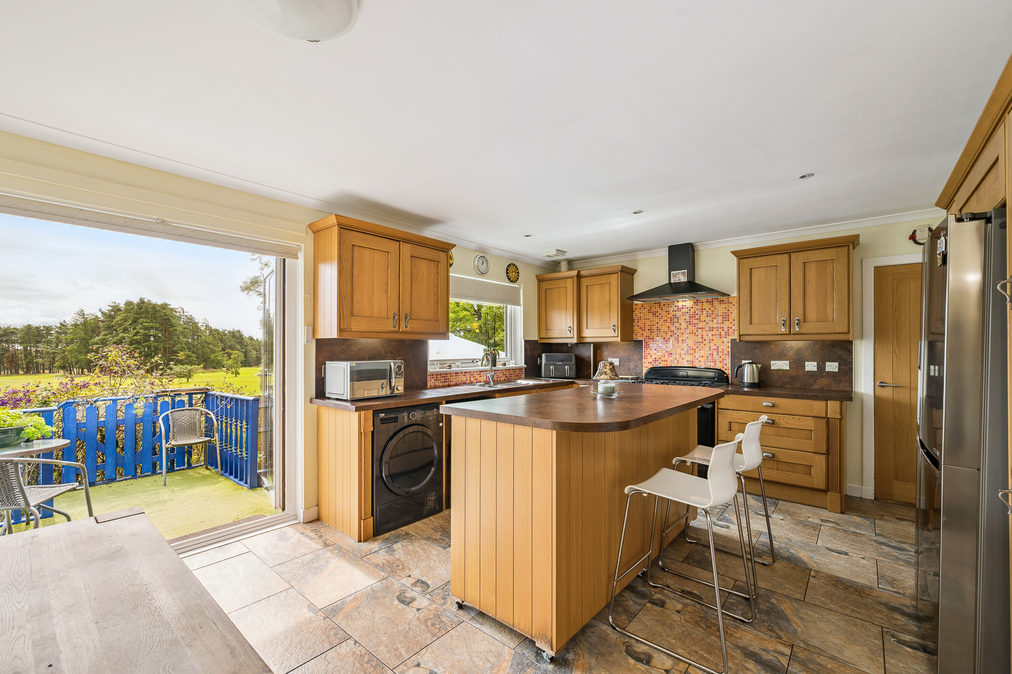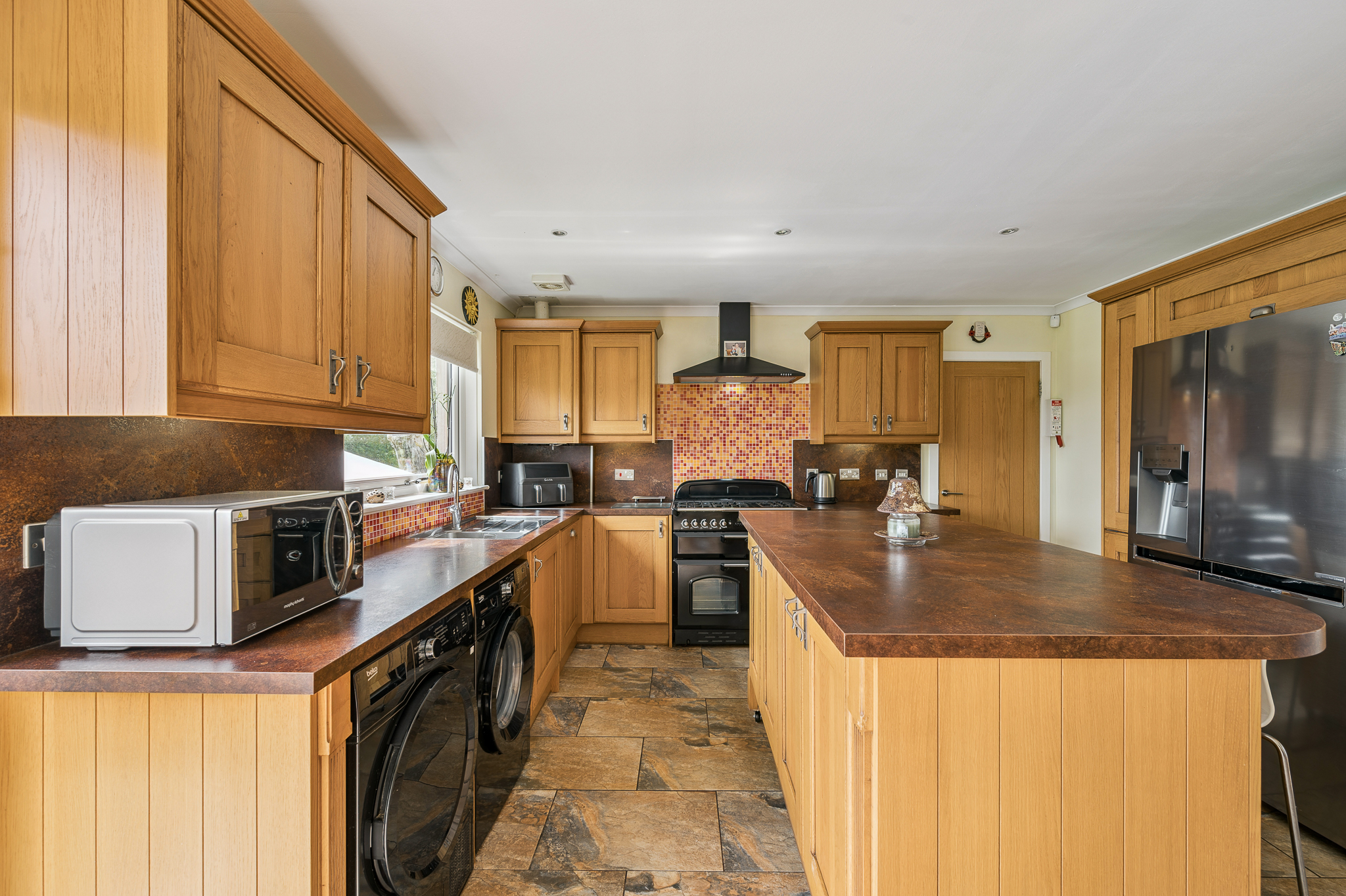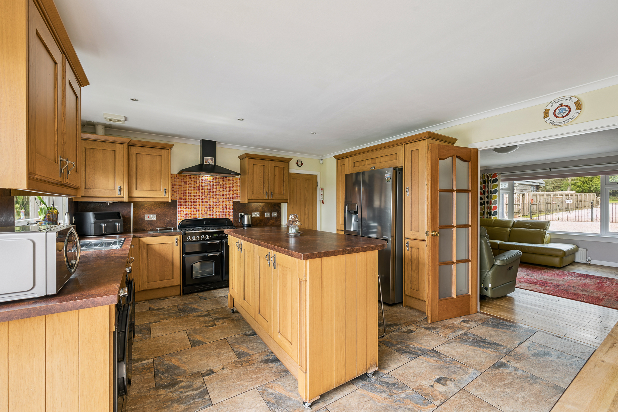 As you arrive, the property’s generous driveway, accommodating over eight cars and double garage immediately set the tone for the space on offer. Stepping through the porch, which serves as a welcoming buffer between indoors and out, you enter a bright and spacious hallway that forms the heart of the home. To the left, the lounge is a wonderful introduction, a generous, light-filled room with expansive front-facing windows that flood the space with natural light. A log-burner takes centre stage, creating a cosy focal point for evenings in. From here, you can also flow seamlessly into the kitchen through the glass double doors as well as enter through the hallway, the kitchen is another impressively sized space. A central island, plentiful storage, and ample room for a large dining table make it perfect for everyday living and entertaining alike. The true showstopper, however, is the view, a stunning panorama of the golf course, framed by the window above the sink and enhanced by patio doors opening onto the landscaped rear garden. On the right side of the property, you’ll find three well-proportioned bedrooms, each with built-in storage and comfortably accommodating a double bed. The rooms are tastefully decorated in neutral tones, offering a warm, homely feel ready for the next owners to personalise.