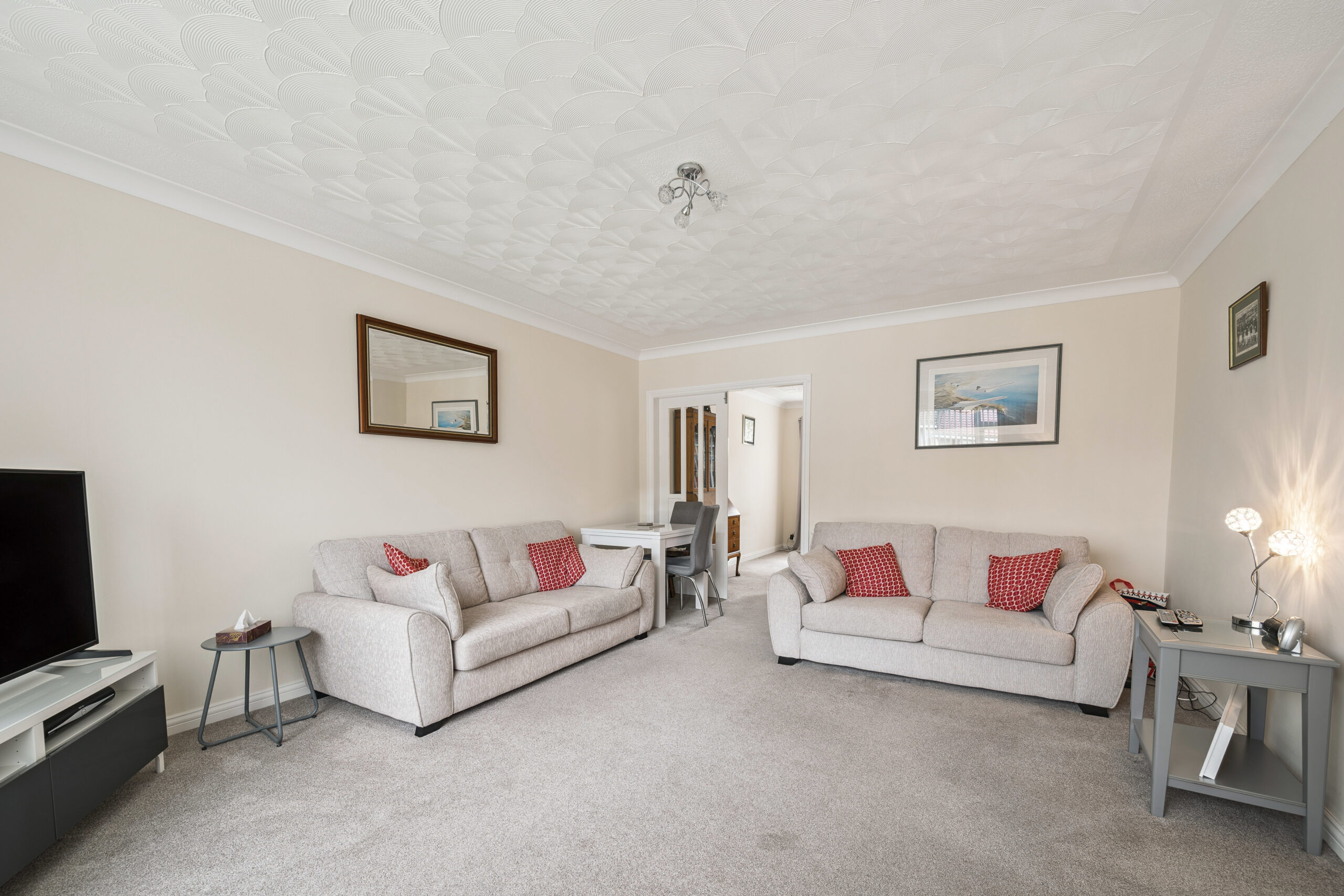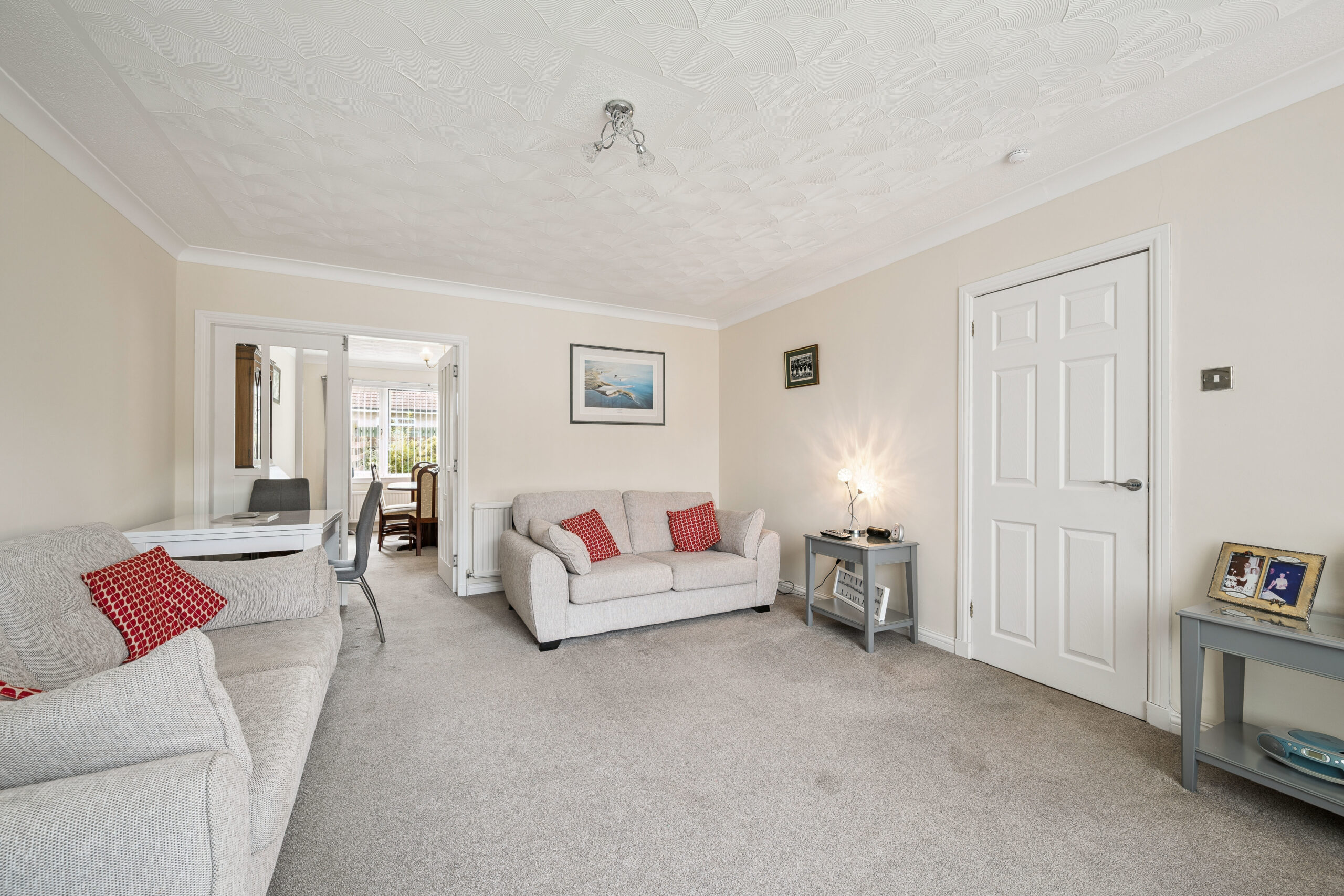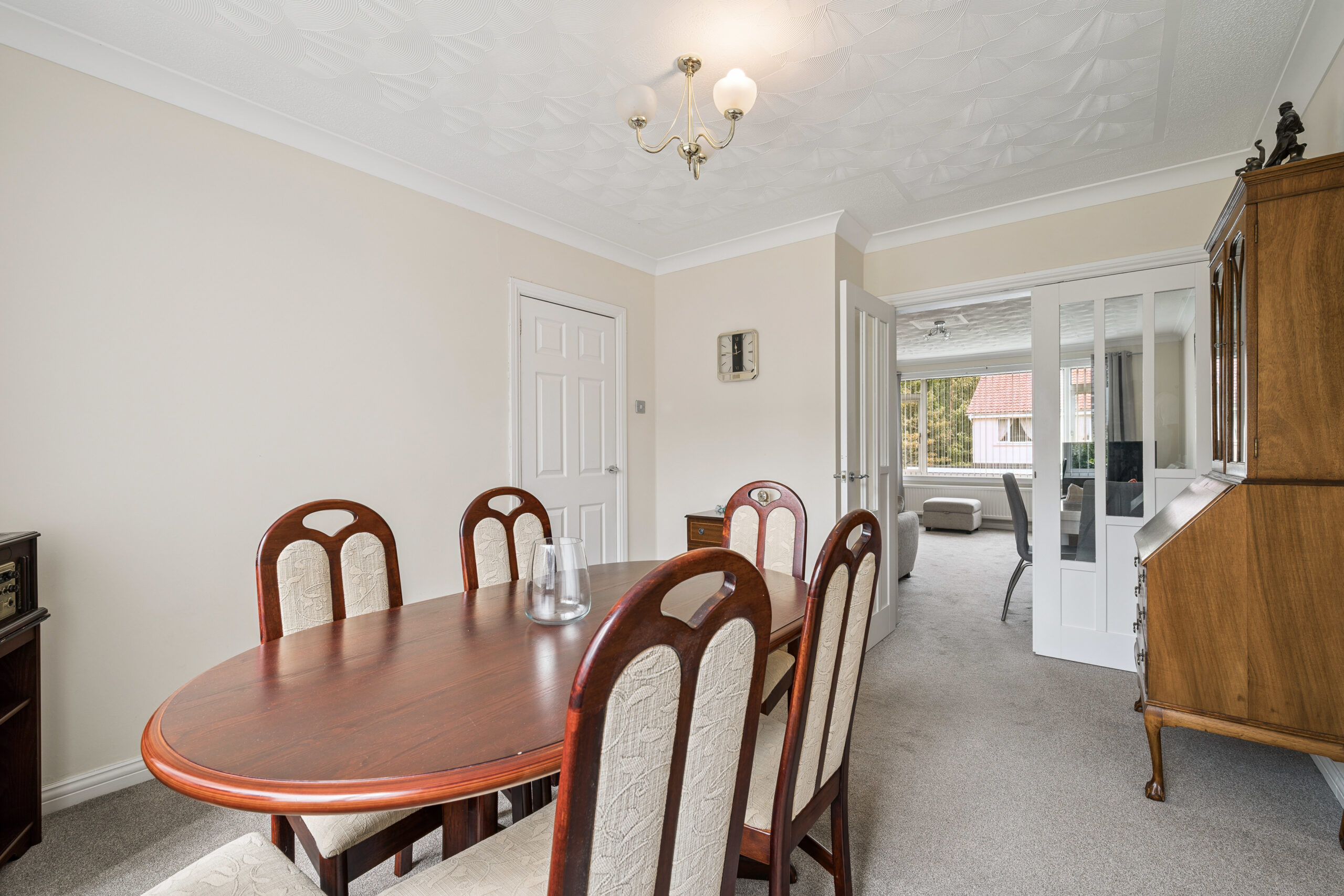 To your left and stretching the full length of the property, the living and dining spaces offer a fantastic flow for modern family life. At the front, a generous living area is softly decorated in neutral tones and features a large picture window which bathes the room in sunlight. Elegant double doors open into the dining space, where dual aspect windows to both the front and rear make the room exceptionally bright, creating a perfect setting for a large family dining table. This clever layout allows for flexible use, whether you prefer a separate dining room or wish to open everything into one expansive living space, this home adapts effortlessly.