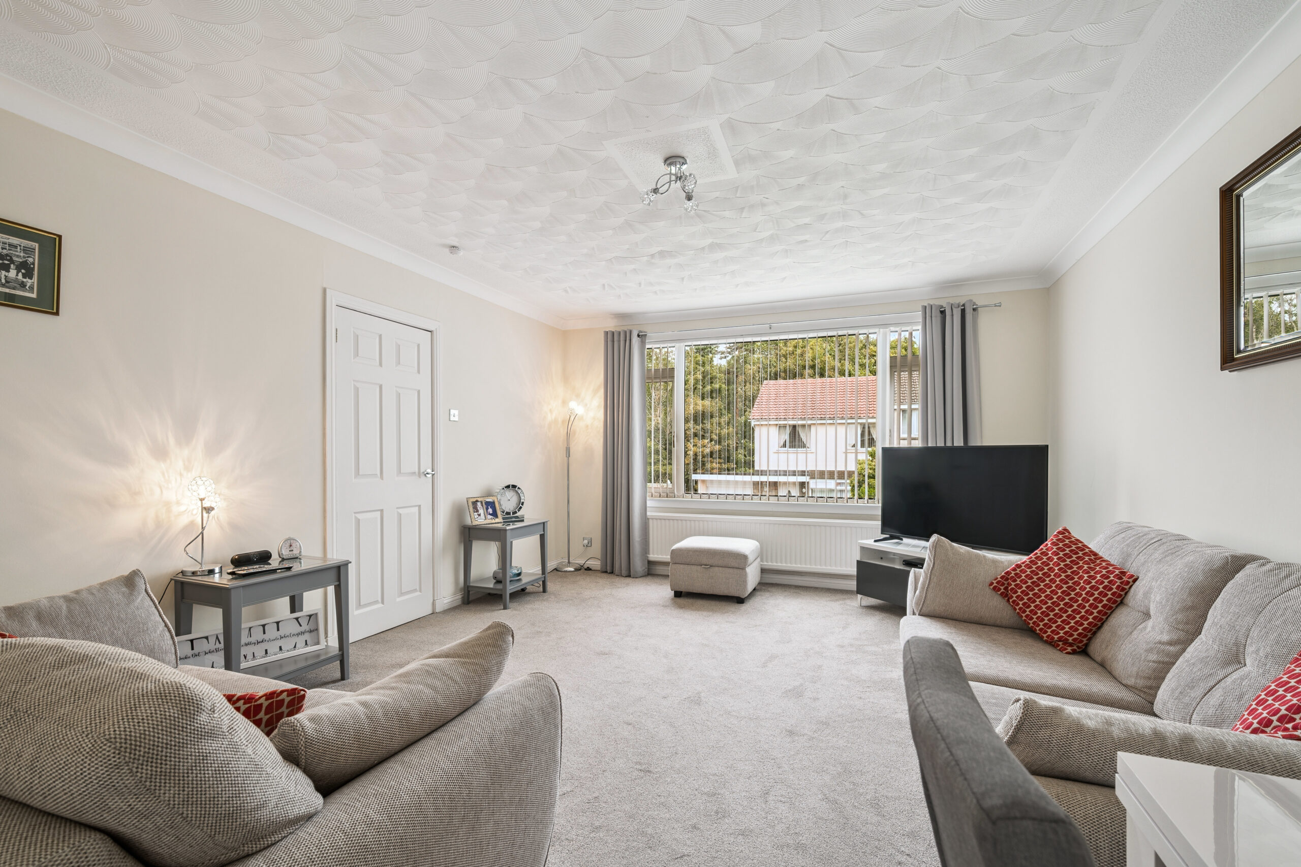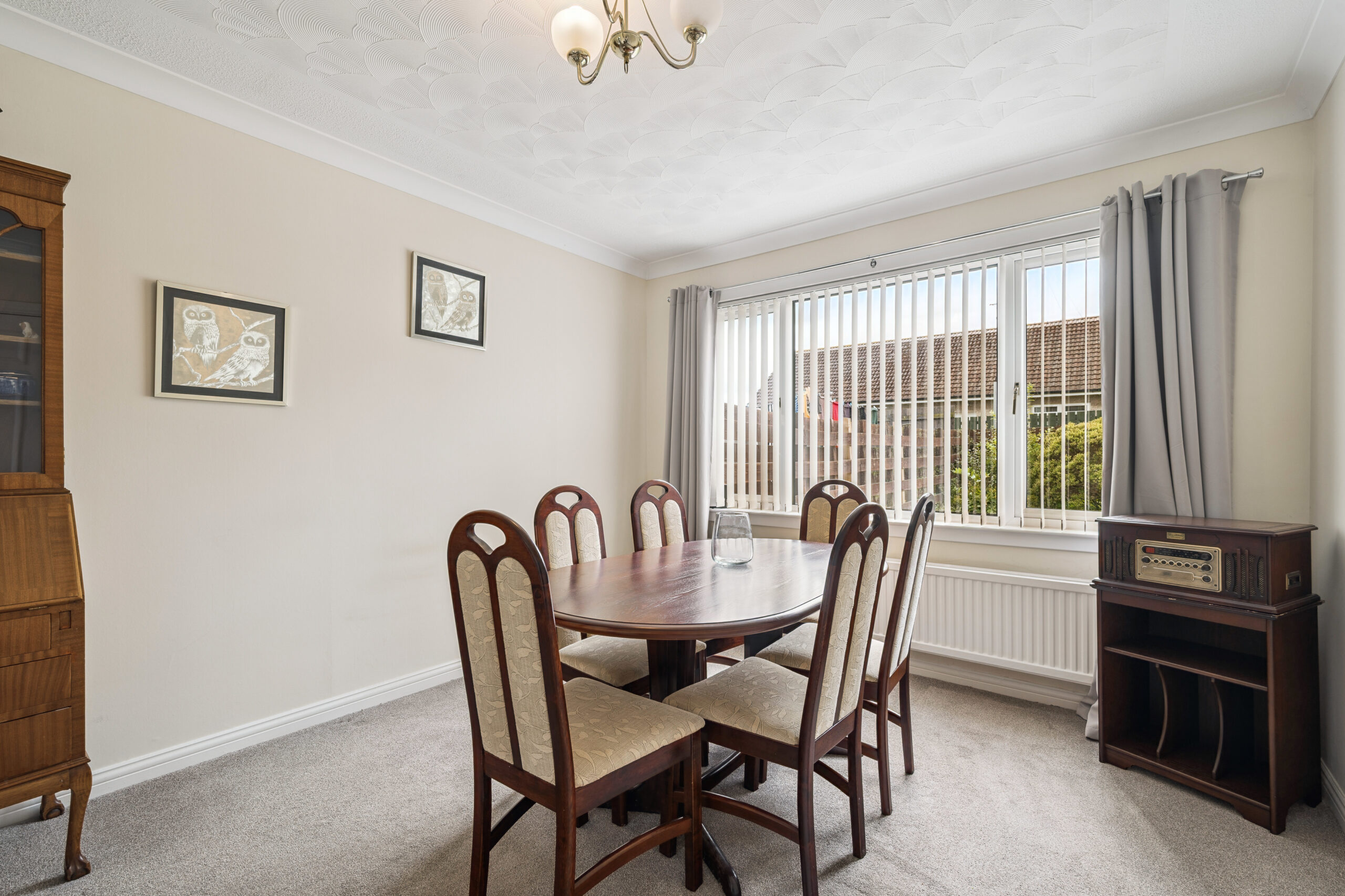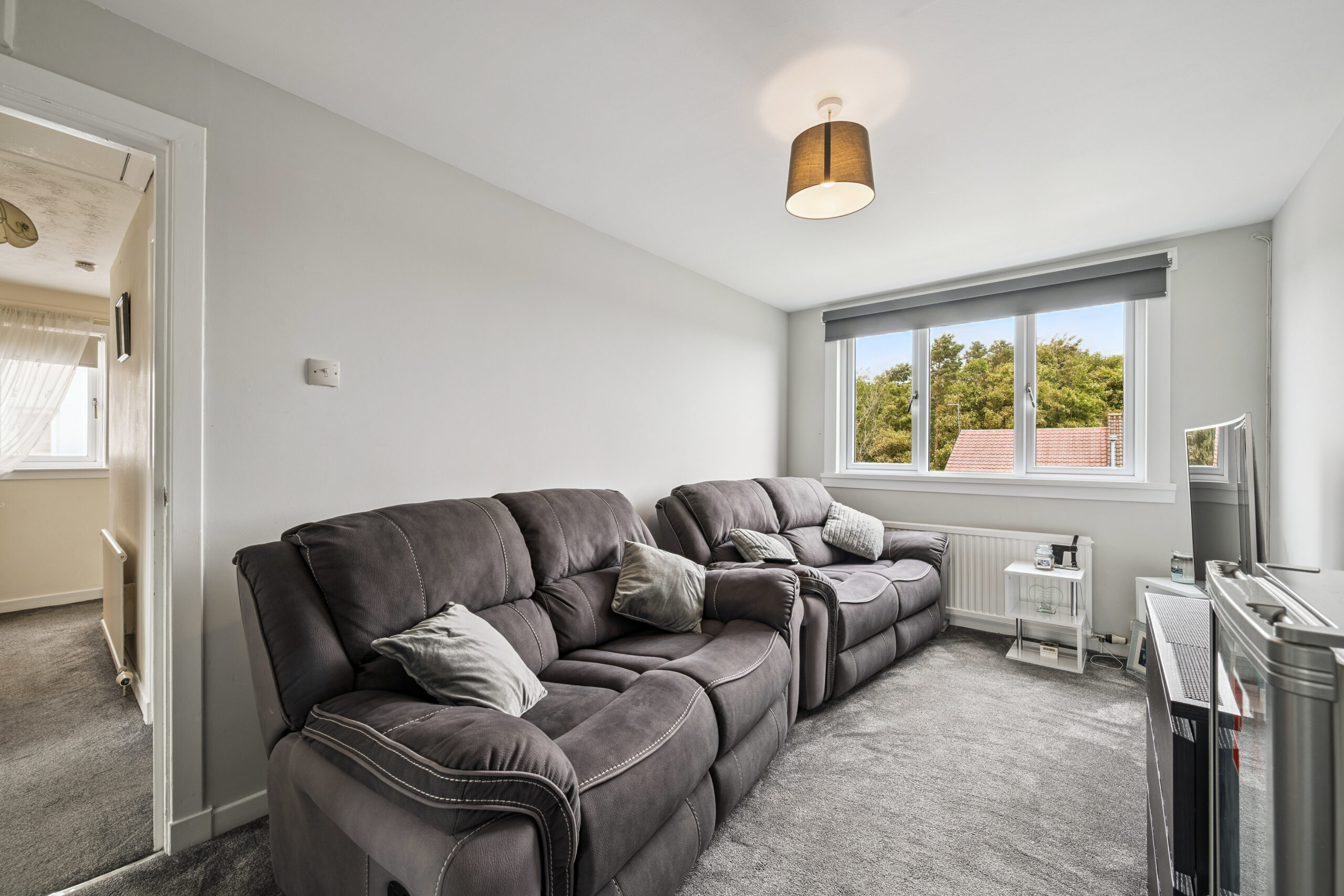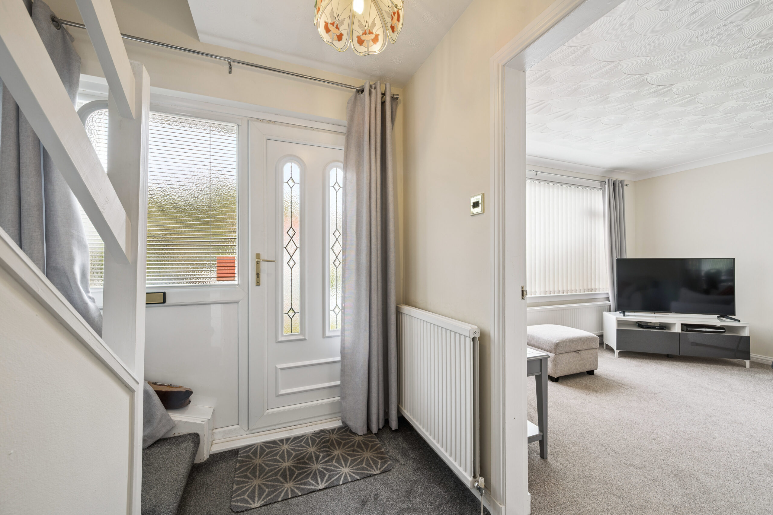 Step inside and you are instantly struck by the light and openness of the entrance hallway, thanks to the large privacy window at the front which fills the space with natural light. Plush grey carpets sweep through the hall and up the staircase, adding warmth and continuity, while a handy under stair storage cupboard keeps everyday essentials neatly tucked away.