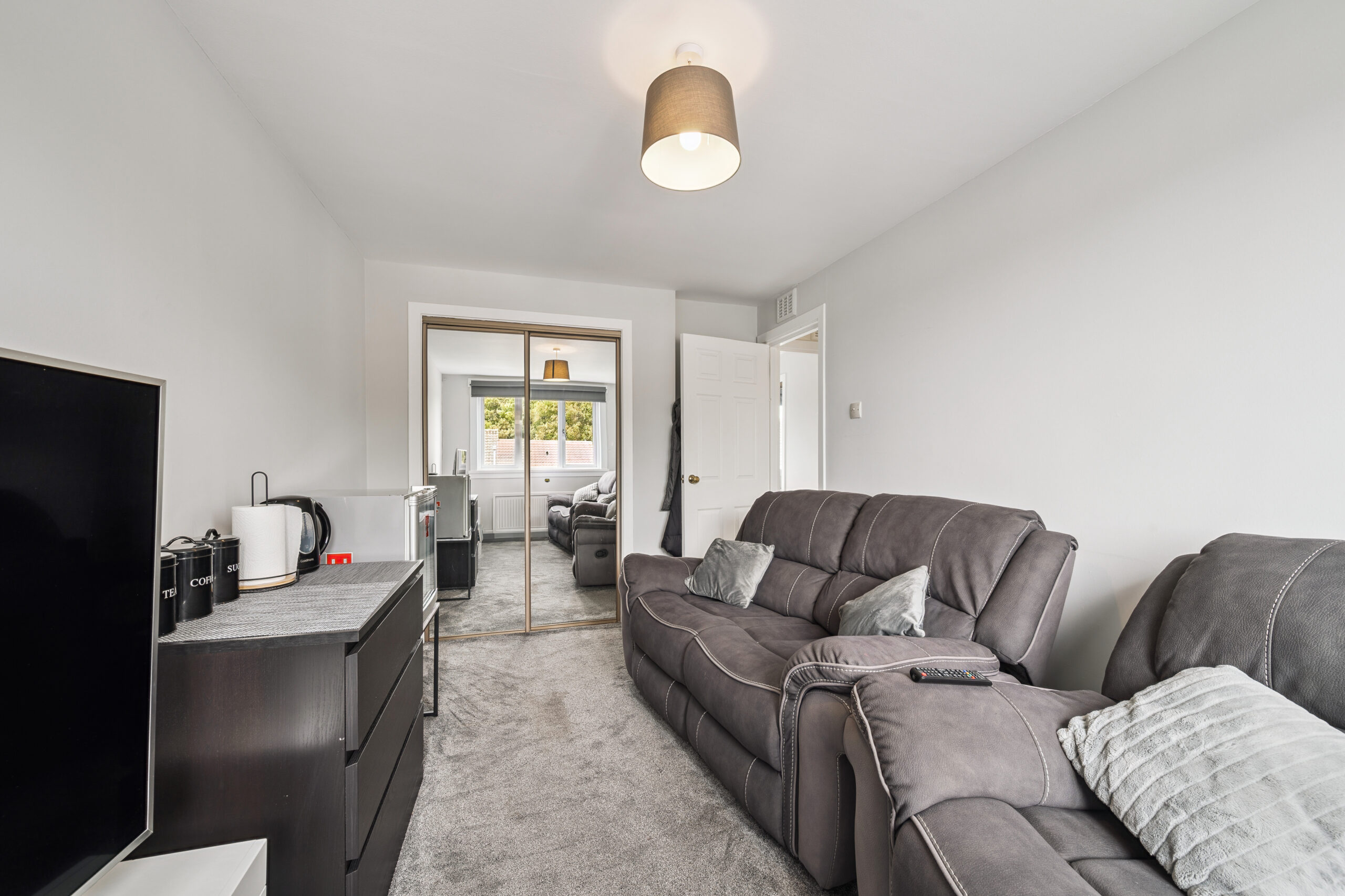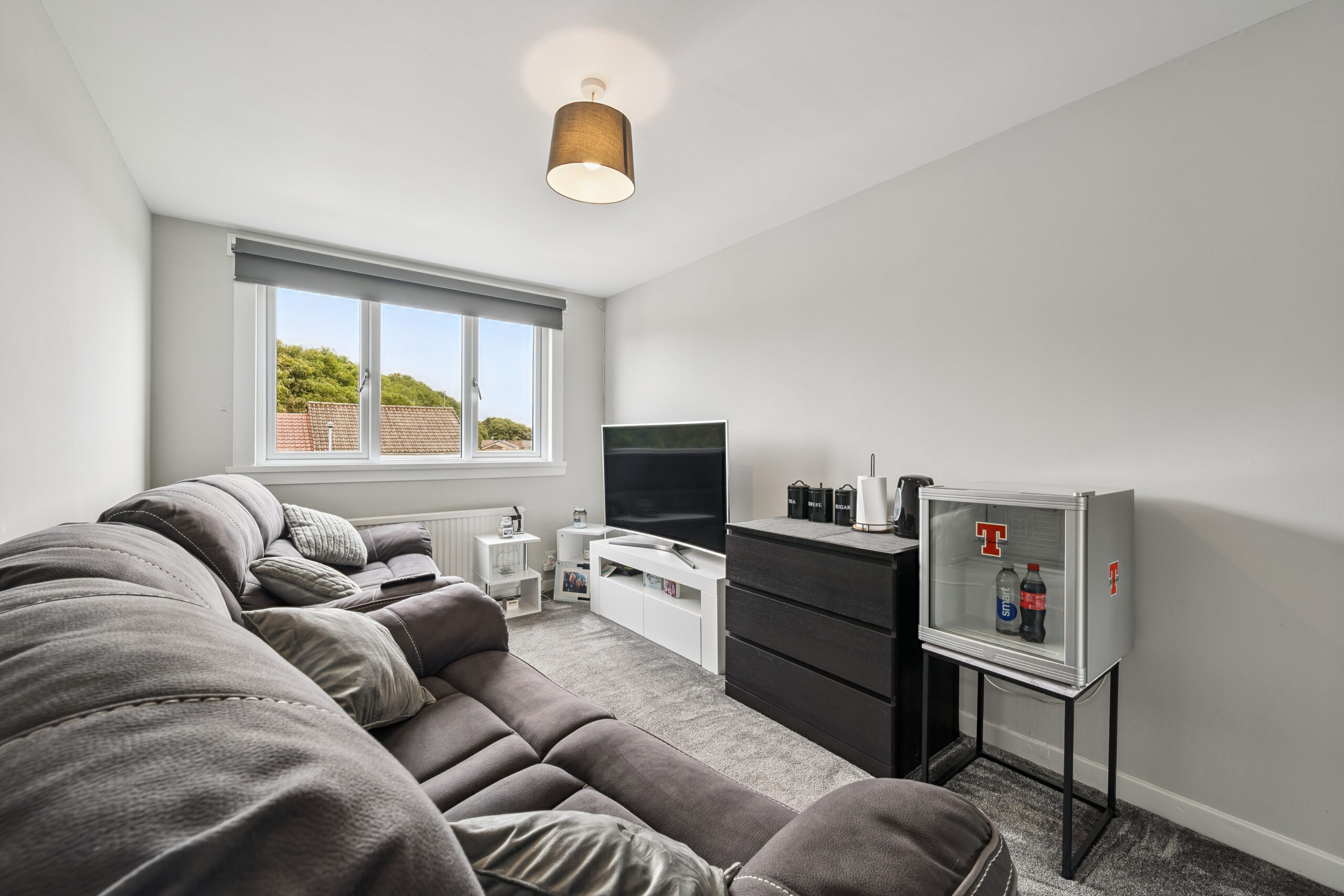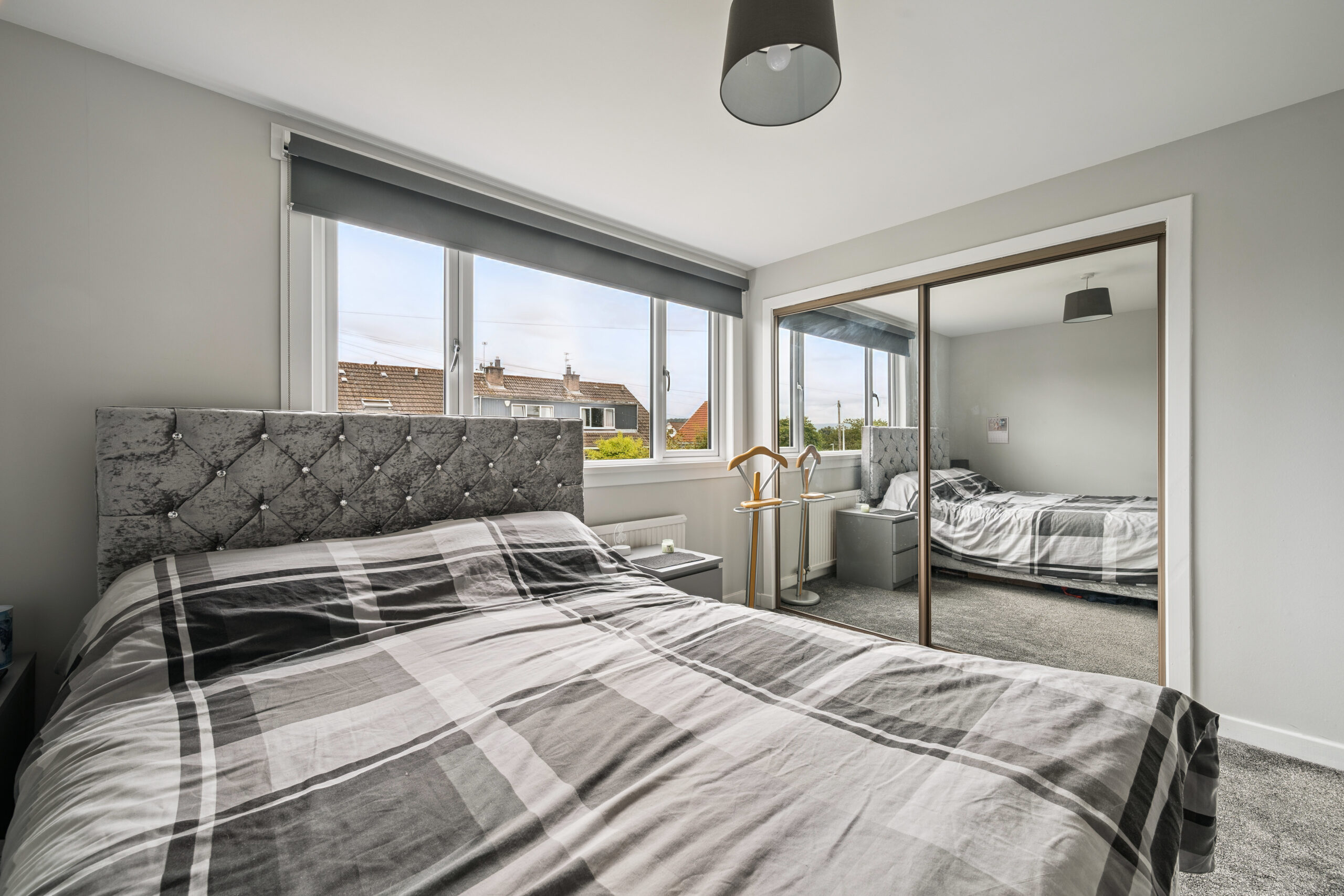 The principal bedroom is a wonderful retreat, currently accommodating a king size bed while still offering ample room for additional furnishings. Built-in mirrored wardrobes provide excellent storage, while the large window, stretching almost the length of the wall, floods the room with natural light and enhances the sense of space. Bedroom two is another generous double, currently styled as a second lounge and also benefits from fitted wardrobes. Bedroom three, too, offers space for a double bed and furniture, making it a versatile room for children, guests or even a stylish home office. A soft grey neutral palette continues throughout the upper level, giving the entire floor a calm and cohesive feel, while offering a blank canvas for the next owners to personalise.