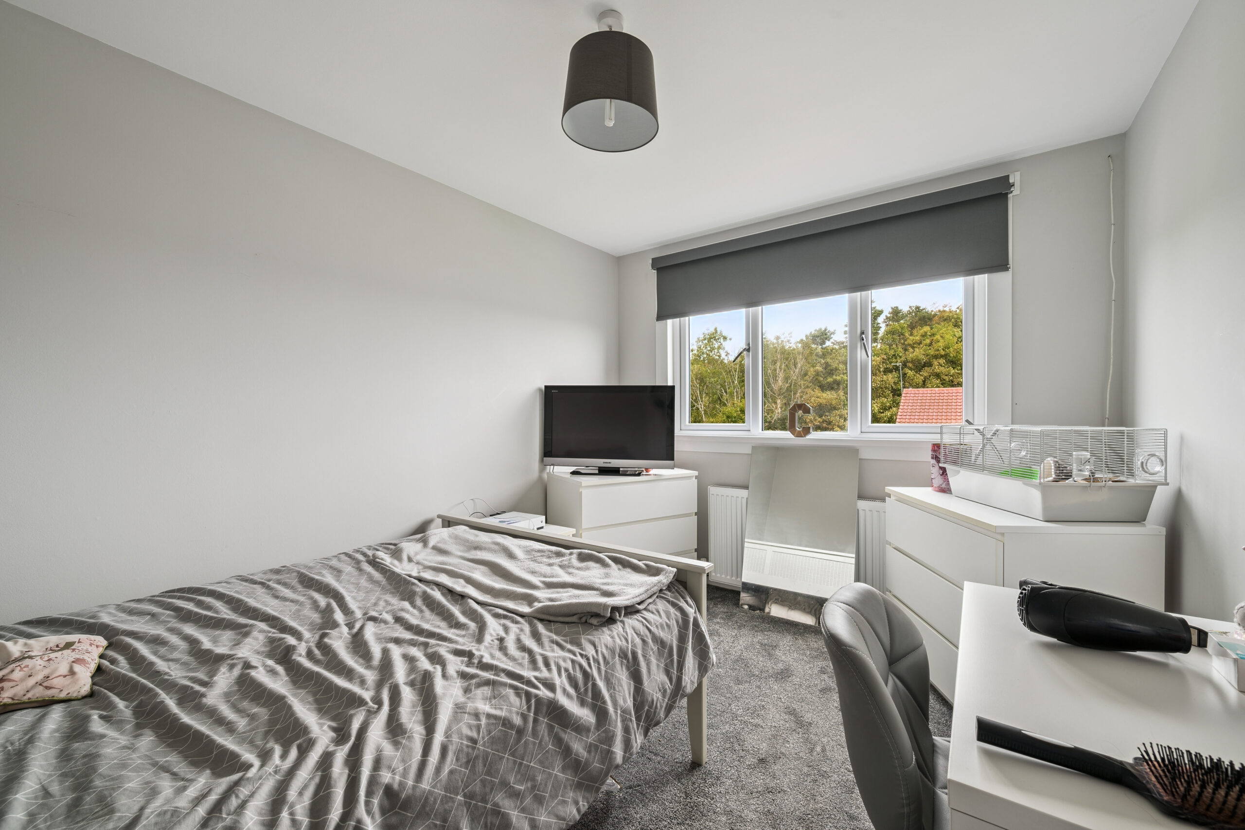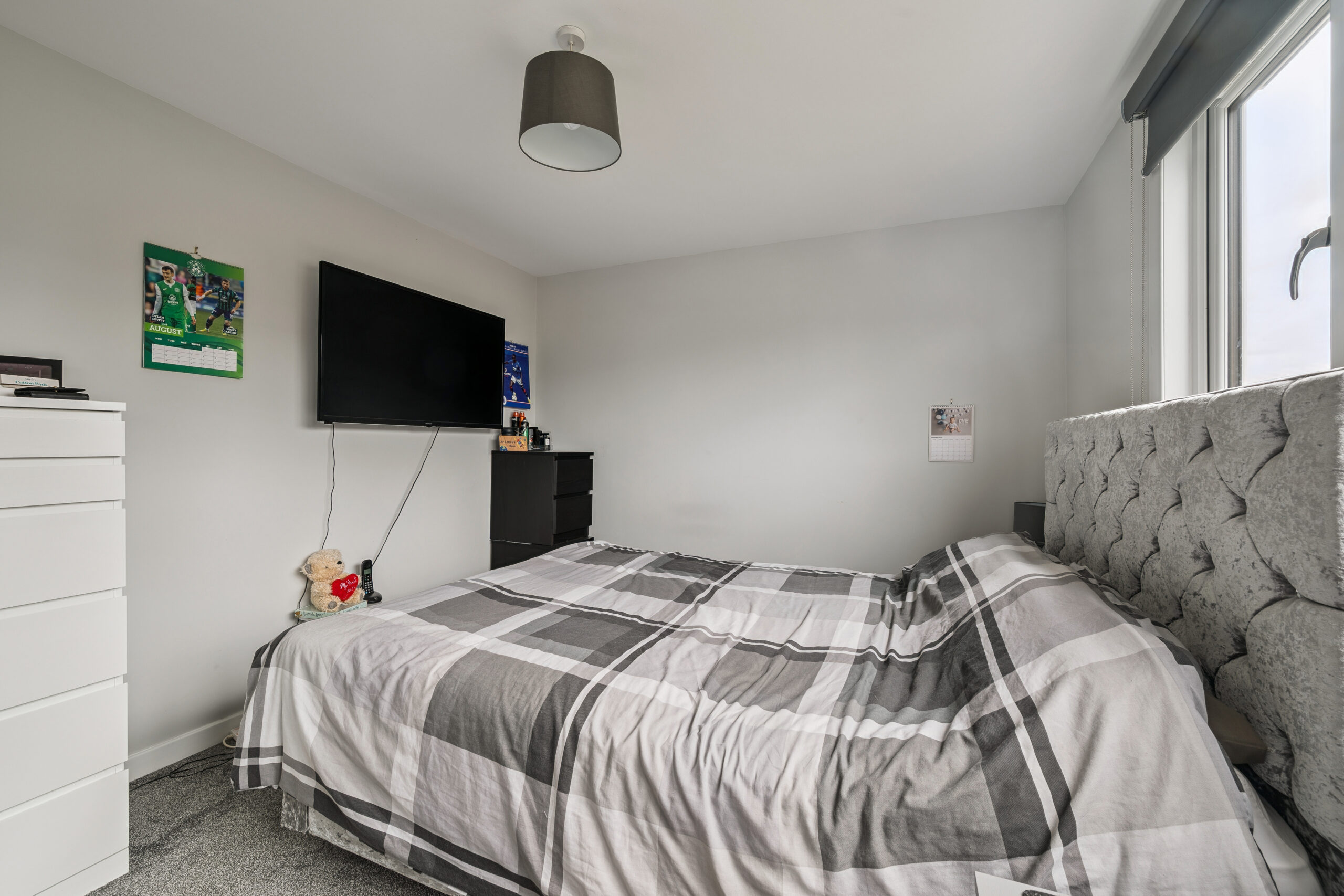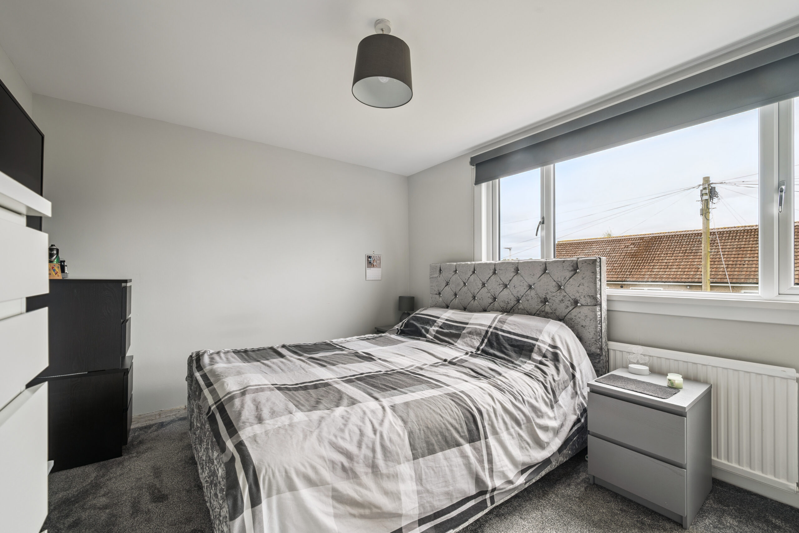 The principal bedroom is a wonderful retreat, currently accommodating a king size bed while still offering ample room for additional furnishings. Built-in mirrored wardrobes provide excellent storage, while the large window, stretching almost the length of the wall, floods the room with natural light and enhances the sense of space. Bedroom two is another generous double, currently styled as a second lounge and also benefits from fitted wardrobes. Bedroom three, too, offers space for a double bed and furniture, making it a versatile room for children, guests or even a stylish home office. A soft grey neutral palette continues throughout the upper level, giving the entire floor a calm and cohesive feel, while offering a blank canvas for the next owners to personalise.