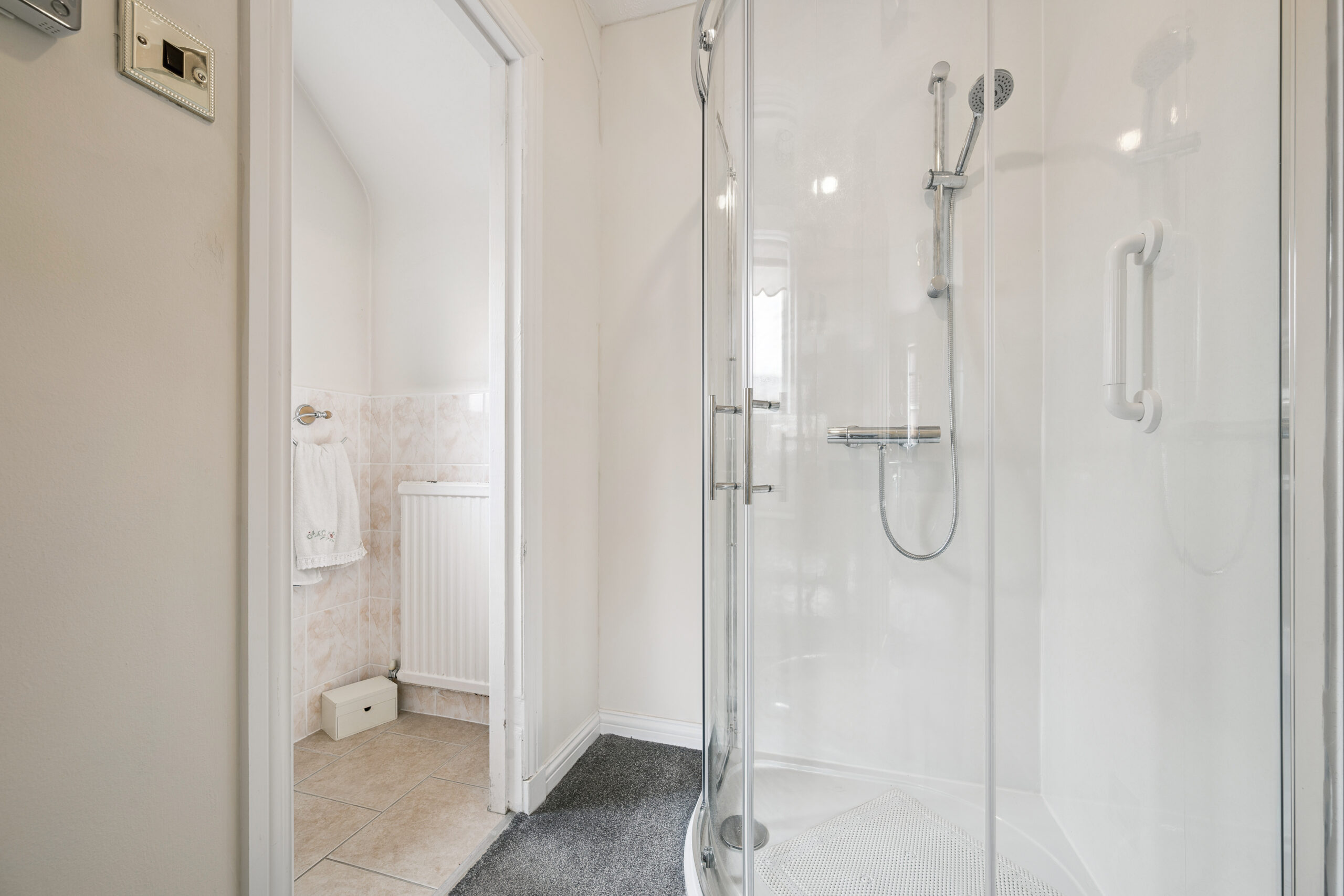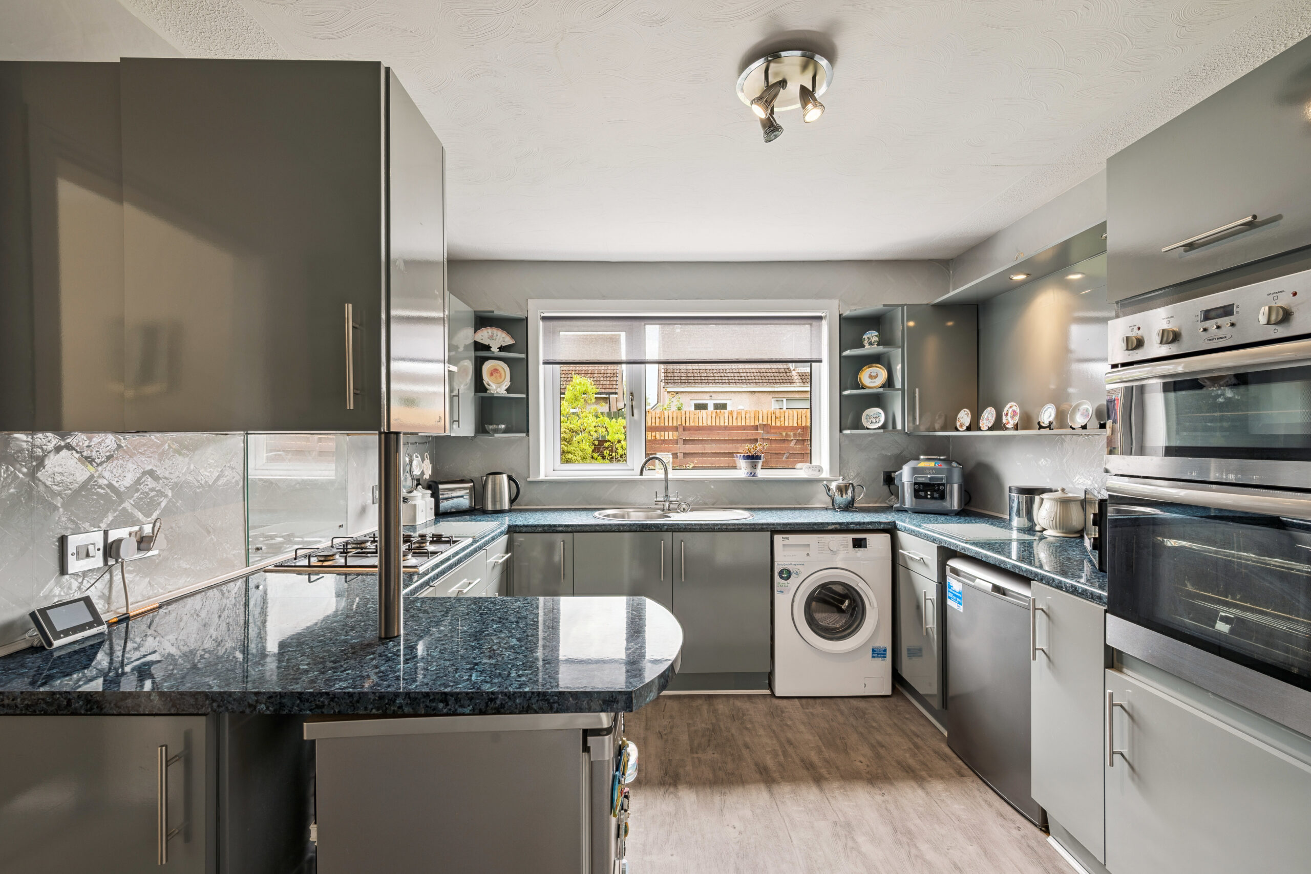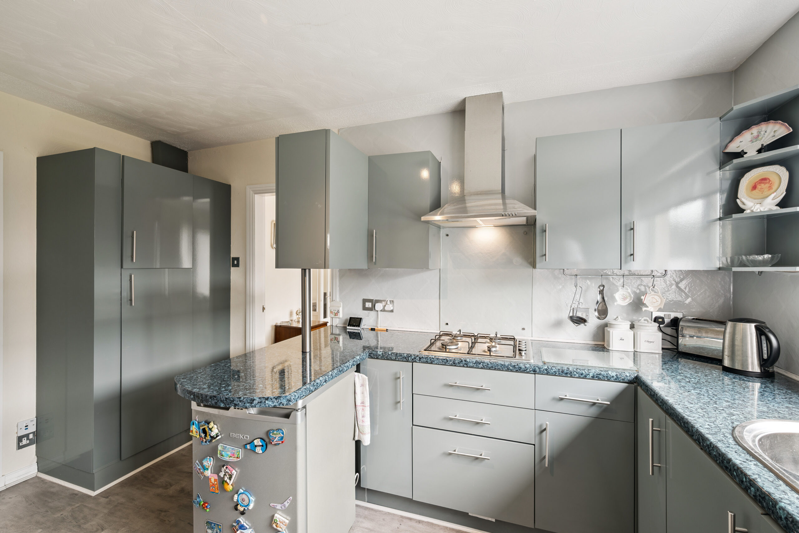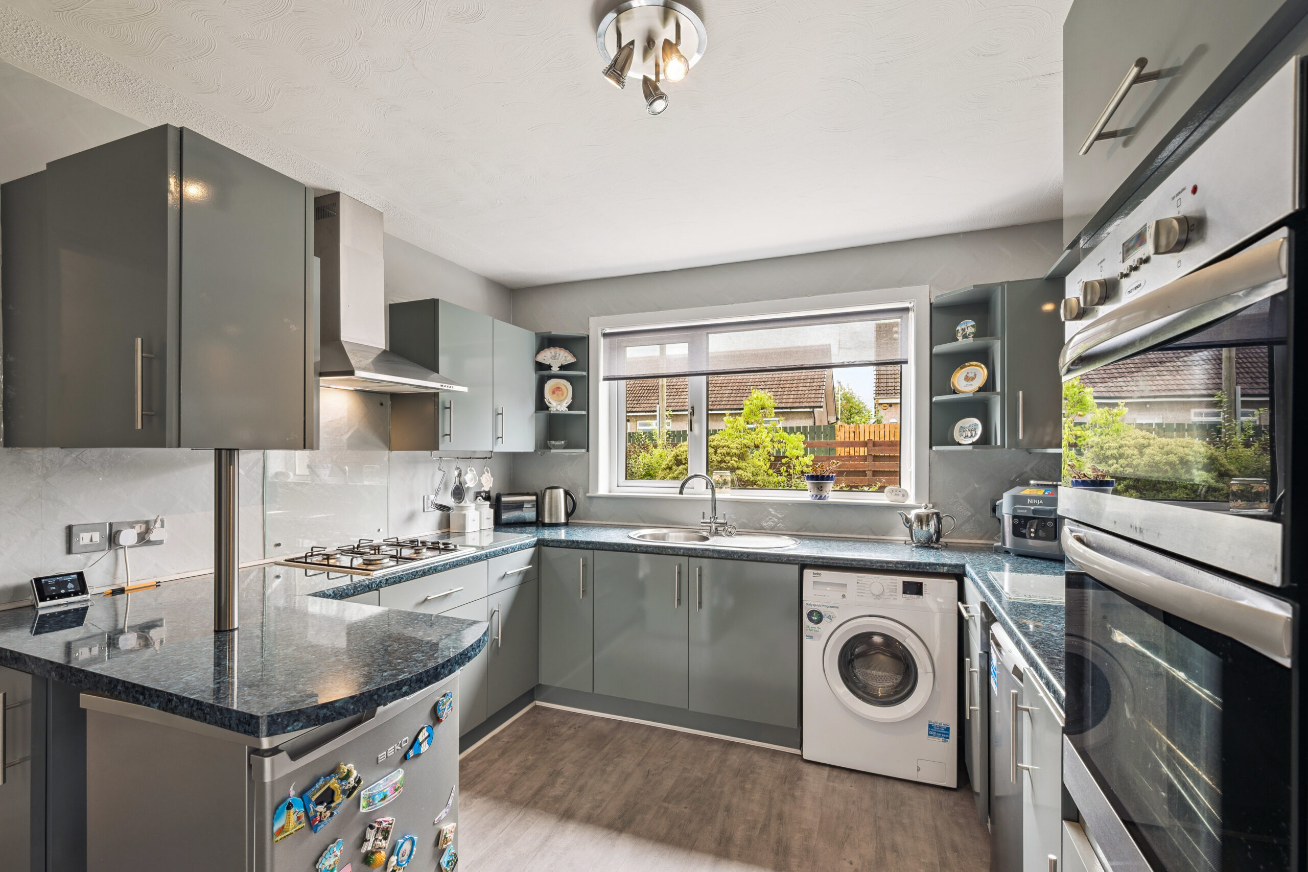 Flowing naturally from the dining area, the kitchen has been refreshed in recent years with sleek grey cabinetry, oak effect flooring and excellent storage options. Beyond, you’ll find a convenient downstairs WC and shower room, thoughtfully added by the current owners. This area provides real versatility, with the potential to transform into a large family bathroom or even reconfigure as a dedicated utility space.
