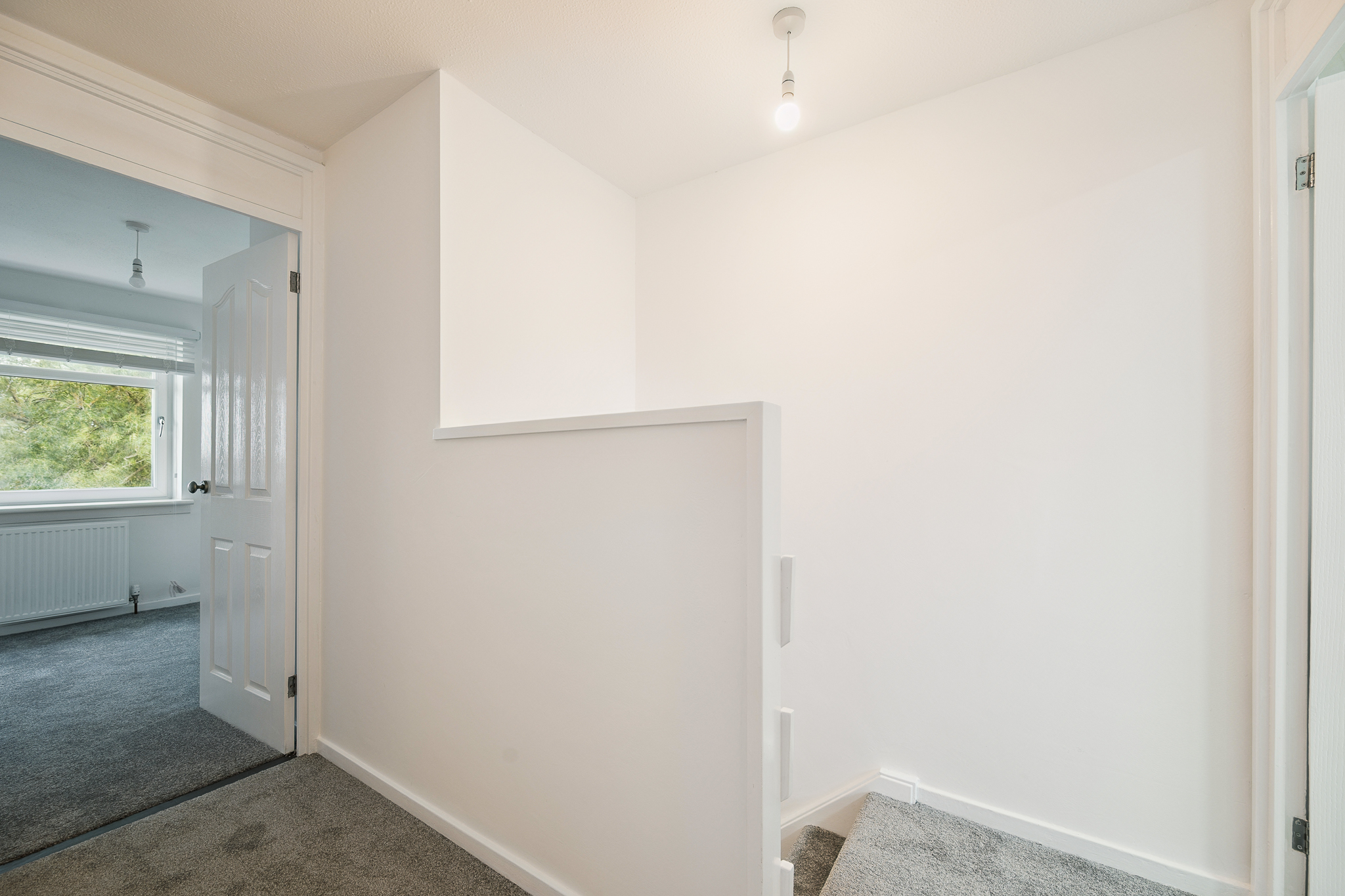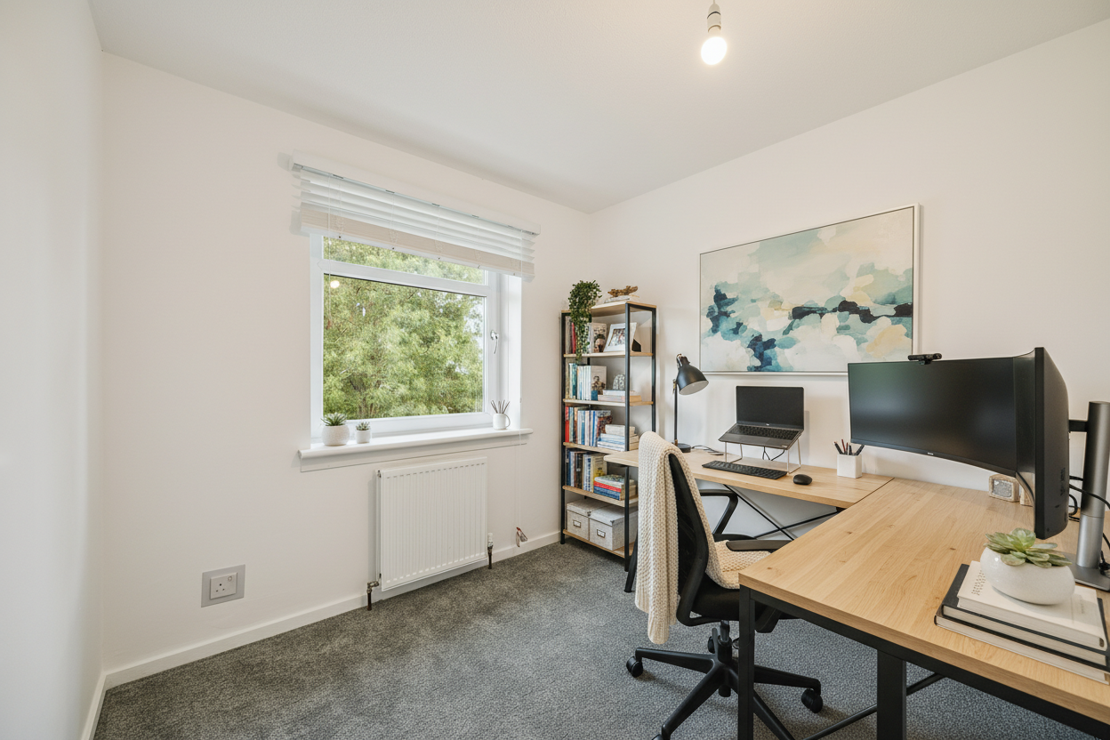 Upstairs, the first room you come to is the family bathroom, finished in neutral tones and fully tiled for easy maintenance, featuring a modern three-piece suite comprising a sink, toilet and shower. Adjacent to the bathroom is bedroom two, a fantastic double room with built-in storage that easily accommodates a king-size bed. Next is bedroom one, which enjoys the same wonderful green outlook as the lounge. This spacious and bright double also benefits from built-in wardrobe space and easily takes a king-size bed. To the front of the property lies bedroom three, a well-proportioned single that would make an ideal child’s room, nursery, home office, dressing room or hobby space. Versatile and practical, it can evolve as your family’s needs change and also includes its own built-in storage cupboard.