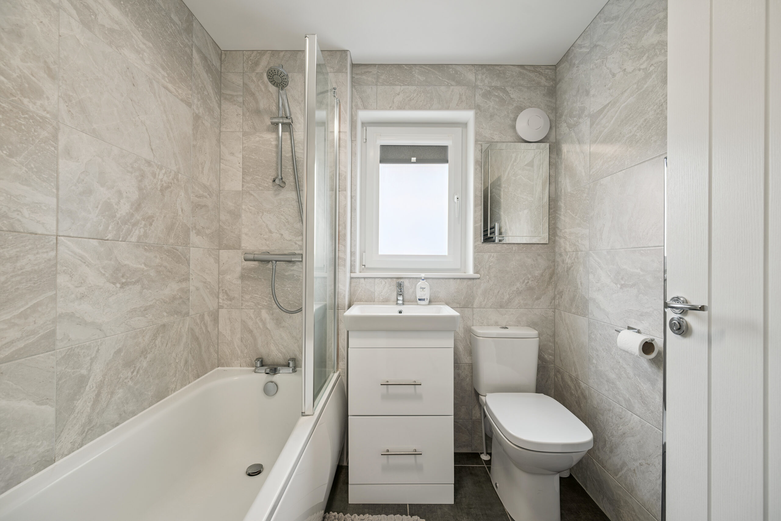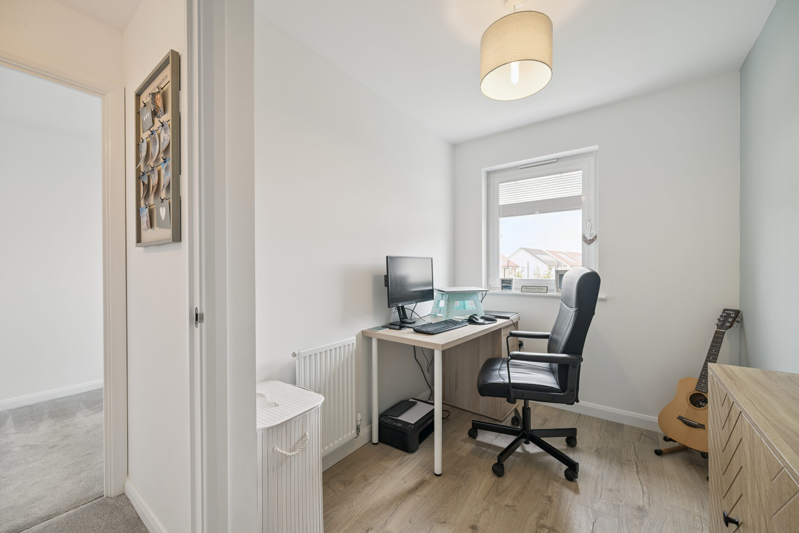 Upstairs, the principal bedroom is a relaxing retreat with two double-aspect windows filling the room with natural light. This space easily accommodates a king-size bed with bedside cabinets, along with wardrobe or drawer storage. Bedroom two is a generous double, offering space for a bed, bedside cabinets, and a wardrobe. Bedroom three is currently arranged as a home office but can also comfortably host a single bed, making it perfect as a nursery, guest room, or flexible study space. The family bathroom serves the upper floor with a stylish three piece suite, including a bathtub with overhead shower.