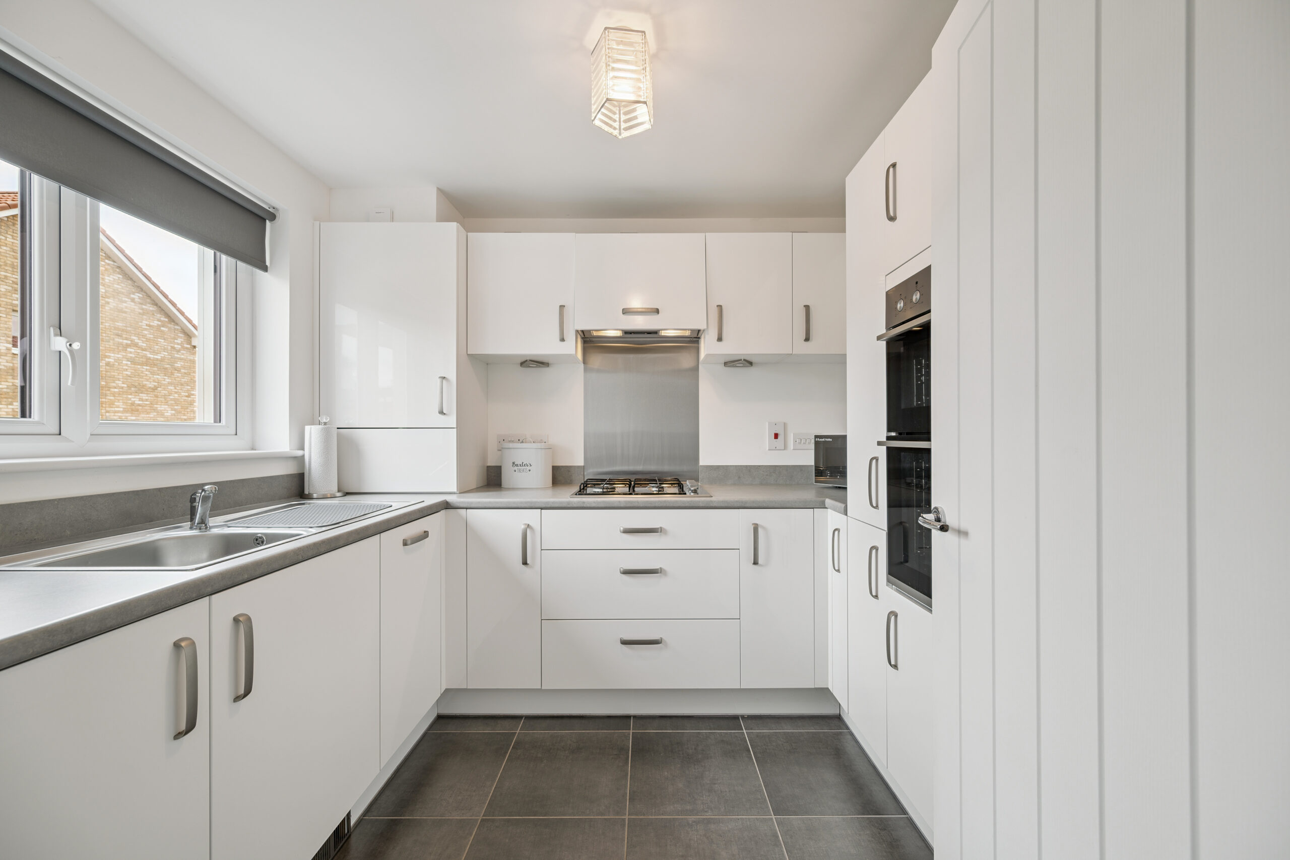 Stepping inside, you are greeted by a bright and welcoming hallway that sets the tone for the rest of the home. To the left lies the modern kitchen, fitted with sleek white-gloss cabinetry, ample worktop space, and a full suite of integrated appliances including a fridge-freezer, washing machine, dishwasher, oven, hob, and four-point gas cooker.