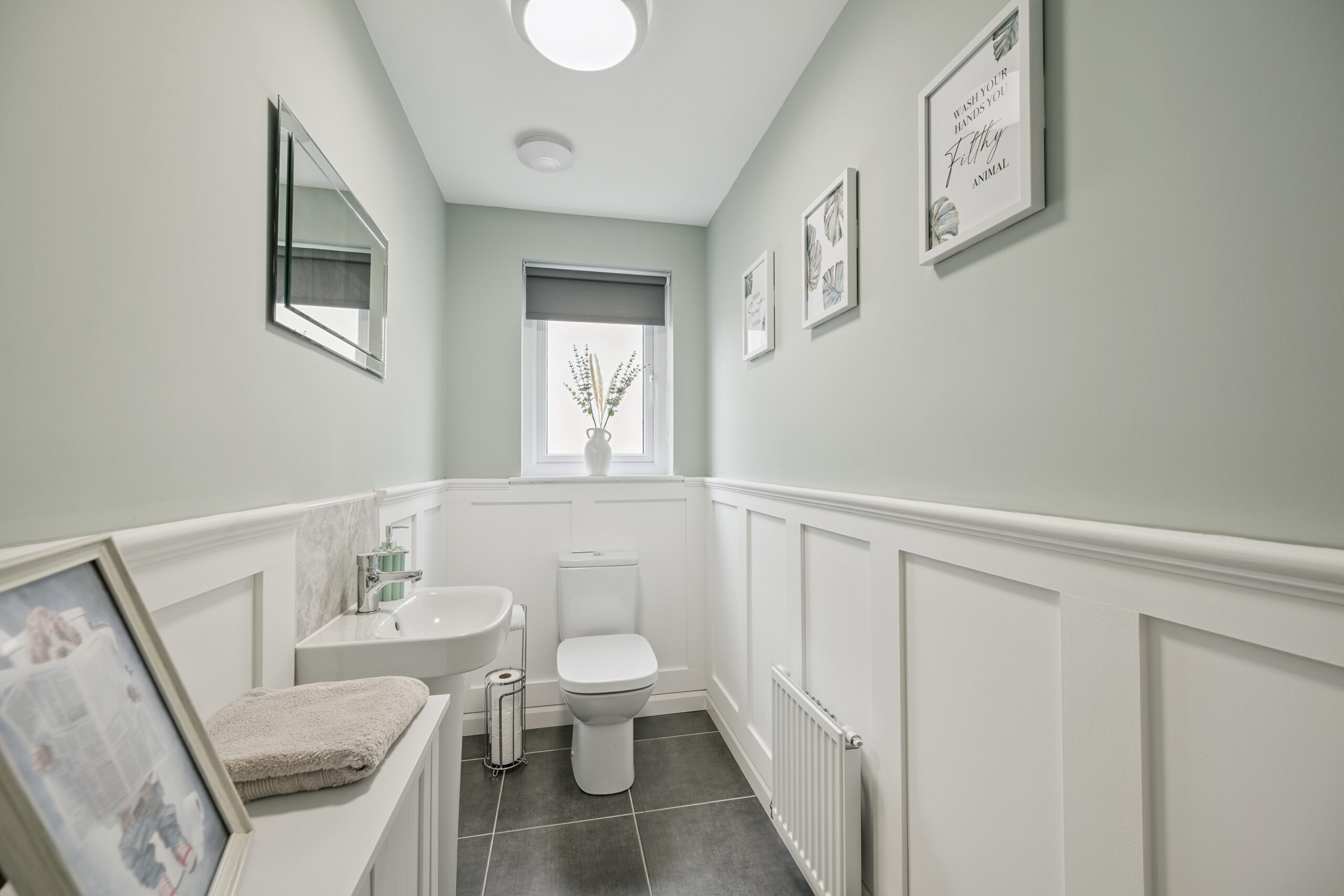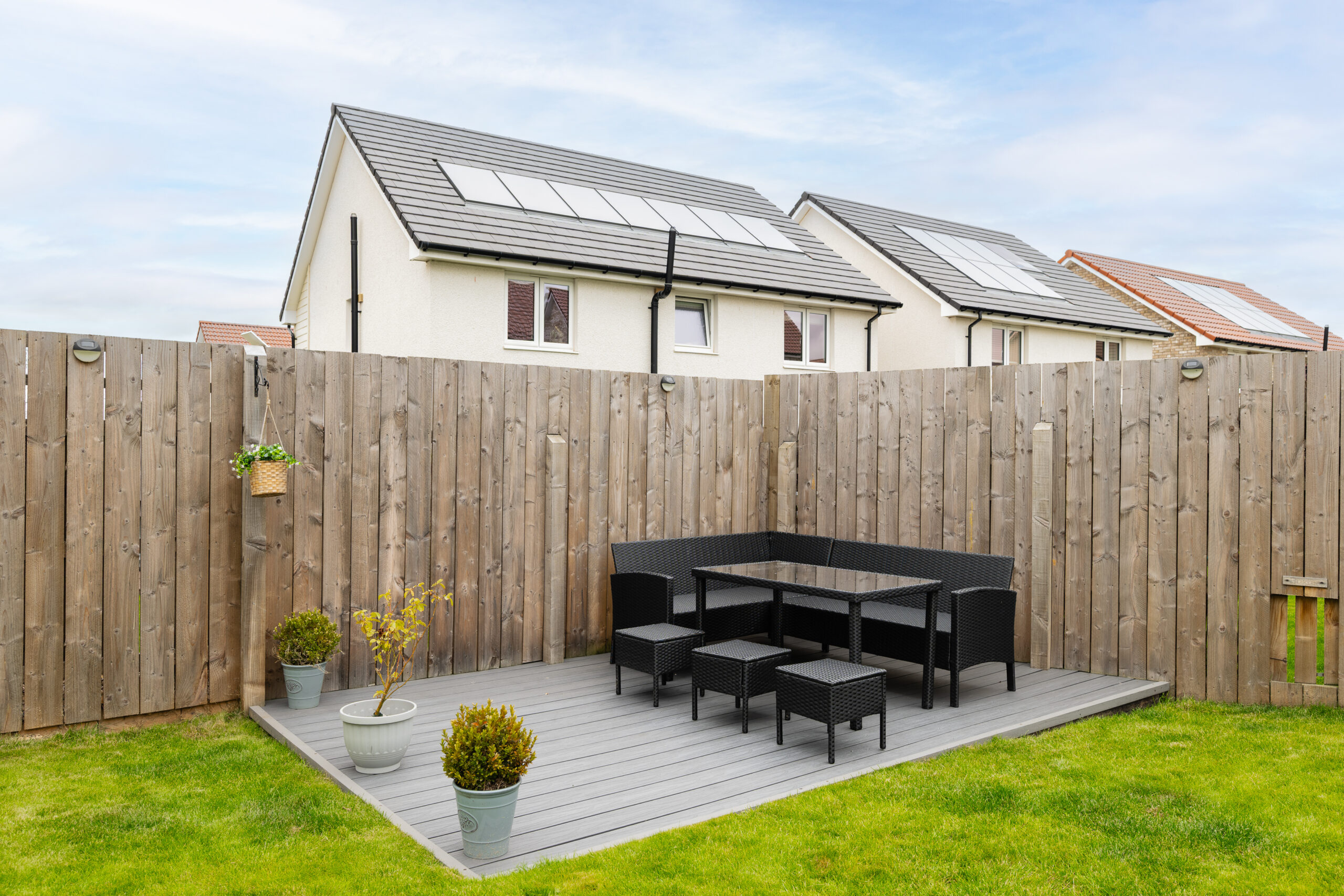 The heart of the home is the open-plan lounge and dining area, a versatile space designed for modern living. There is room for two sofas, a media wall, and a dining set for four, while patio doors open seamlessly onto the rear garden, creating a natural flow between indoor and outdoor living. The garden itself is landscaped with a neat lawn and a decked seating area positioned to capture the best of the sunlight, ideal for summer dining and entertaining. Completing the ground floor is a spacious WC, finished with splashback tiling, chrome accents, and character panelling that adds warmth and charm.