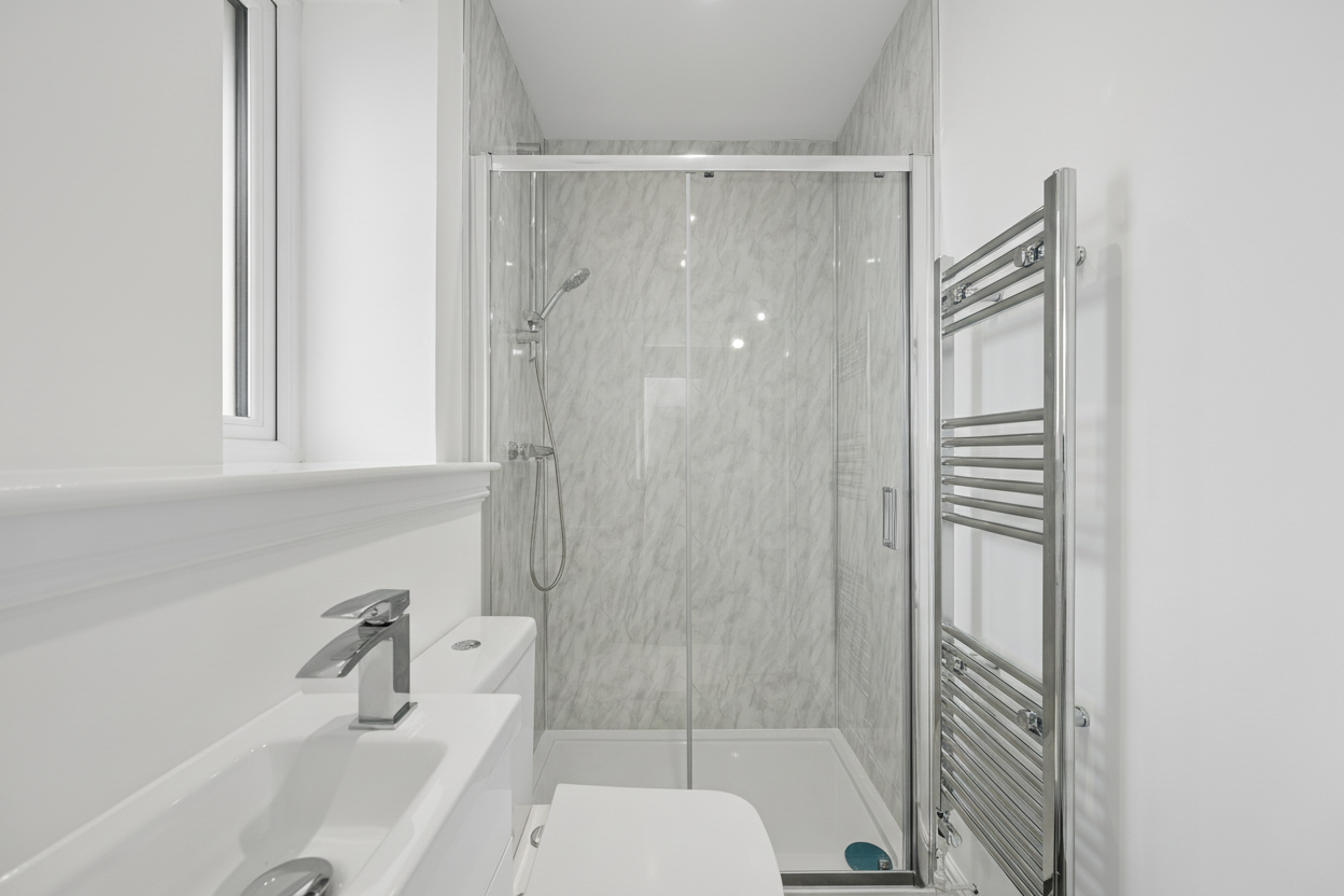 Next door, you’ll find the family bathroom, finished to the same modern standard with grey marble effect wet wall and a bath with shower over.