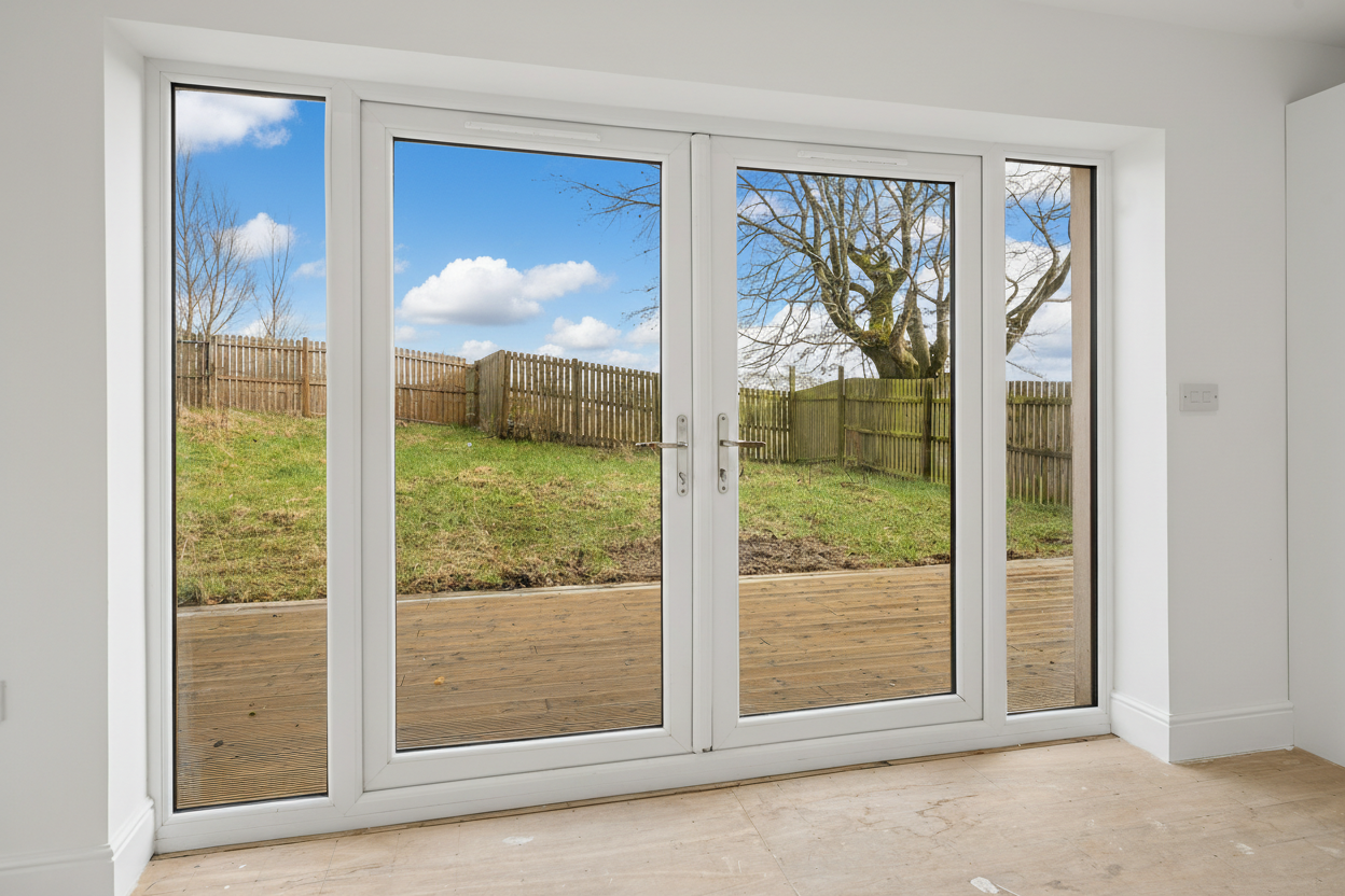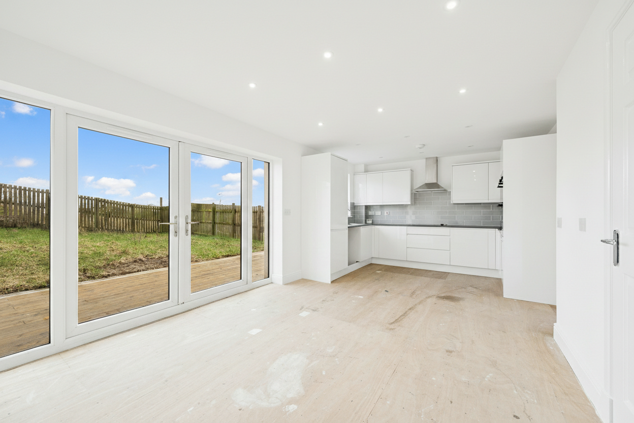 Continue through the hallway and you arrive at the heart of the home, the contemporary kitchen with dedicated dining area. Fitted with sleek white cabinetry, black marble effect worktops and stylish grey tiling, the space feels modern and fresh. French doors open directly onto the rear decking, creating an effortless flow for indoor outdoor living and summer gatherings. A door from the kitchen provides access to the integral garage.