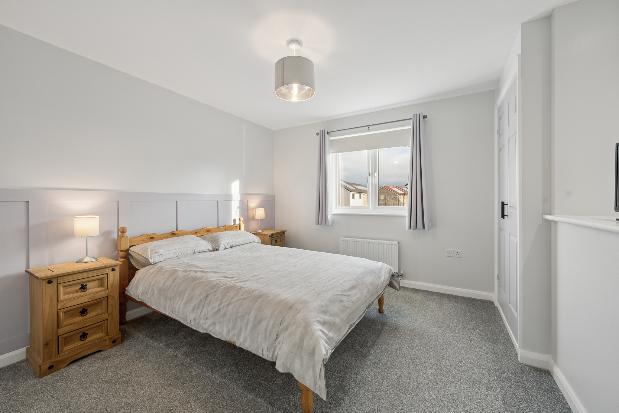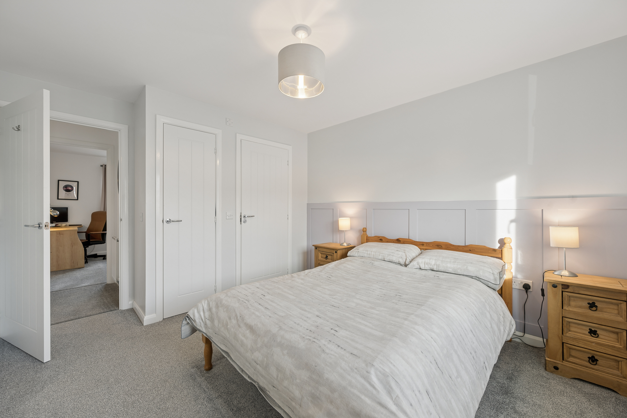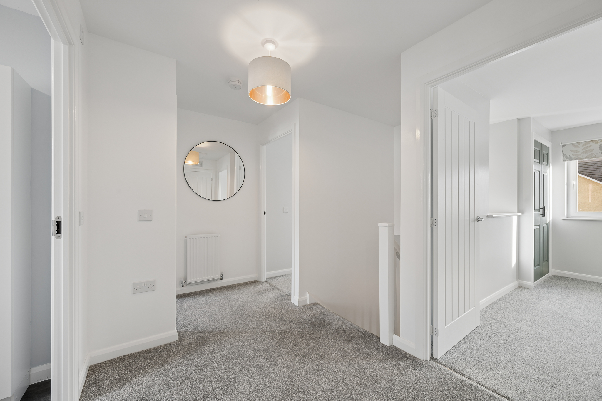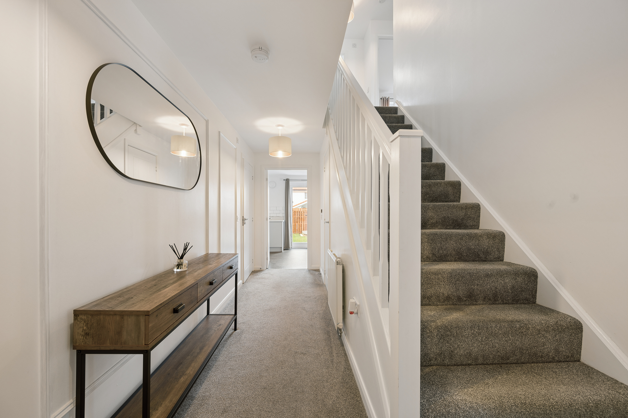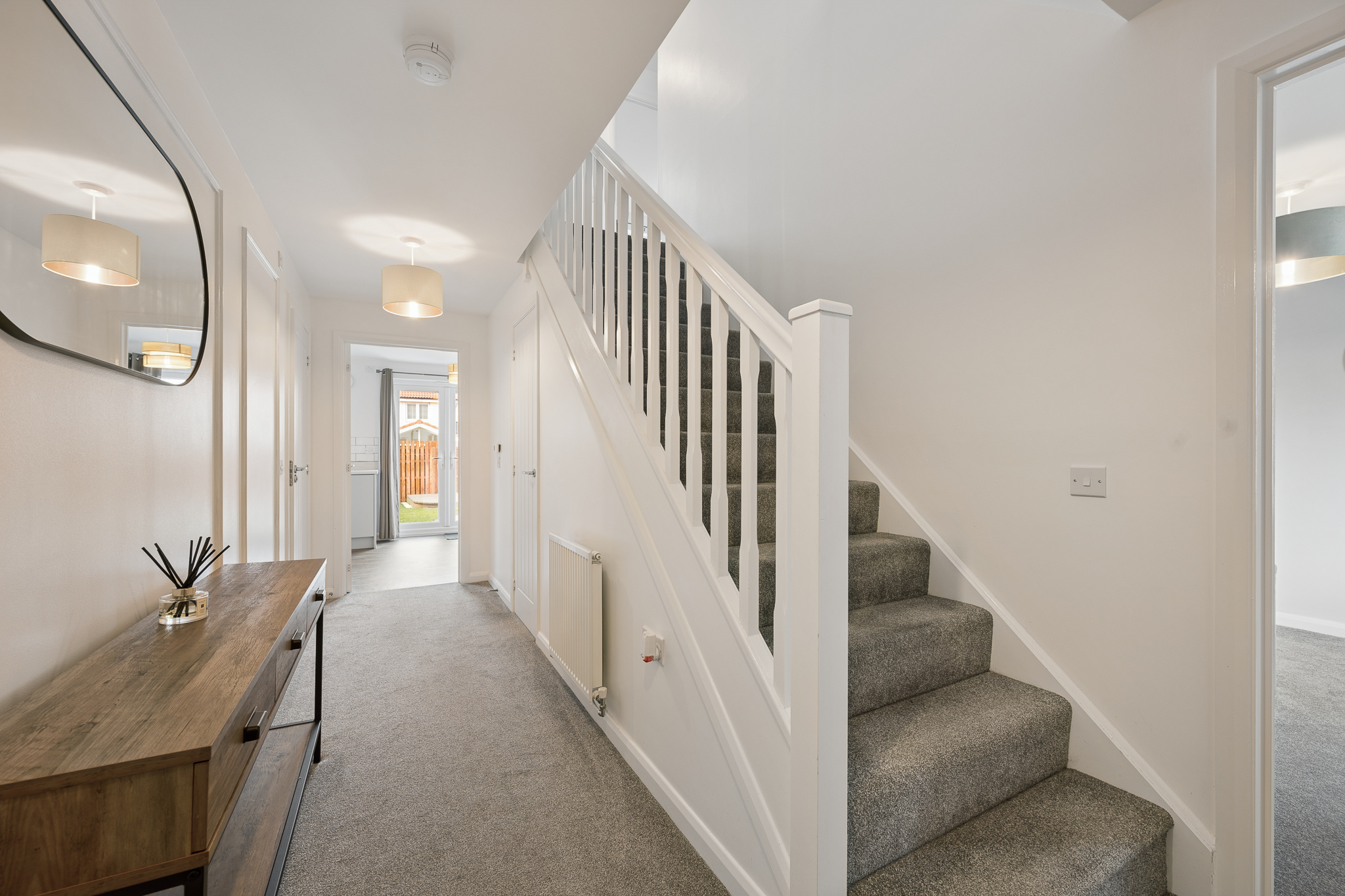 Step inside and you are welcomed by a bright, spacious hallway, finished with crisp white walls and elegant decorative panelling that immediately creates a sense of style and refinement. The soft grey carpeting running through the hallway and into the main living spaces adds warmth and comfort underfoot, while the generous proportions make this a truly impressive first impression. The hallway also benefits from excellent practicality, with useful storage cupboards including a generous under stairs cupboard, ensuring everyday essentials can be neatly tucked away.