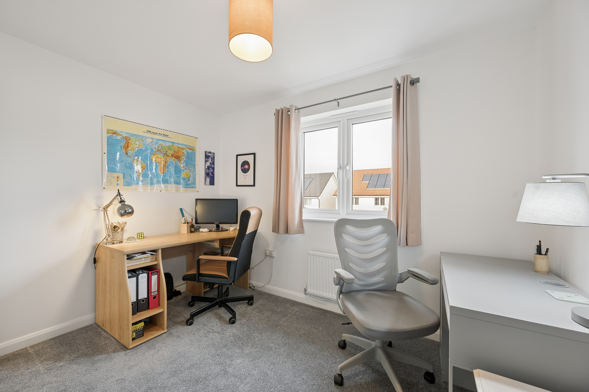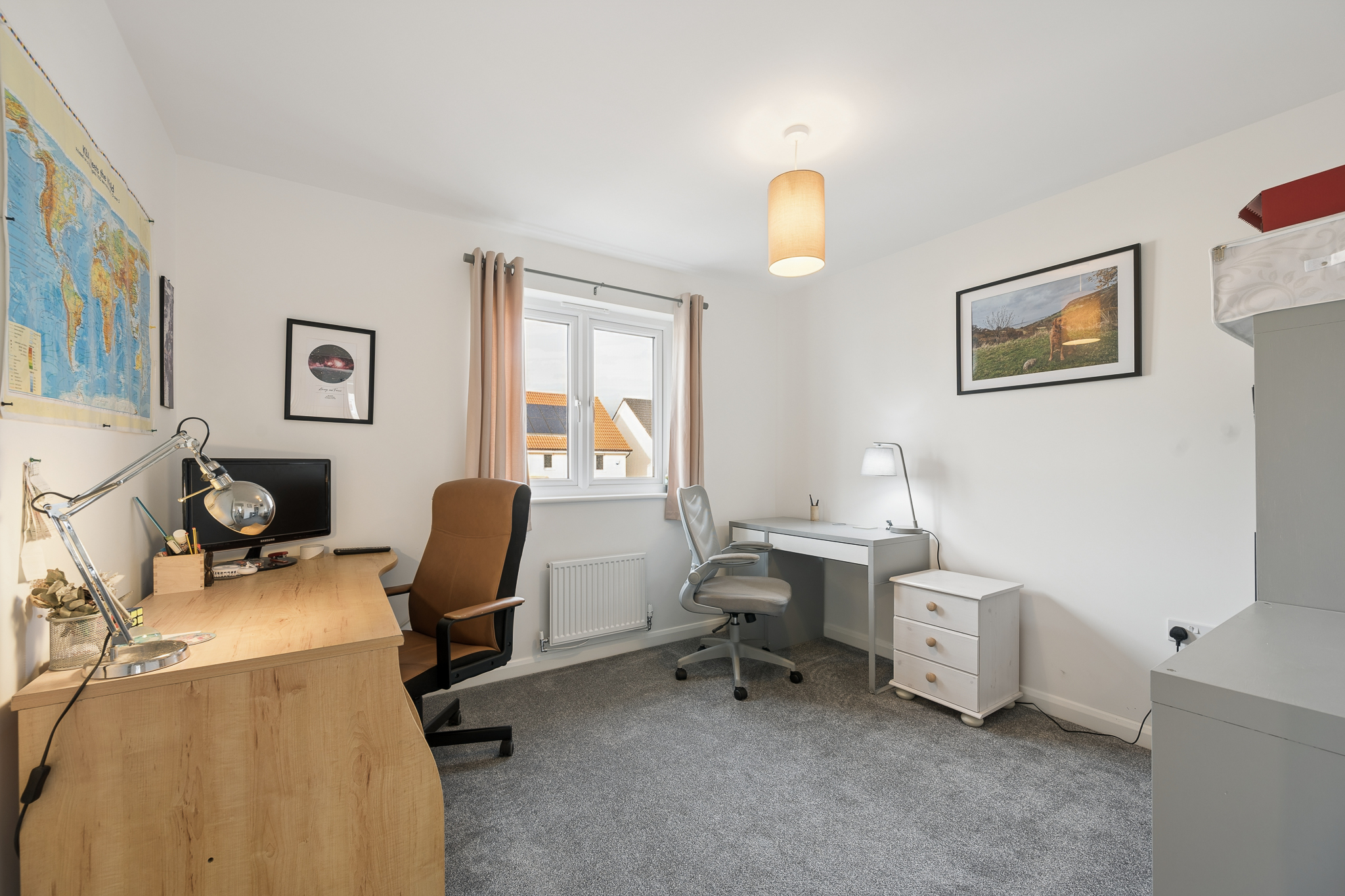 Bedroom Four, located to the rear right of the property, enjoys pleasant views over the garden and is currently set up as a home office, although it comfortably functions as another double bedroom depending on the needs of the new owners.