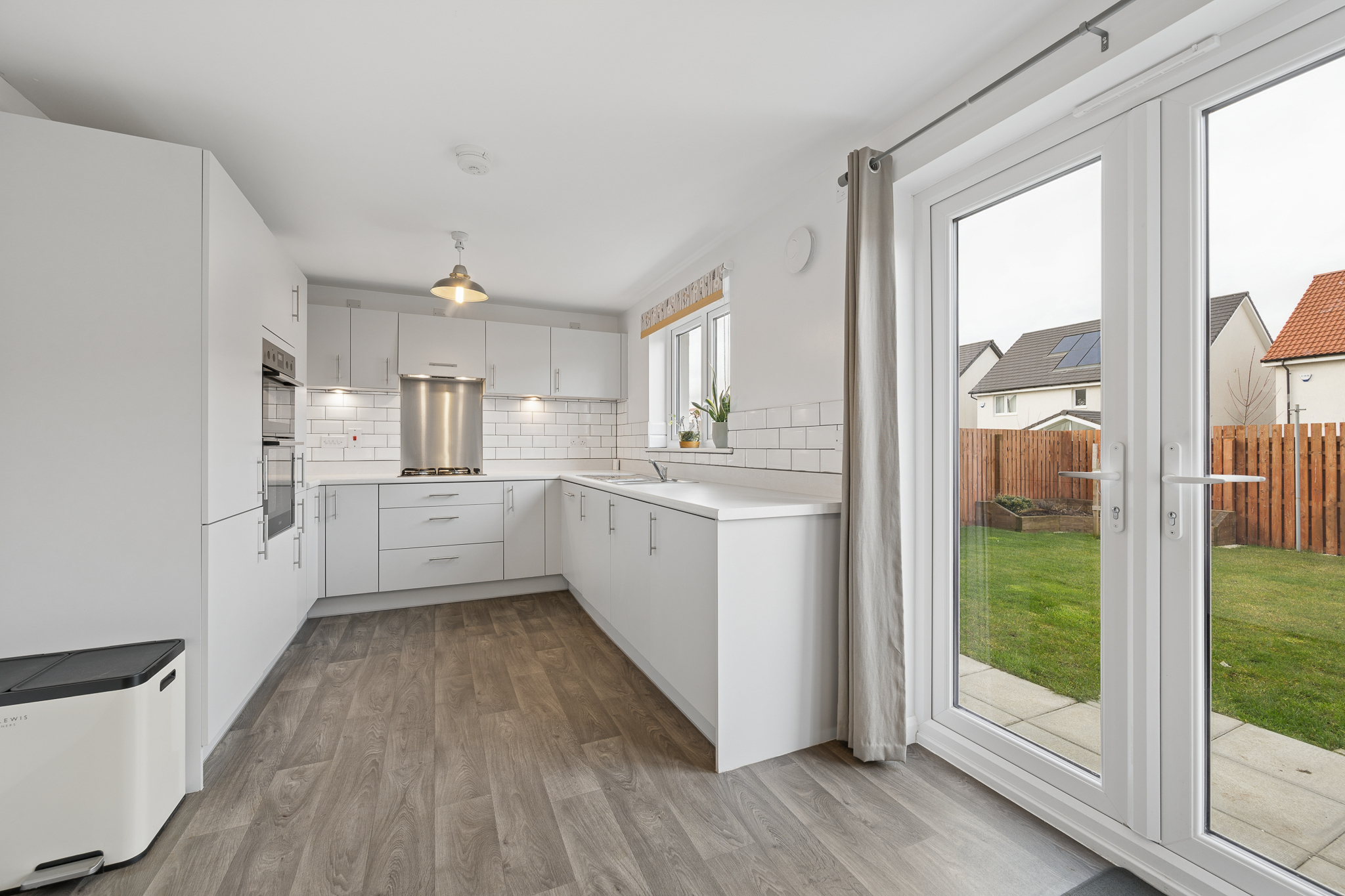 The modern kitchen is beautifully finished with sleek light-toned cabinetry, contemporary chrome handles, and light worktops that complement the clean aesthetic of the space. The stylish white metro tile splashback adds texture and visual interest while maintaining the bright, modern feel. A gas hob with stainless steel splashback and extractor hood provides a practical cooking space, while integrated appliances ensure the kitchen remains streamlined and uncluttered, including an integrated fridge freezer, dishwasher and washing machine. Thoughtfully designed storage solutions ensure everything has its place and the room also benefits from a fantastic additional storage cupboard, perfect for keeping household items neatly organised.