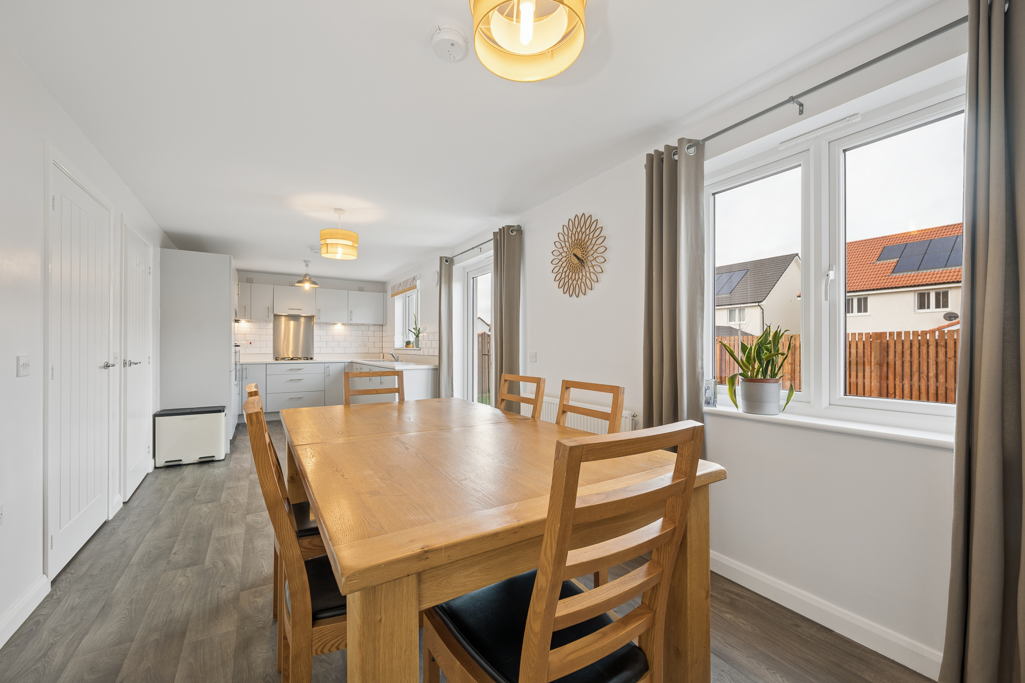 Flooded with natural light, the kitchen area also enjoys patio doors leading directly out to the rear garden, seamlessly connecting indoor and outdoor living.