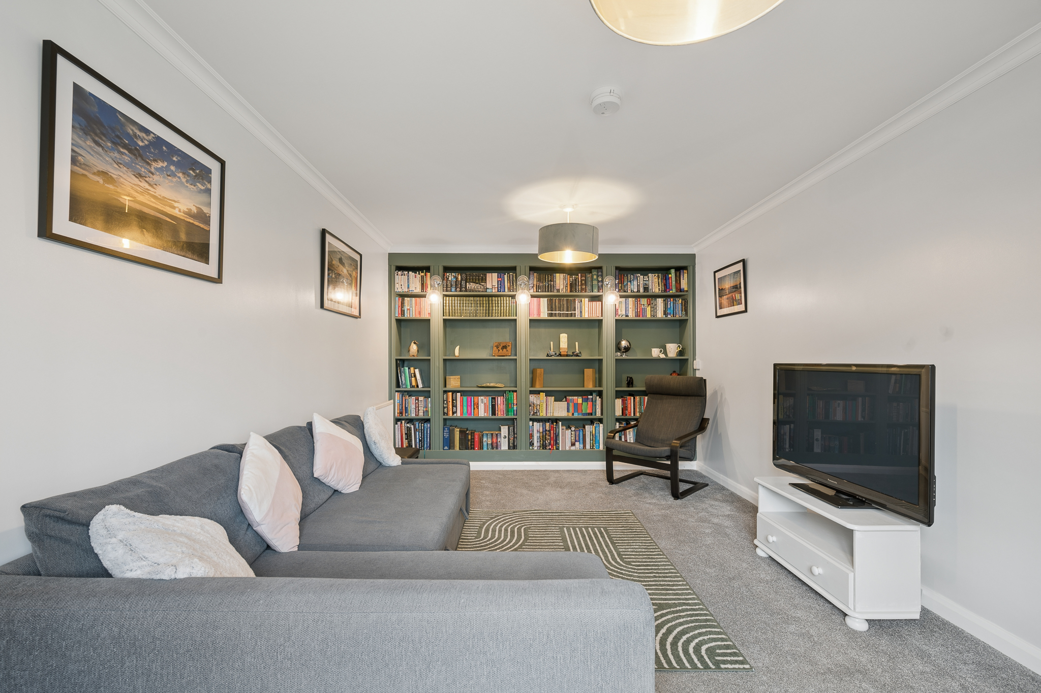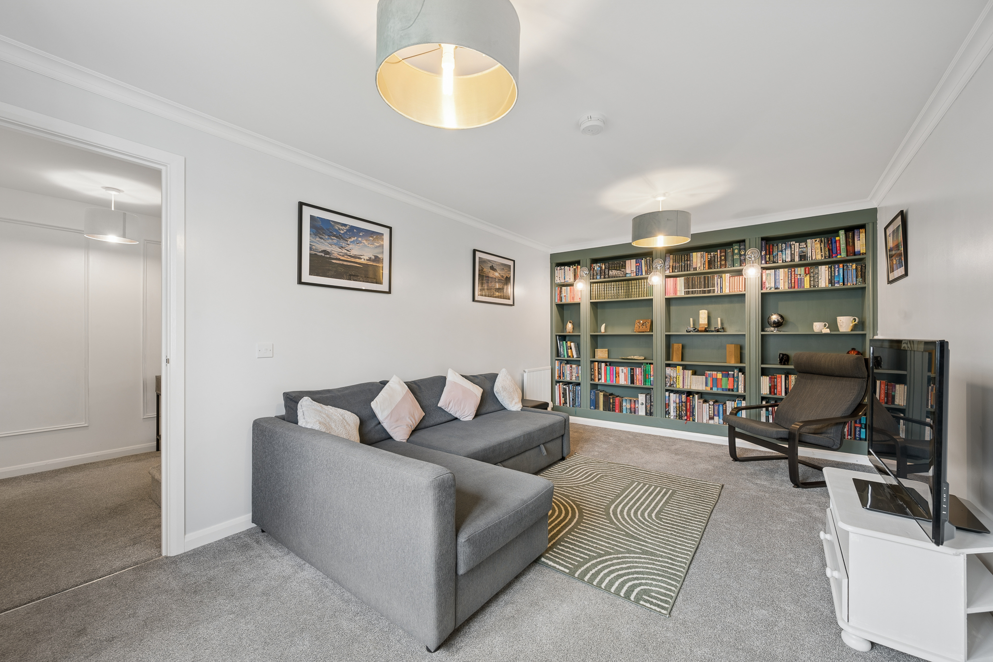Positioned to the front right of the property, the living room is a wonderfully calm and inviting space that offers the perfect blank canvas for buyers to make their own. A standout feature of this room is the bespoke built in shelving and bookcase wall, finished in a rich sage green tone, which instantly adds character, personality and a sense of luxury. The shelving is beautifully styled with integrated lighting, creating warm pools of light that highlight books, décor and personal pieces, giving the room a boutique, designer feel. This custom feature elevates the space beyond a typical new build living room and creates a stunning focal point that feels both sophisticated and homely.