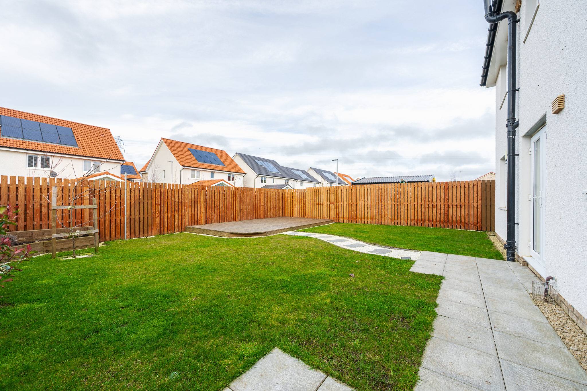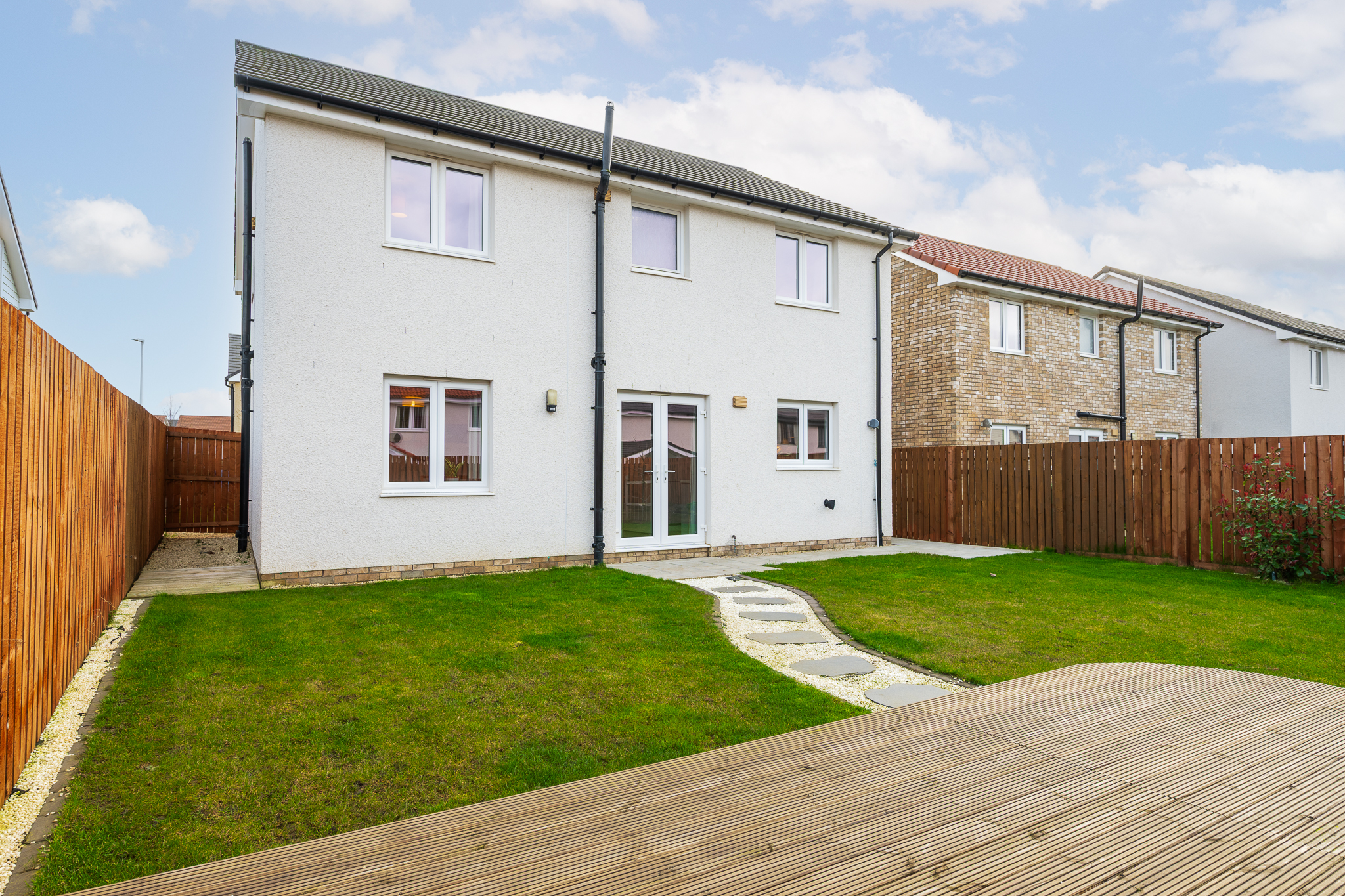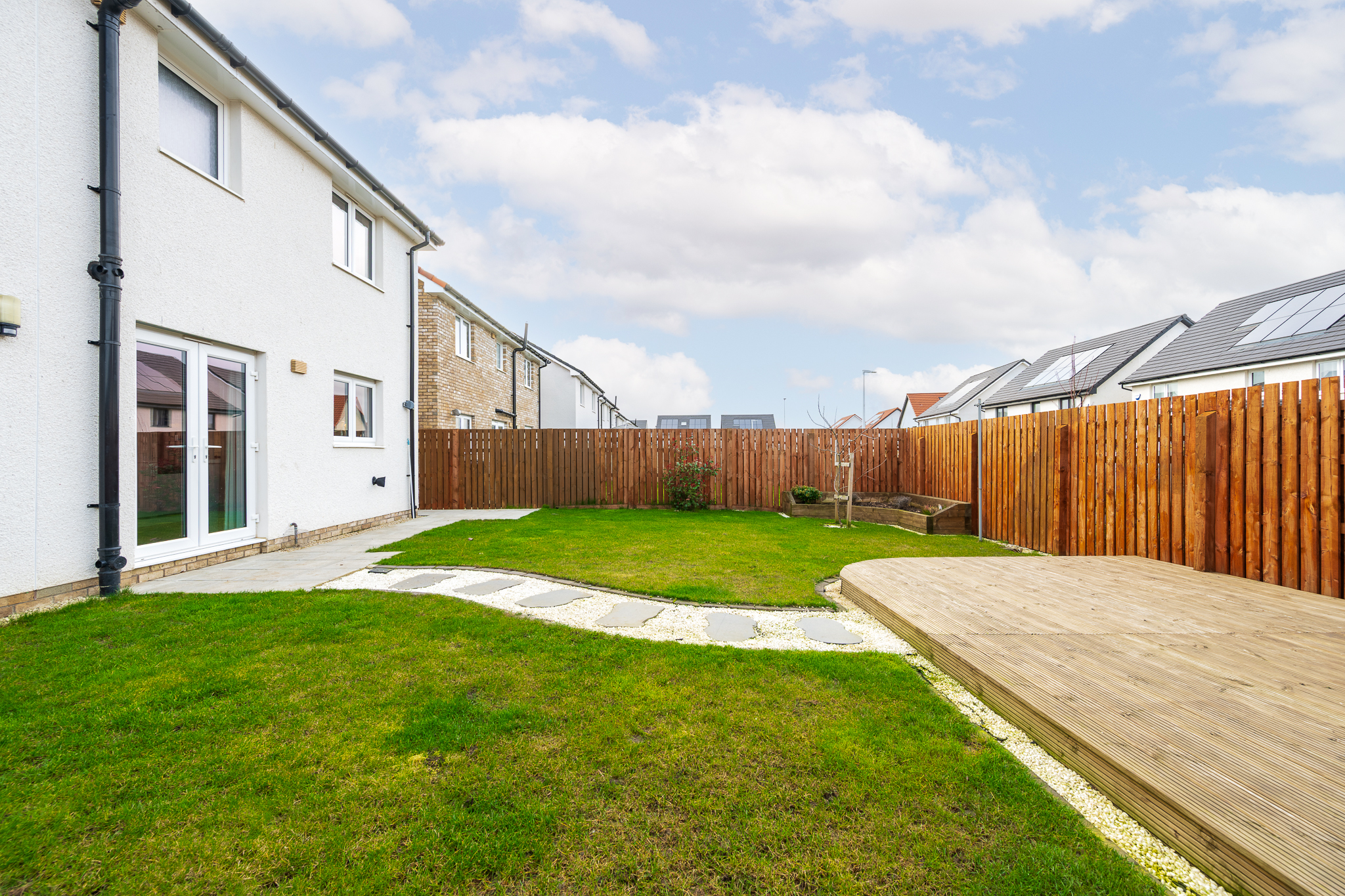 The rear garden has been beautifully landscaped, creating a fantastic outdoor retreat. A decked seating area positioned to the rear of the property captures the evening sun, making it the ideal spot for summer dining, relaxing with a drink after work or hosting friends and family. A pathway leads through the garden, adding structure and interest to the space, while the overall layout offers a balance of seating areas and lawn, creating a garden that is both attractive and easy to maintain.