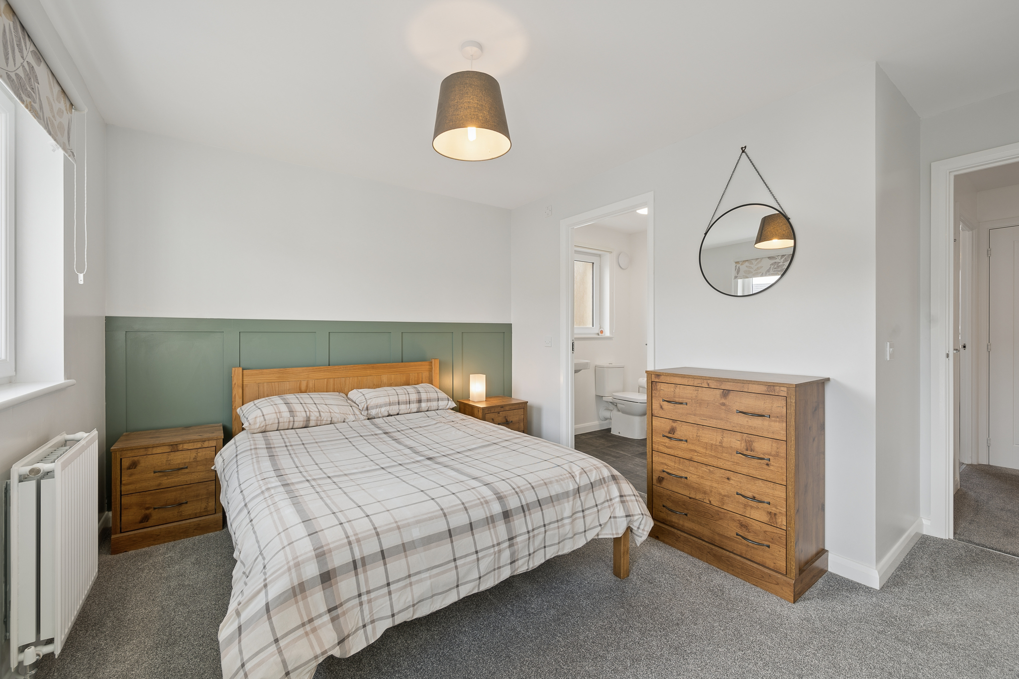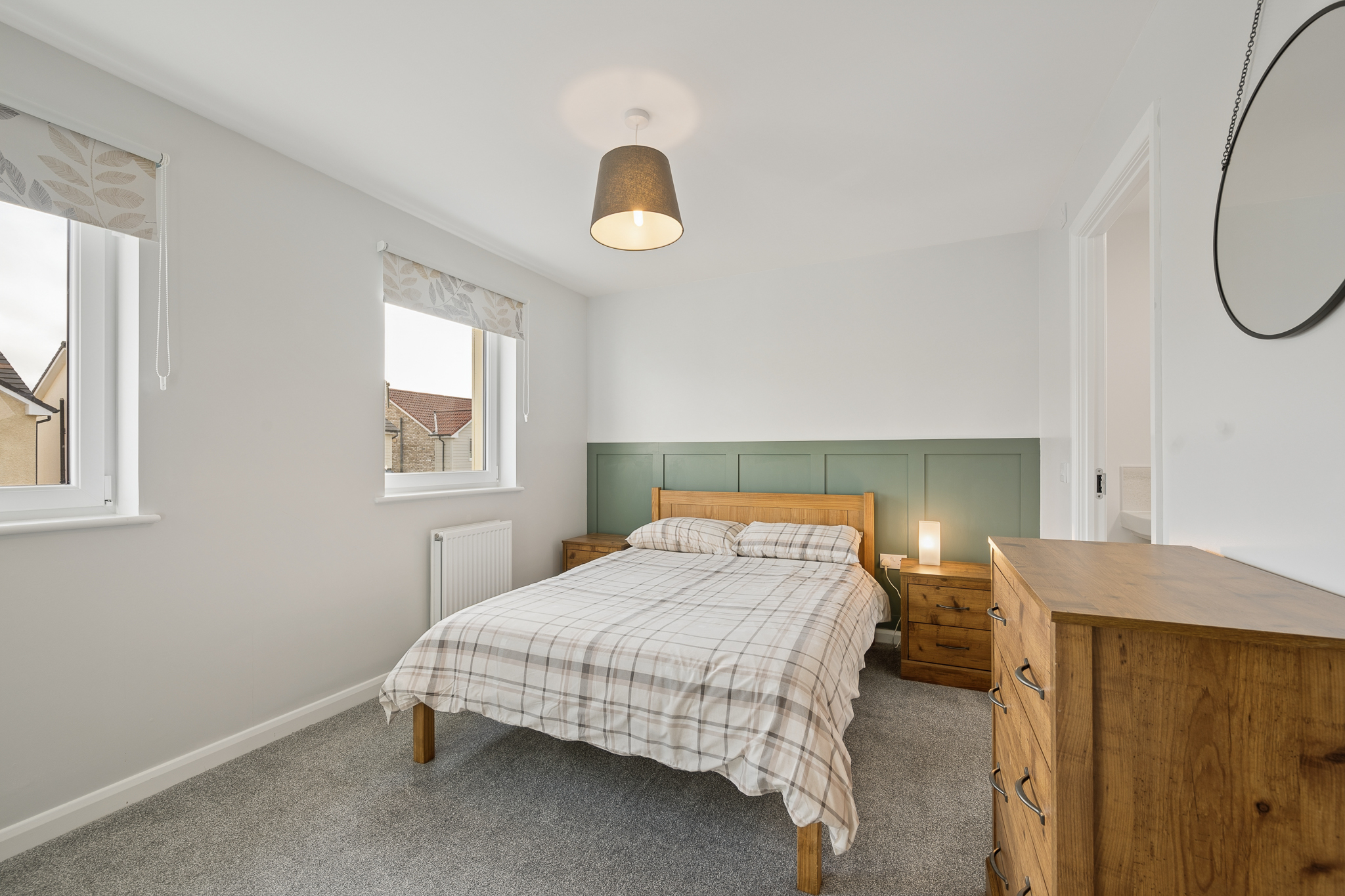 The principal bedroom, positioned to the front right of the property, is a beautifully proportioned retreat featuring built-in wardrobe storage and a stylish en suite shower room with double shower, offering both comfort and convenience.