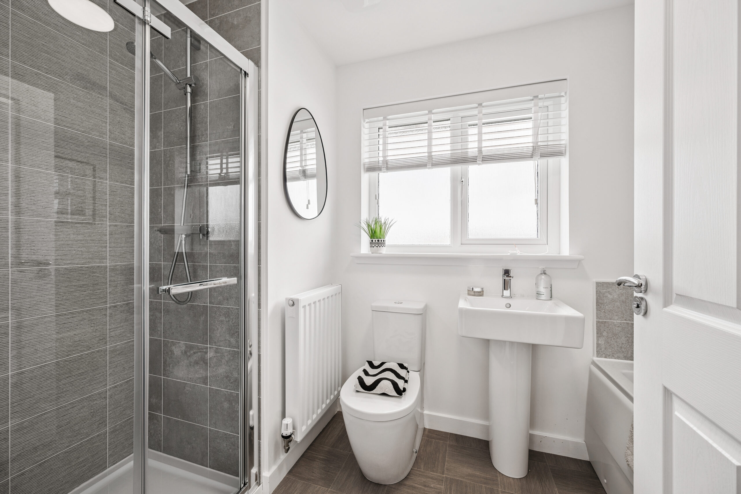 A luxurious family bathroom completes the upper level, finished to a high standard with partial tiling. This four-piece suite includes a large bath and separate walk-in shower, offering the best of both worlds and providing a relaxing space for all the family.