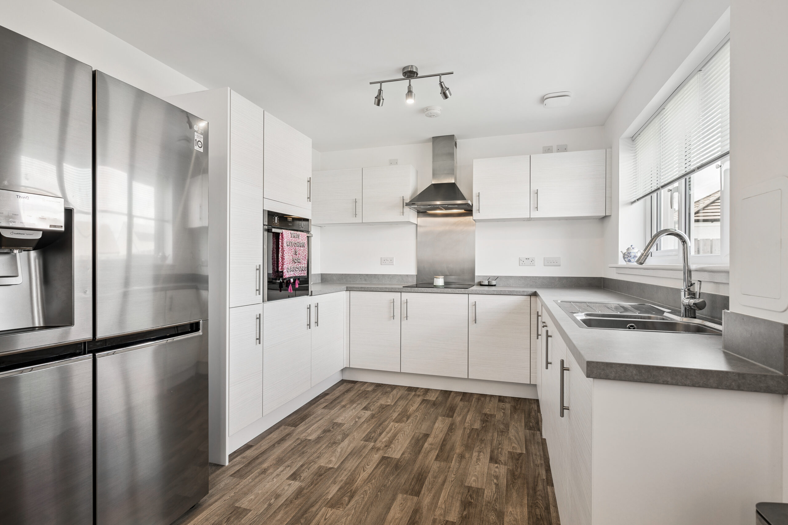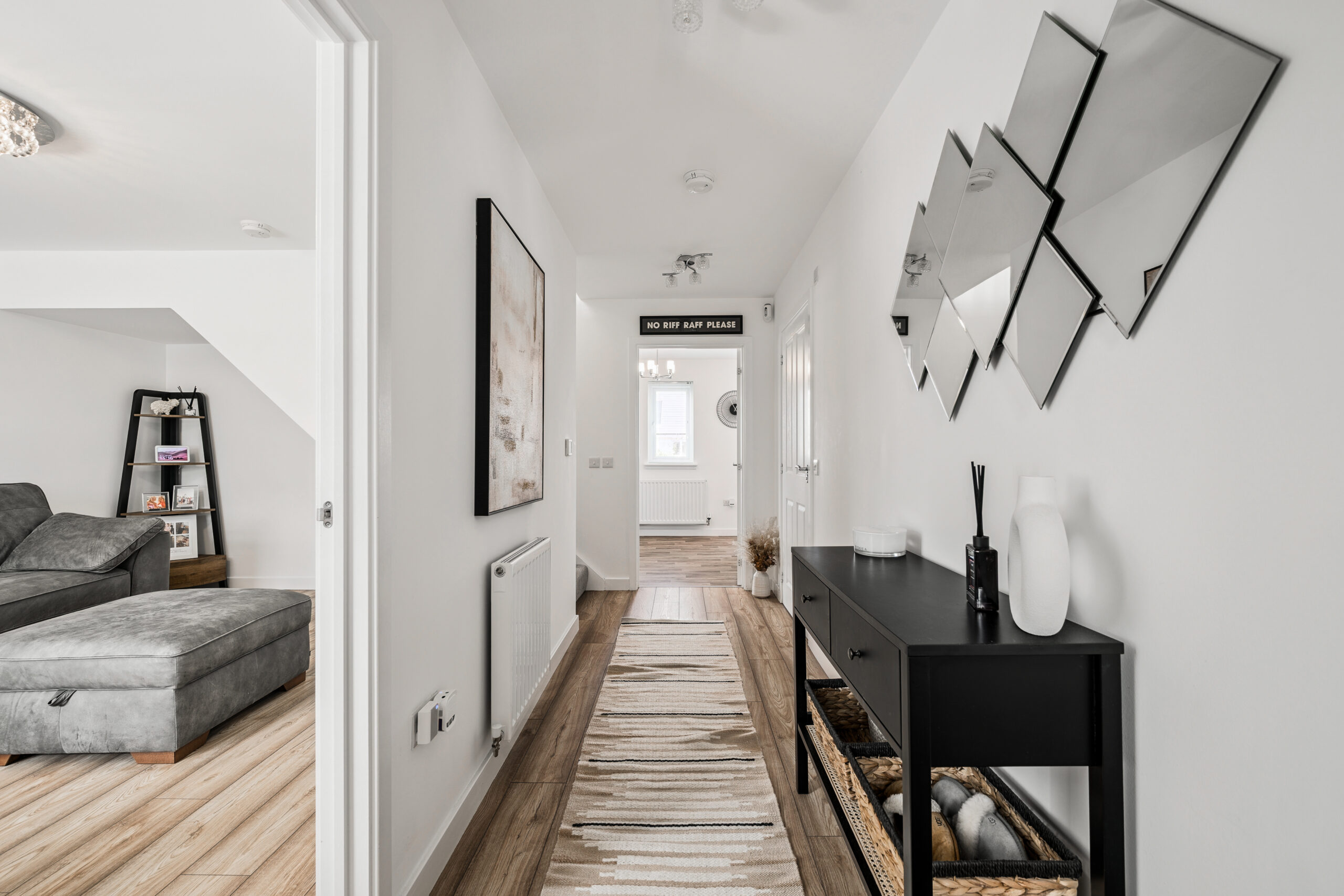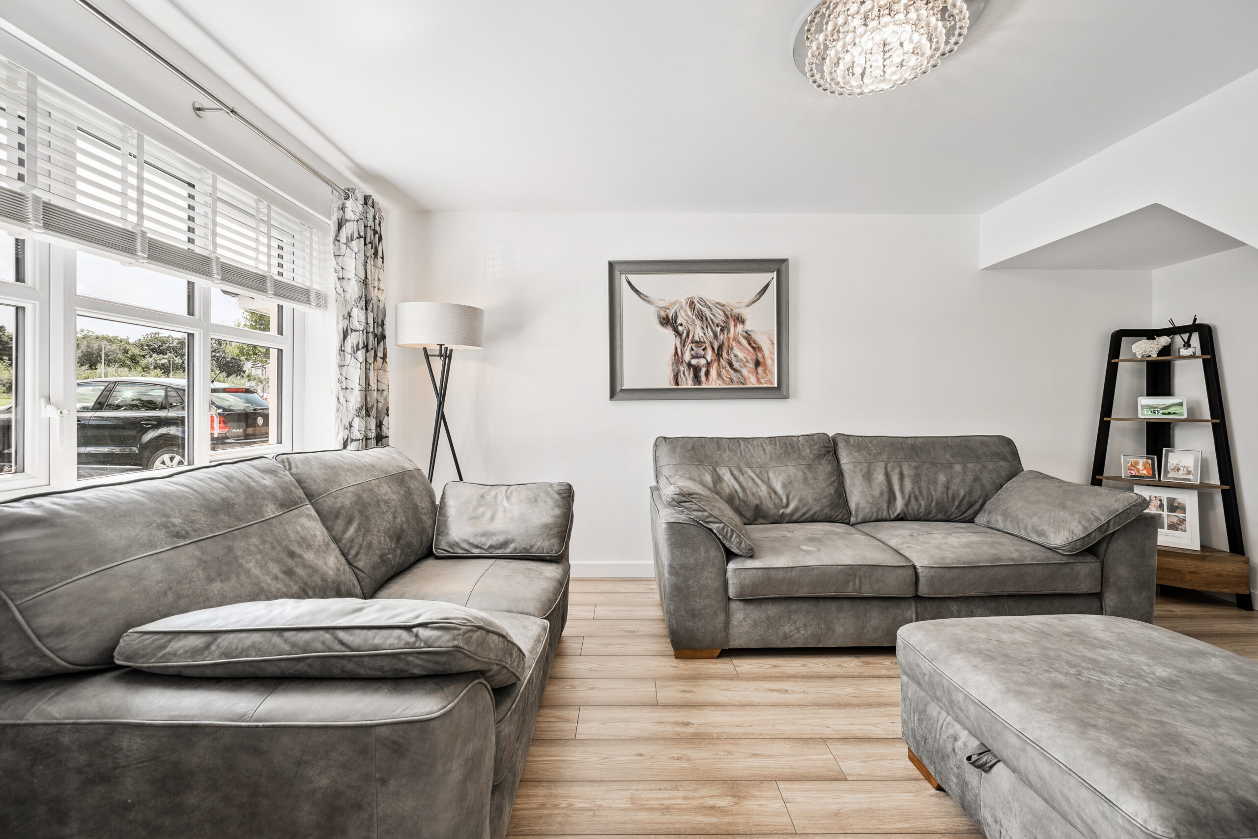 Upon entering, you are welcomed into a bright and inviting hallway, featuring fresh flooring and a neutral colour scheme that sets the tone for the rest of the home. The ground floor is well laid out, starting with an expansive lounge to the front of the property. Flooded with natural light from a large window, this room comfortably accommodates multiple sofas and offers the perfect setting for family time, entertaining, or quiet evenings in. The neutral décor enhances the airy, open feel and provides a blank canvas for personalisation.