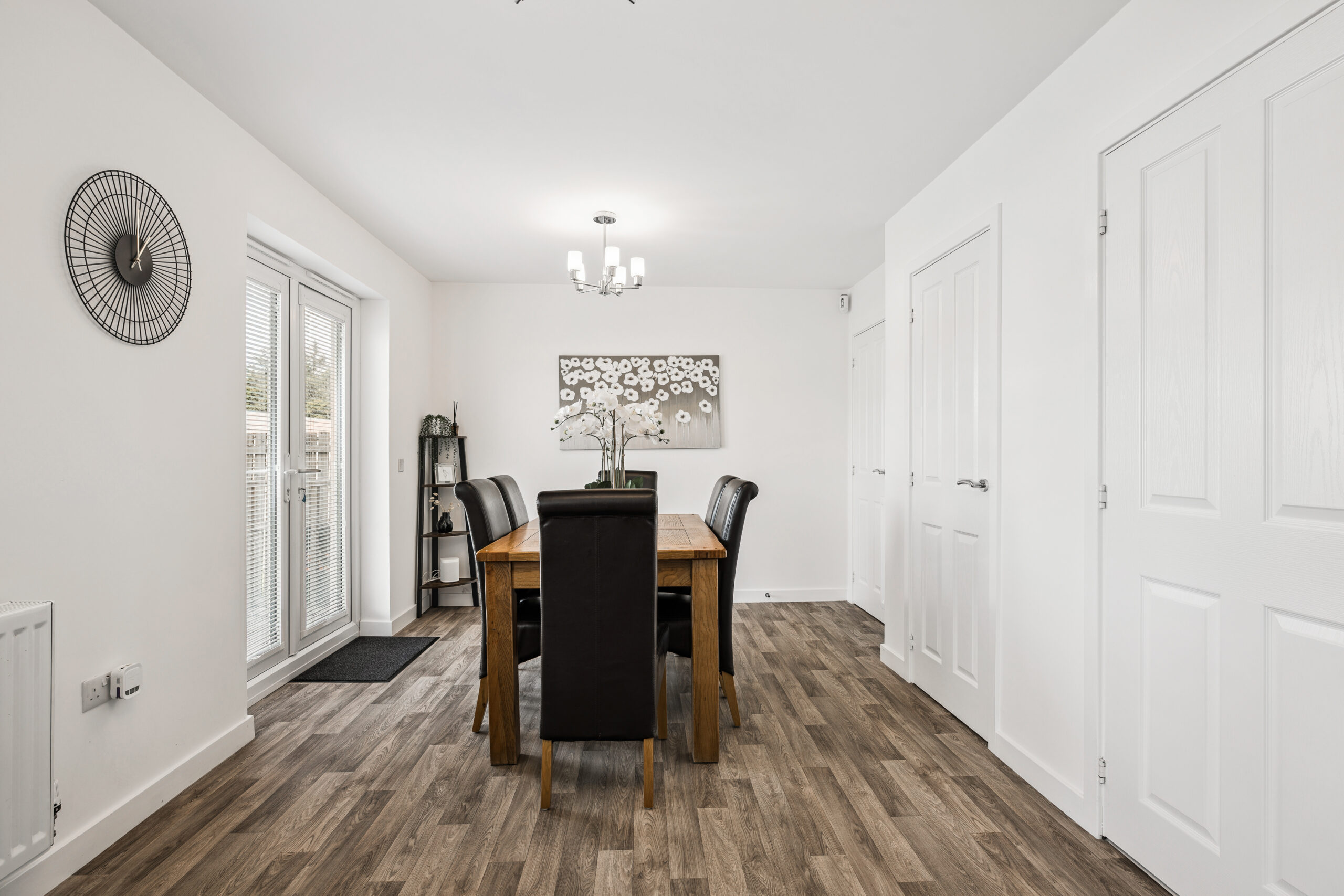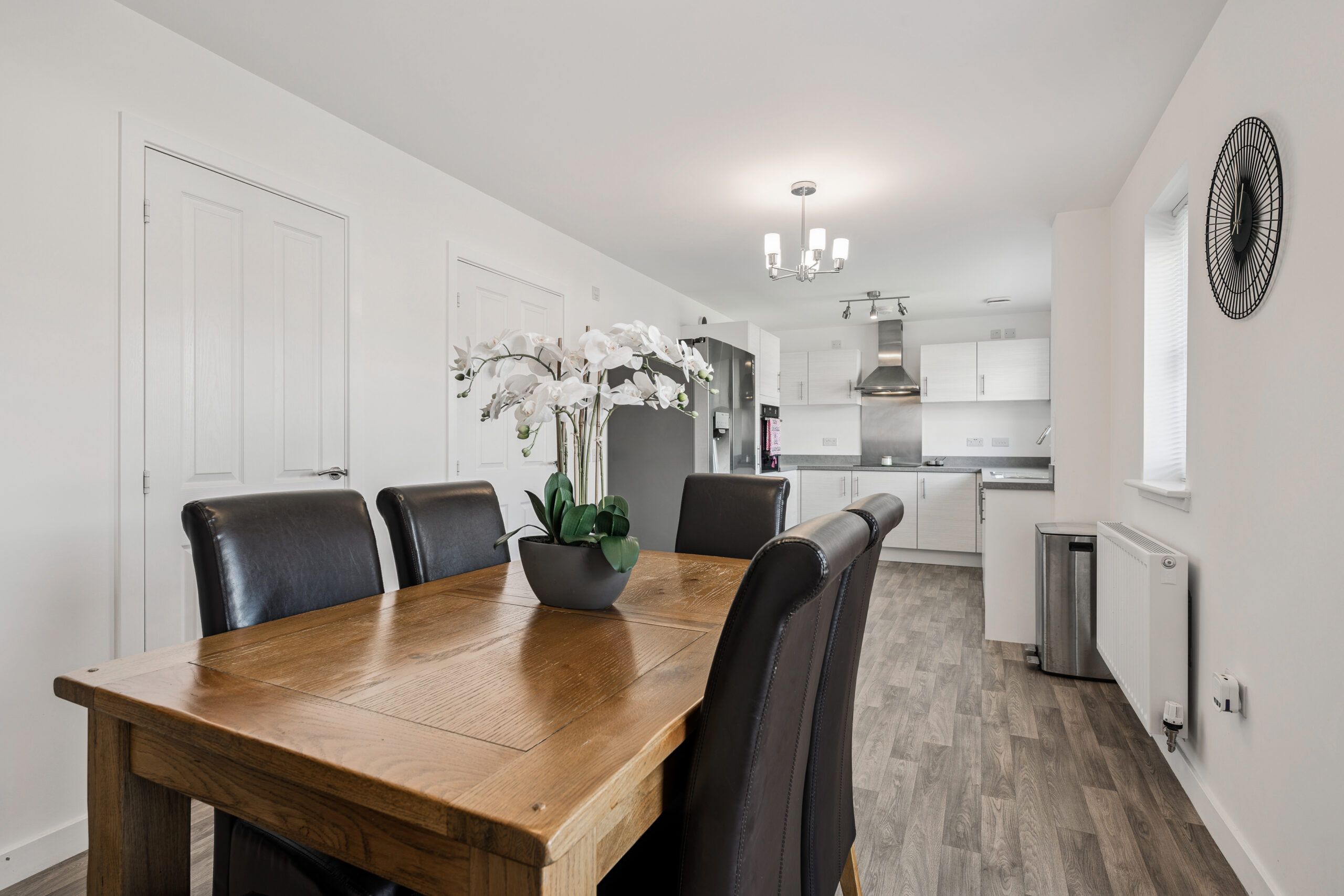 At the heart of the home is a stunning open-plan kitchen and dining area. Designed for modern living, the kitchen boasts sleek white cabinetry, contrasting dark worktops, and integrated appliances including a dishwasher, oven, and hob. There is ample storage and preparation space, making it both stylish and functional. The dining area currently seats six, with plenty of room to accommodate larger gatherings. With views over the rear garden, this sociable space is ideal for everyday meals or entertaining friends and family.