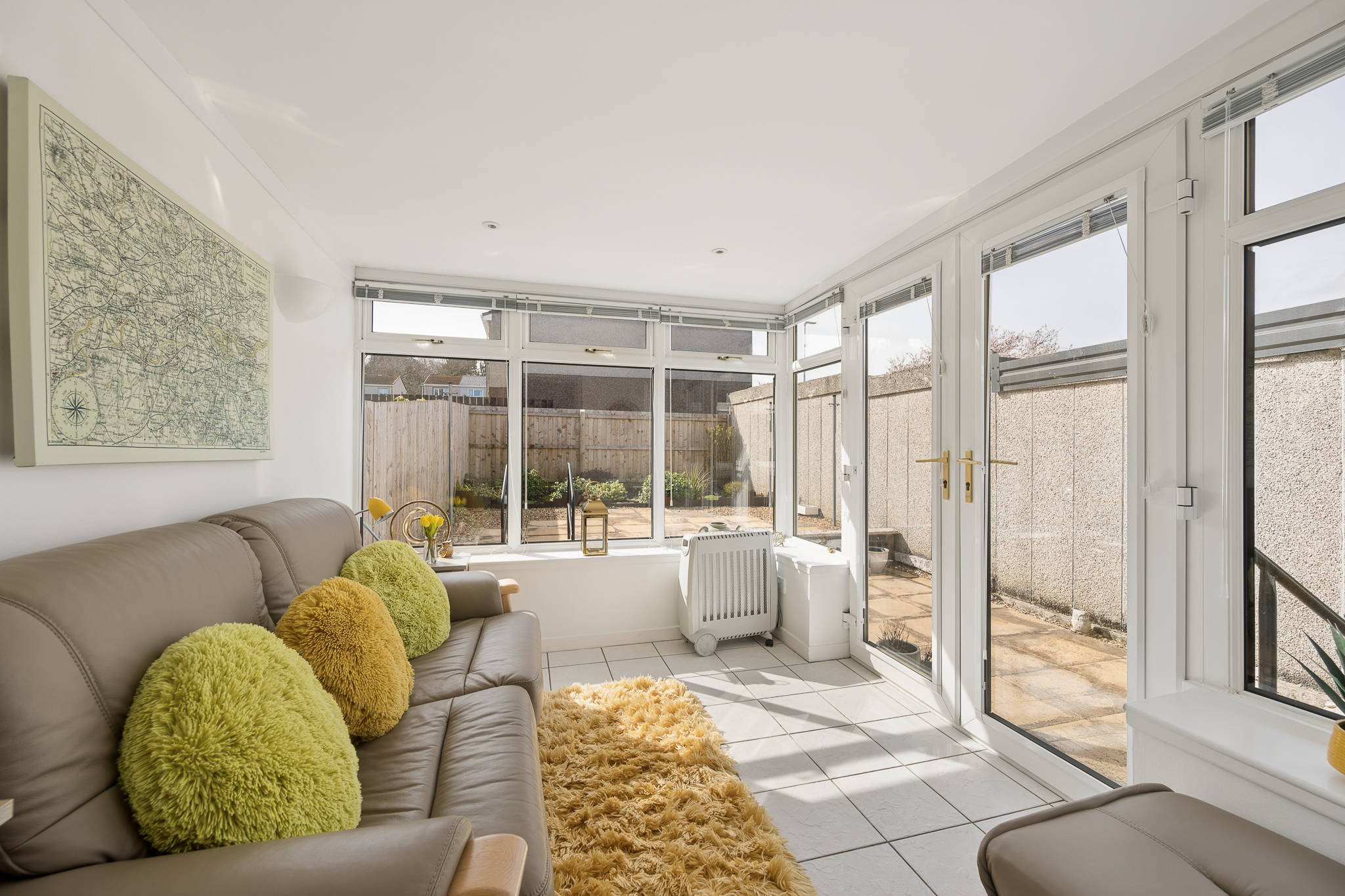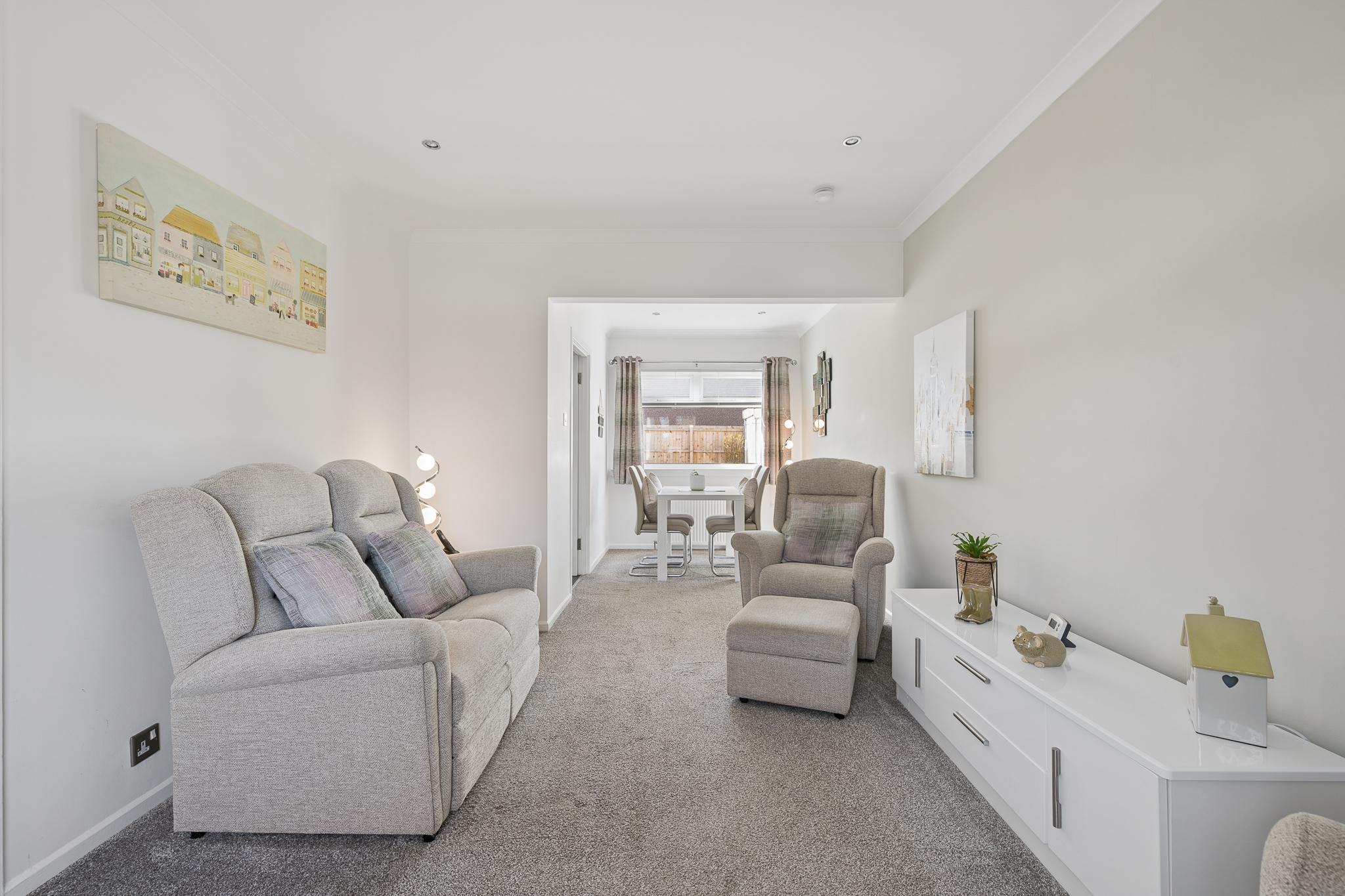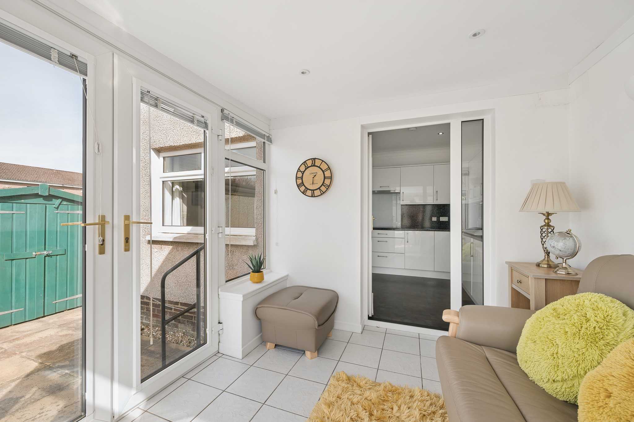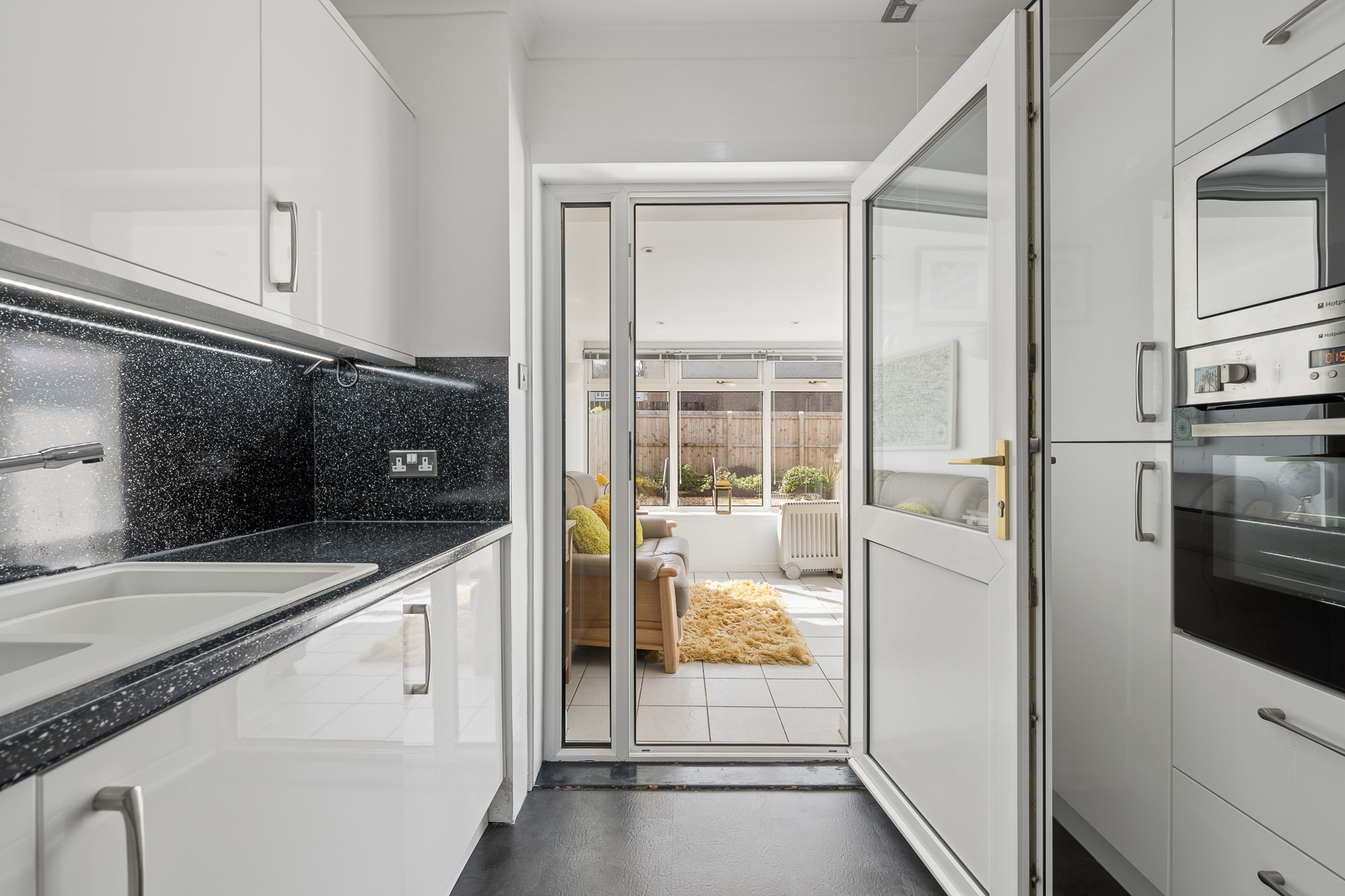 Moving through seamlessly, the kitchen is fitted with contemporary white cabinetry and sleek worktops, complemented by integrated appliances and ample storage, from here you will find the beautiful sunroom, a fantastic addition to any home.