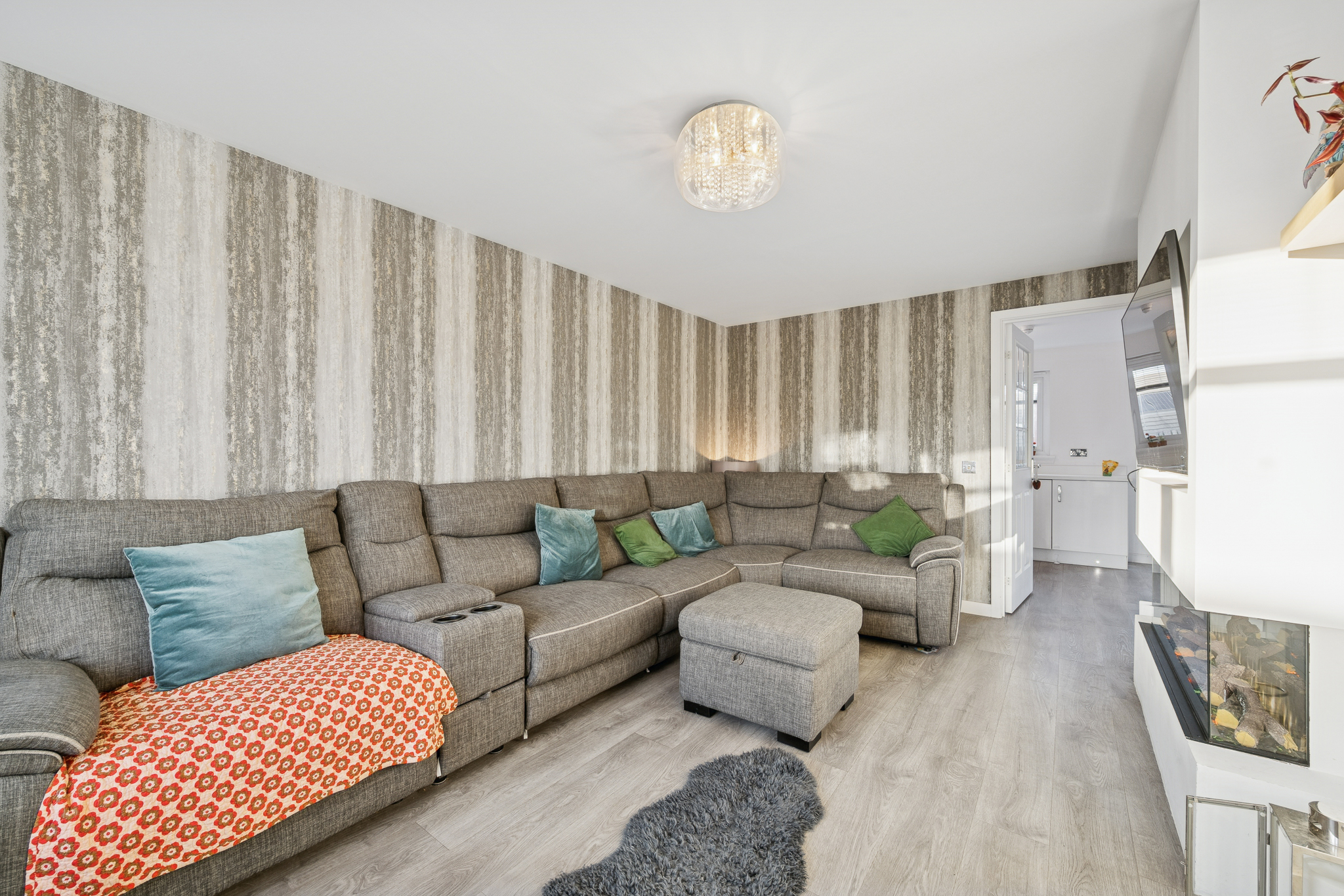 To the left-hand side, the main lounge provides a generous and cosy retreat. Featuring a large front-facing window and a stylish media wall, this room can comfortably accommodate a large corner sofa and additional furnishings, creating a relaxing space for the whole family. With no homes directly overlooking, it maintains a lovely sense of privacy.