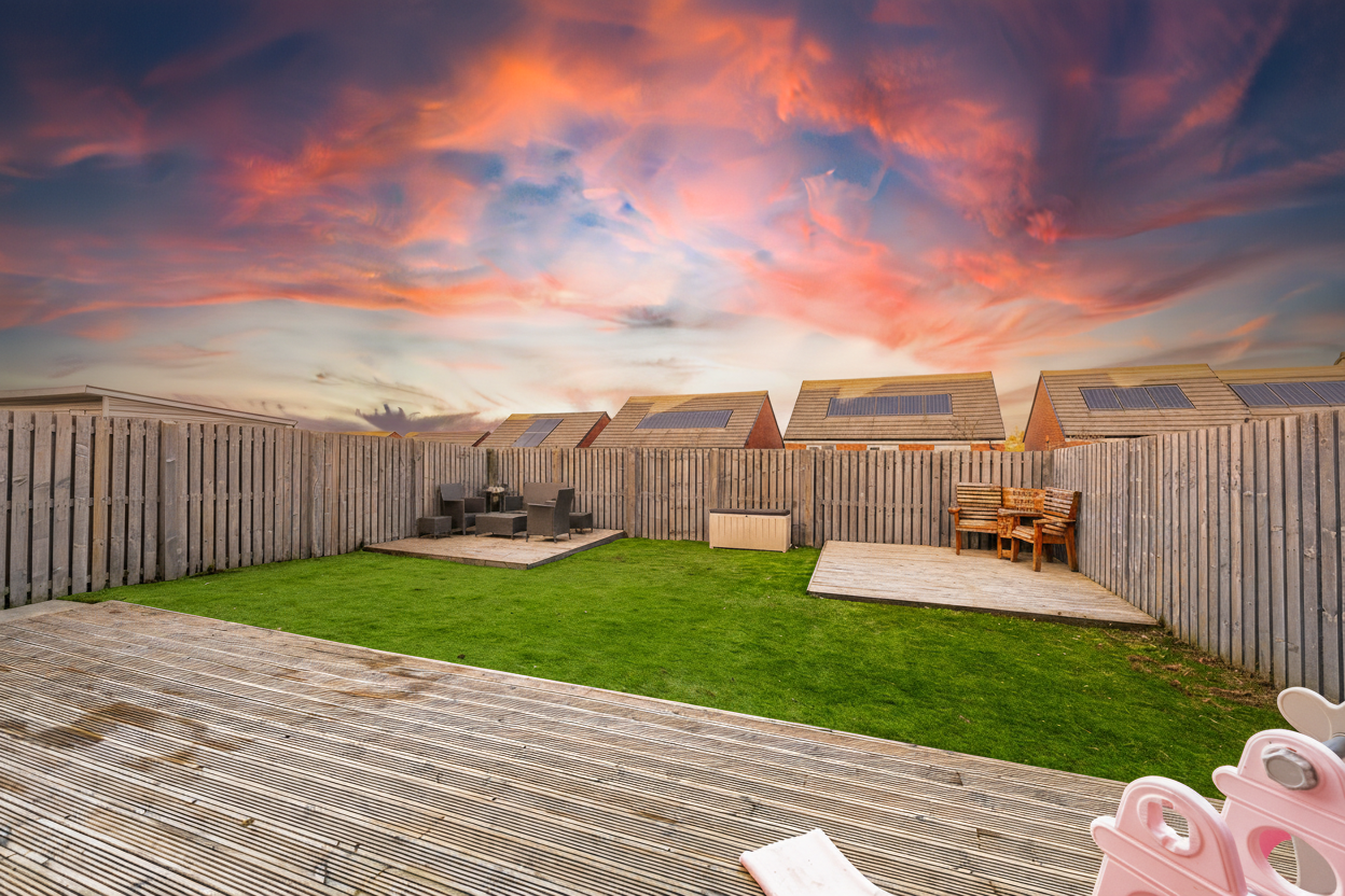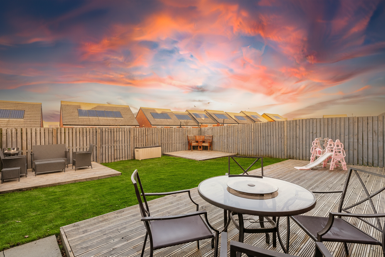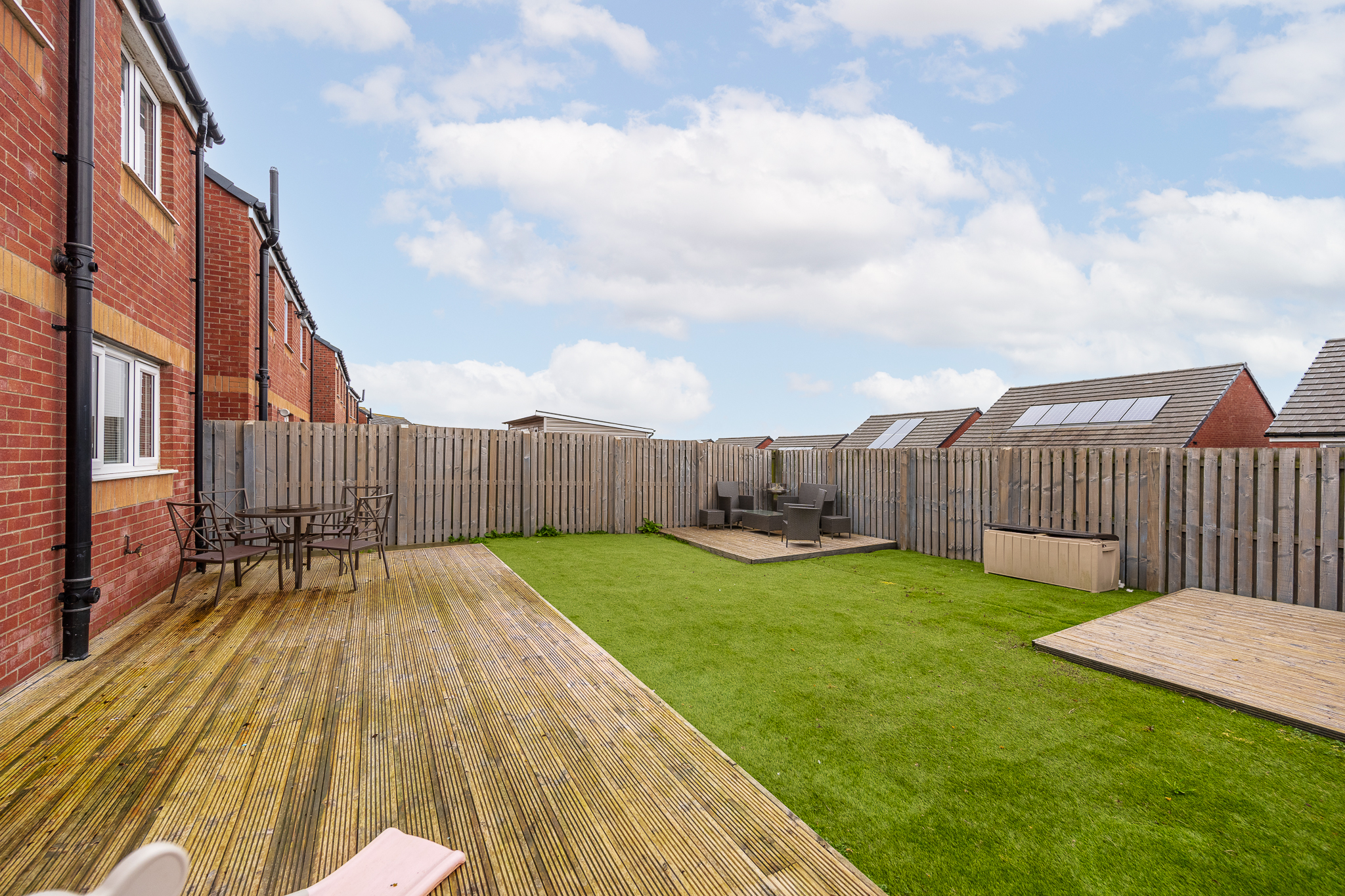 Externally, the rear garden offers a peaceful and low-maintenance retreat with decking in both corner sections, providing the perfect spots to enjoy the sunlight throughout the day. The space feels private and versatile, ideal for outdoor dining, barbecues, or relaxing in the warmer months. To the front, a three car driveway provides ample parking, along with additional on-street availability for guests.