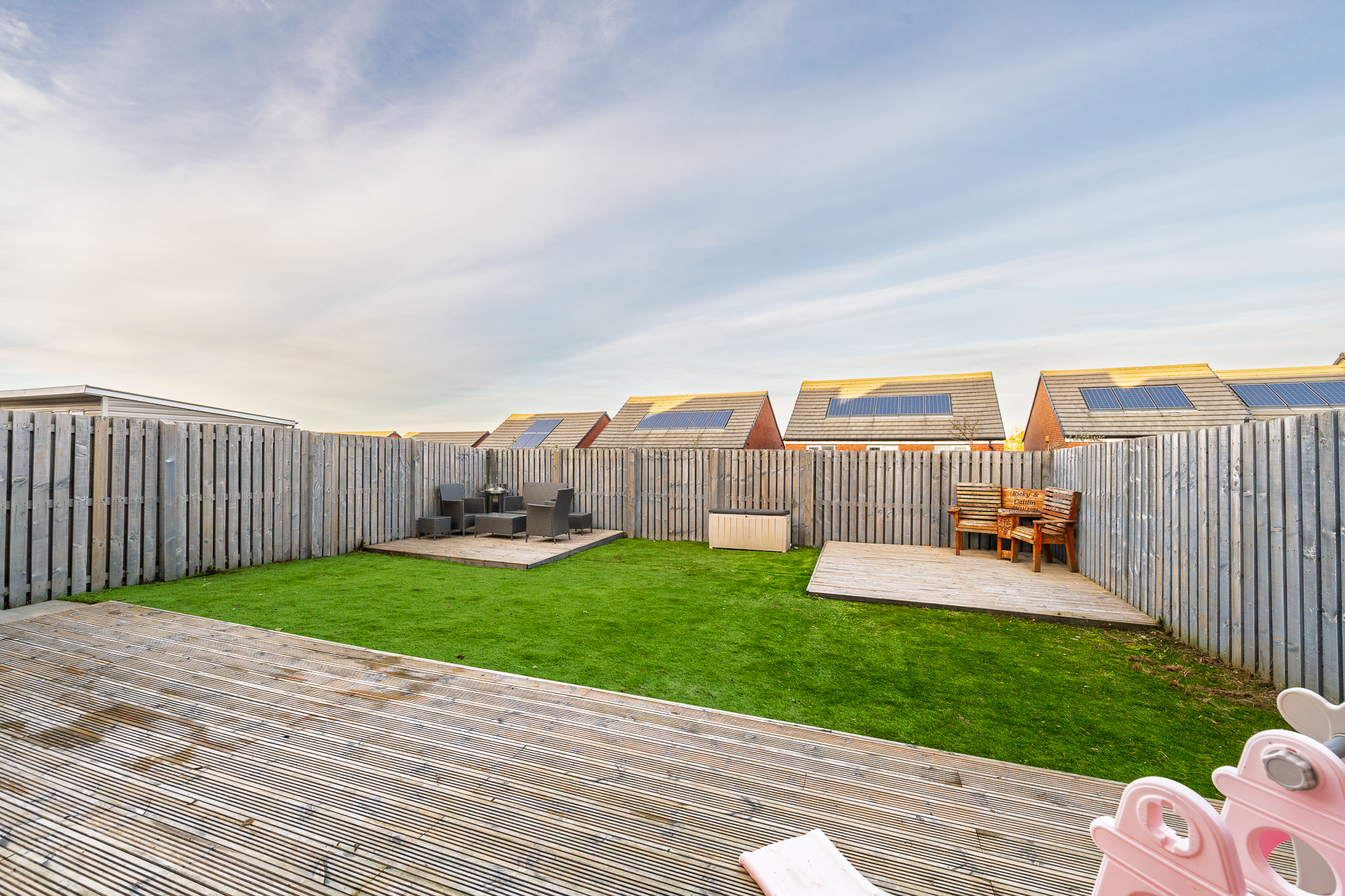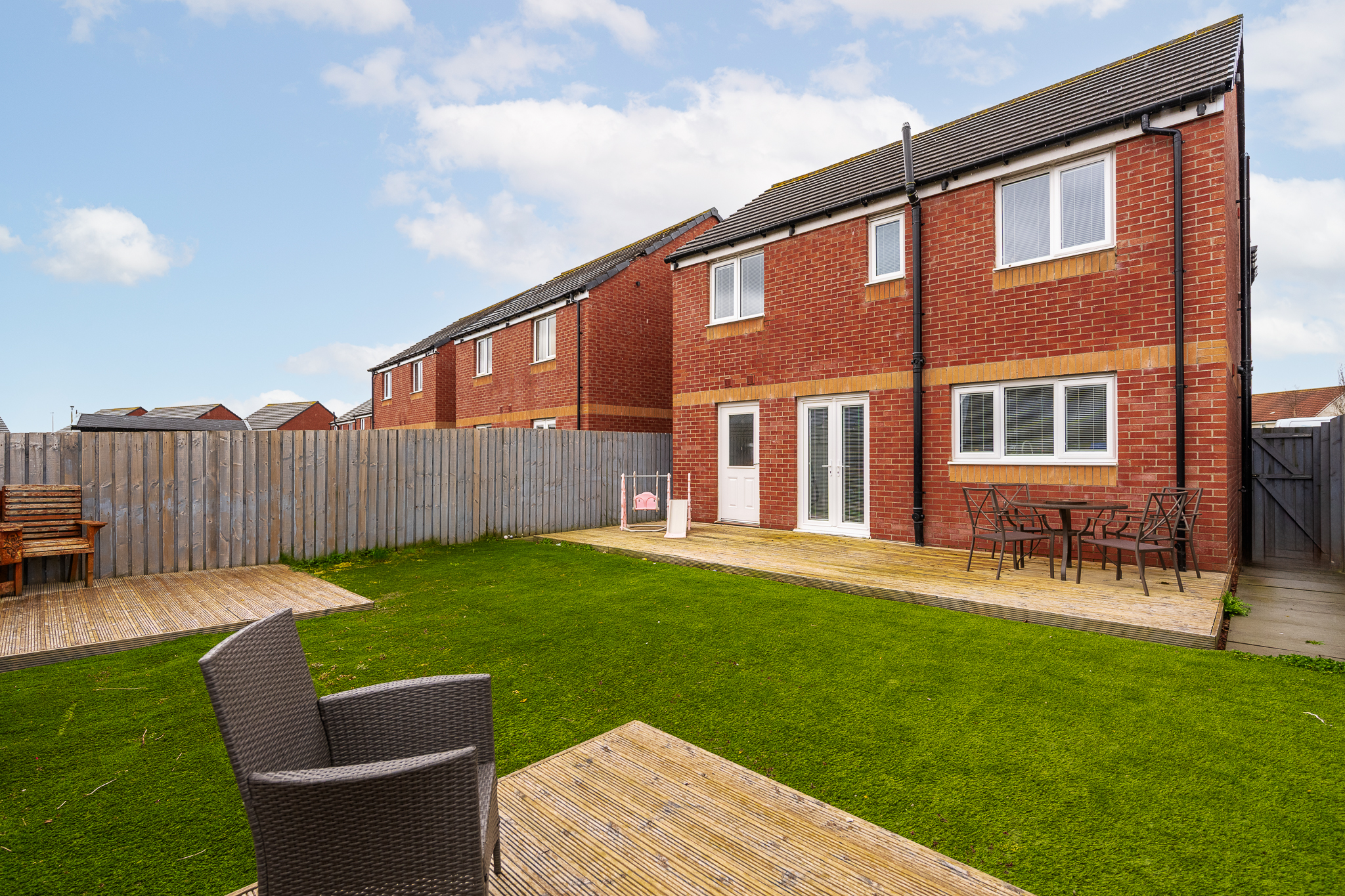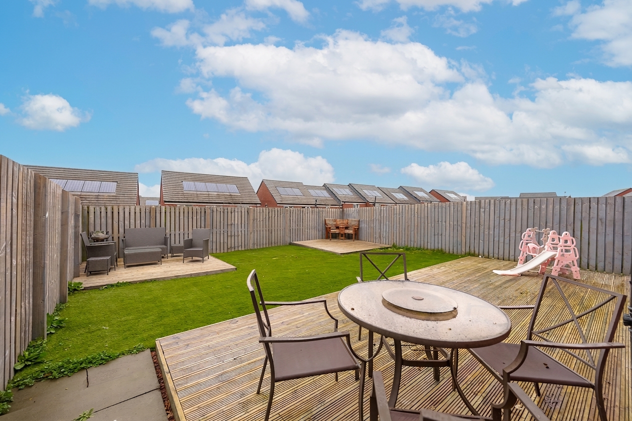 Externally, the rear garden offers a peaceful and low-maintenance retreat with decking in both corner sections, providing the perfect spots to enjoy the sunlight throughout the day. The space feels private and versatile, ideal for outdoor dining, barbecues, or relaxing in the warmer months. To the front, a three car driveway provides ample parking, along with additional on-street availability for guests.