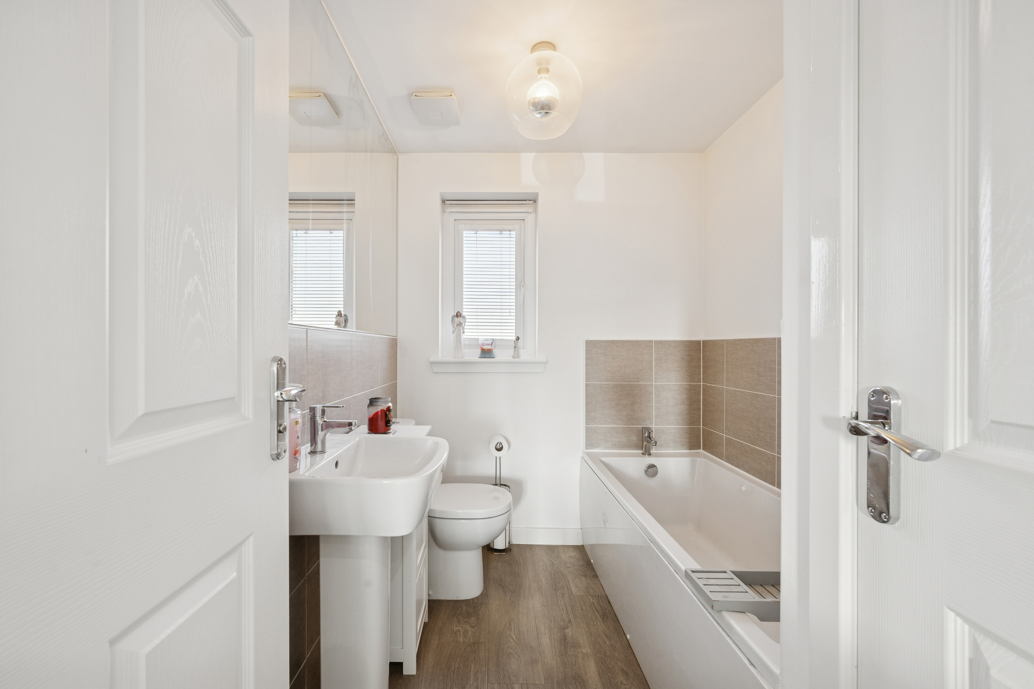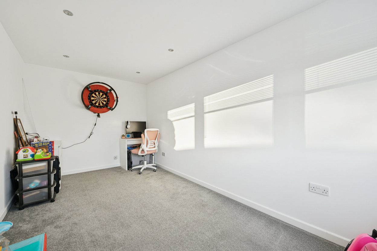 Bedroom two can easily accommodate a king-size or double bed, with space for wardrobes and bedside furniture. Bedroom three also fits a double bed and benefits from a fitted cupboard for extra storage, while bedroom four features its own fitted wardrobe, offering practicality and space across every room. The family bathroom is centrally located and finished with half-wall tiling around the bathtub and basin, chrome accents, and a large fitted mirror that enhances the sense of space.