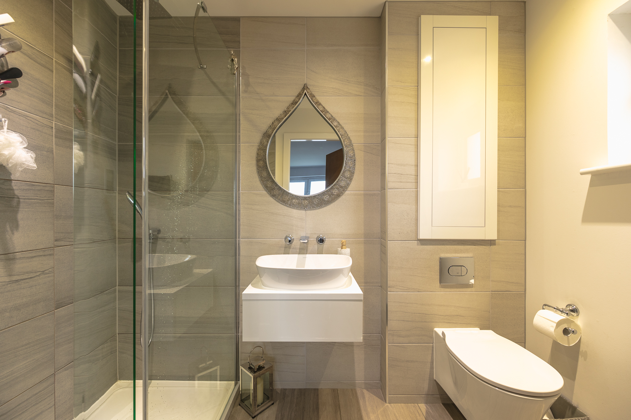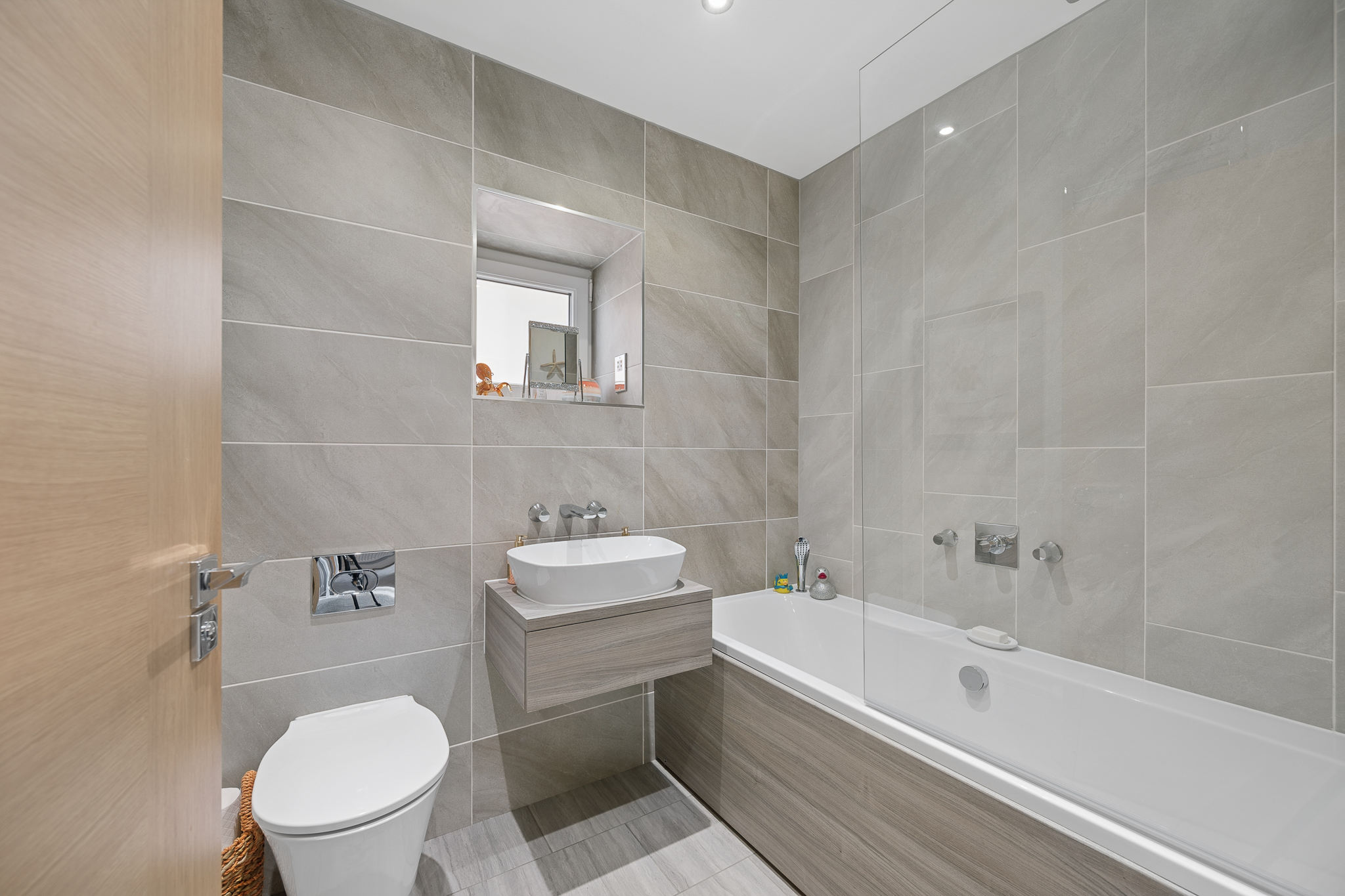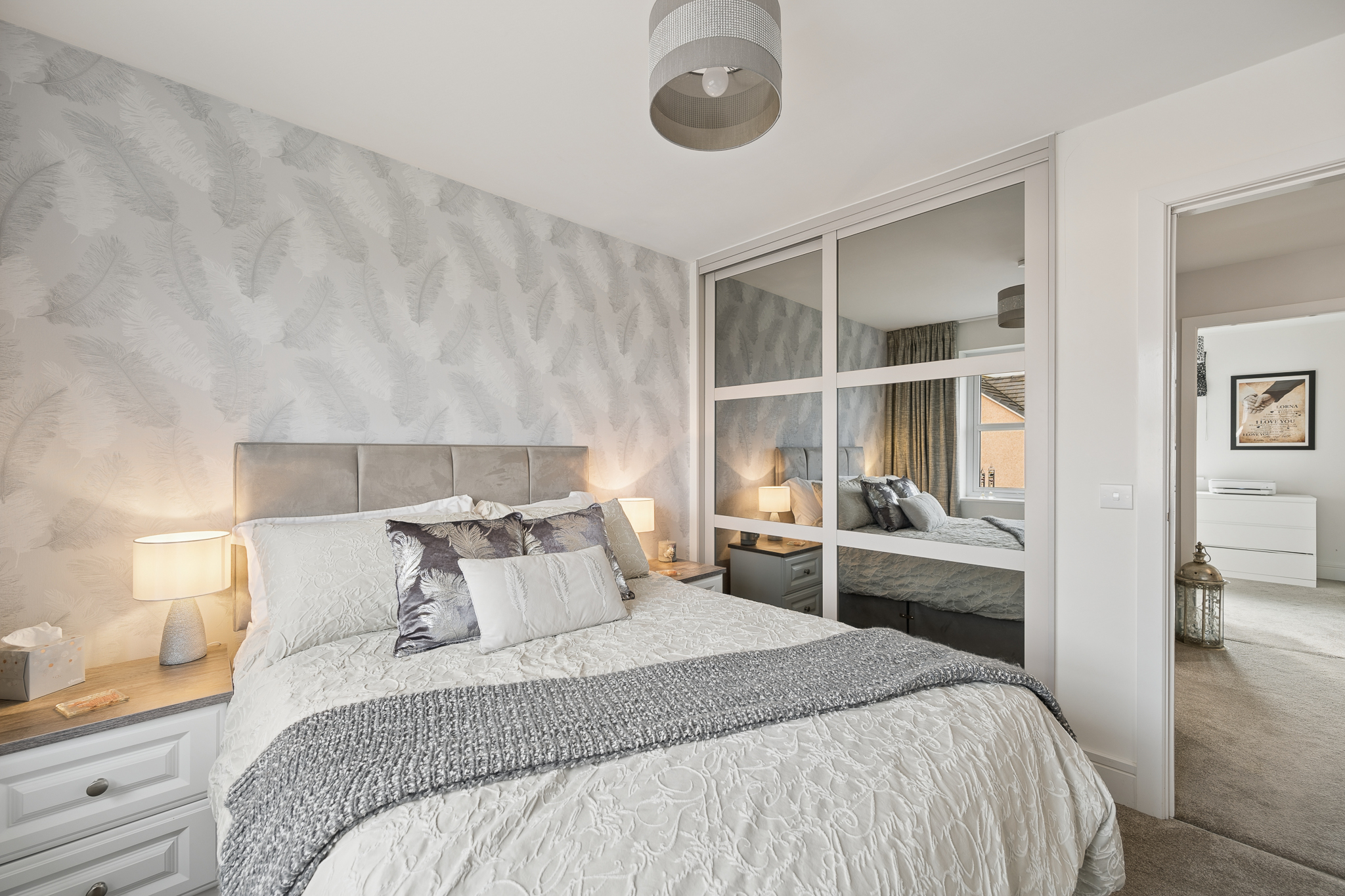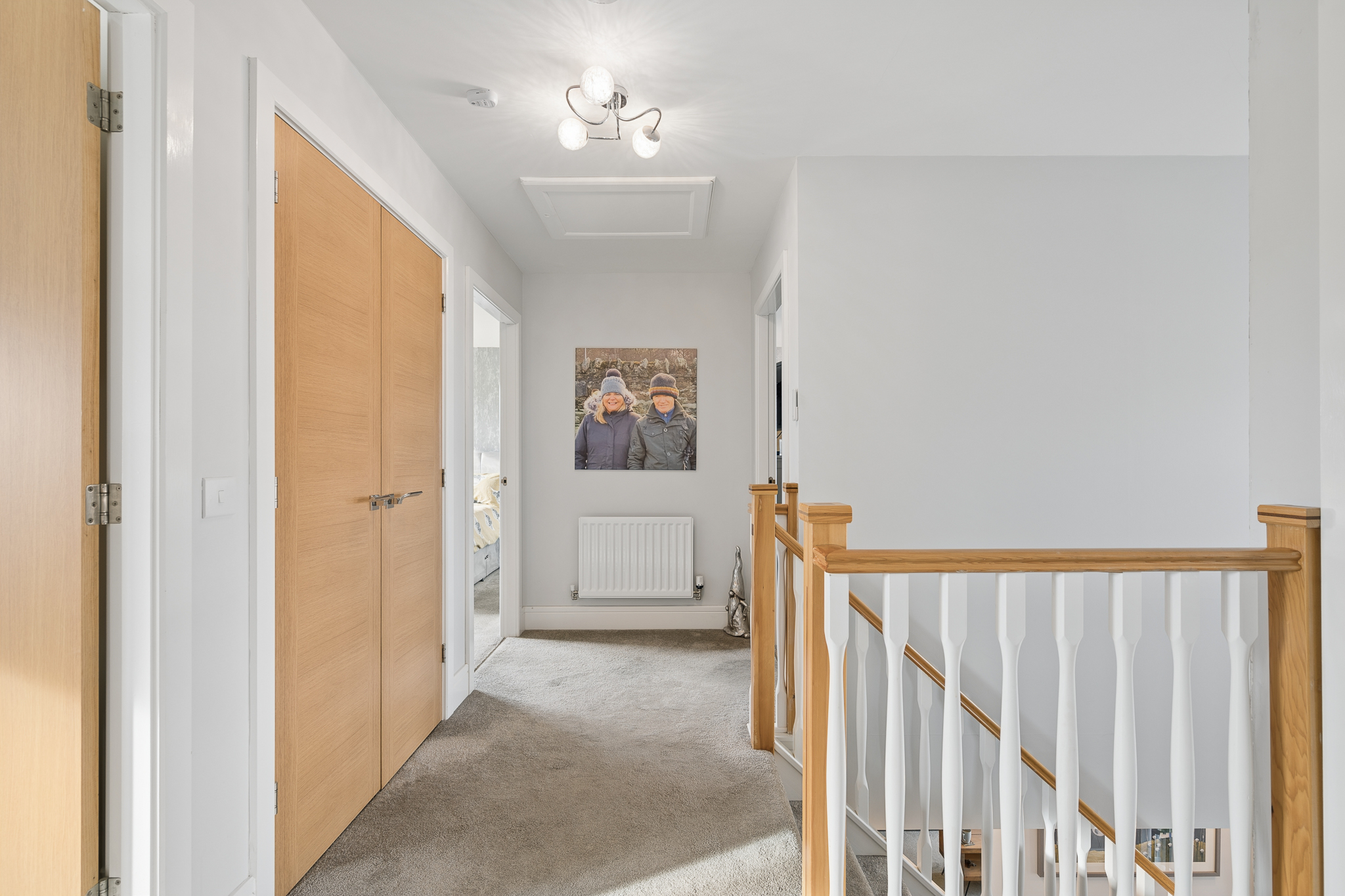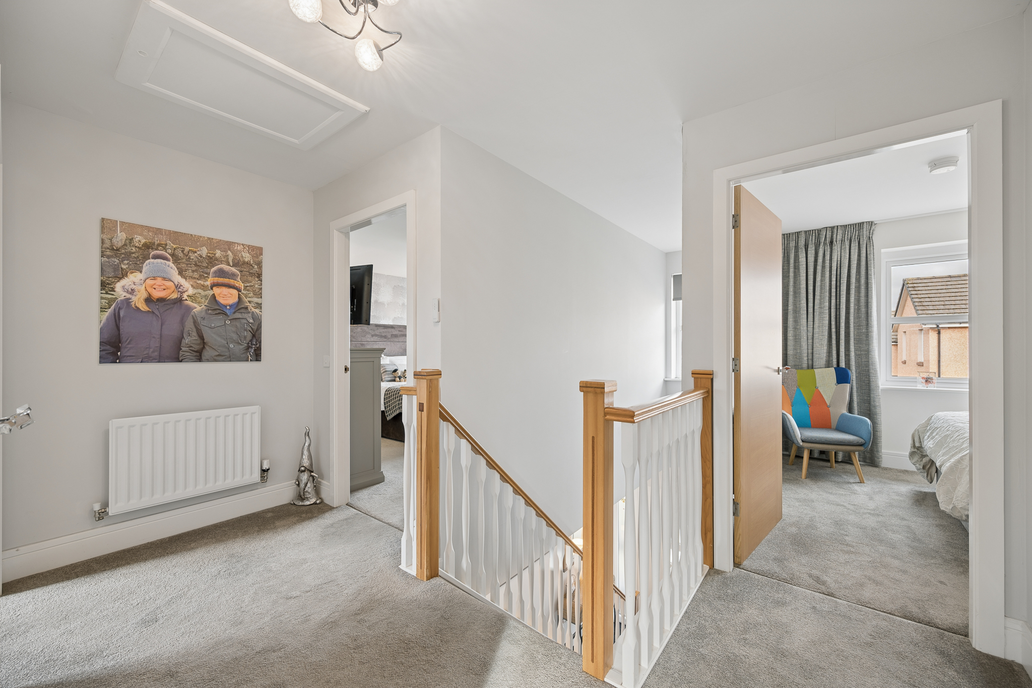 Upstairs, a spacious landing filled with natural light leads to four generously sized bedrooms. The principal bedroom sits to the front of the home and comfortably accommodates a super king size bed with bedside cabinets. It benefits from fitted wardrobes and a beautifully finished ensuite shower room that is fully tiled and includes a large walk in shower. Bedroom two, also positioned at the front of the property, is another generous double room with fitted wardrobe space and ample natural light. Bedrooms three and four are located towards the rear of the property, both offering excellent proportions. Bedroom three comfortably fits a king size bed and features fitted wardrobes, while bedroom four, currently used as a dressing room, can easily accommodate a double bed with bedside cabinets and additional furniture if required. The family bathroom is fully tiled with chrome accents and comprises a modern three piece suite with a bathtub.