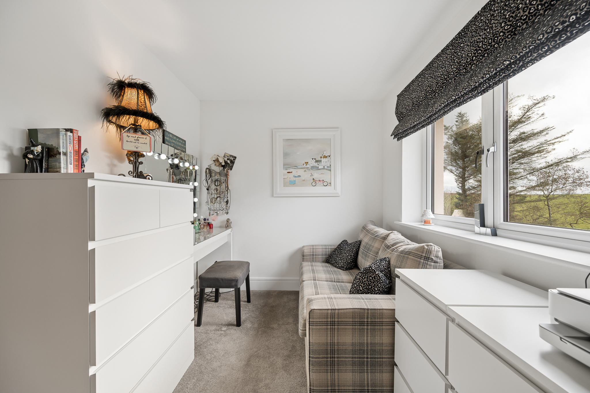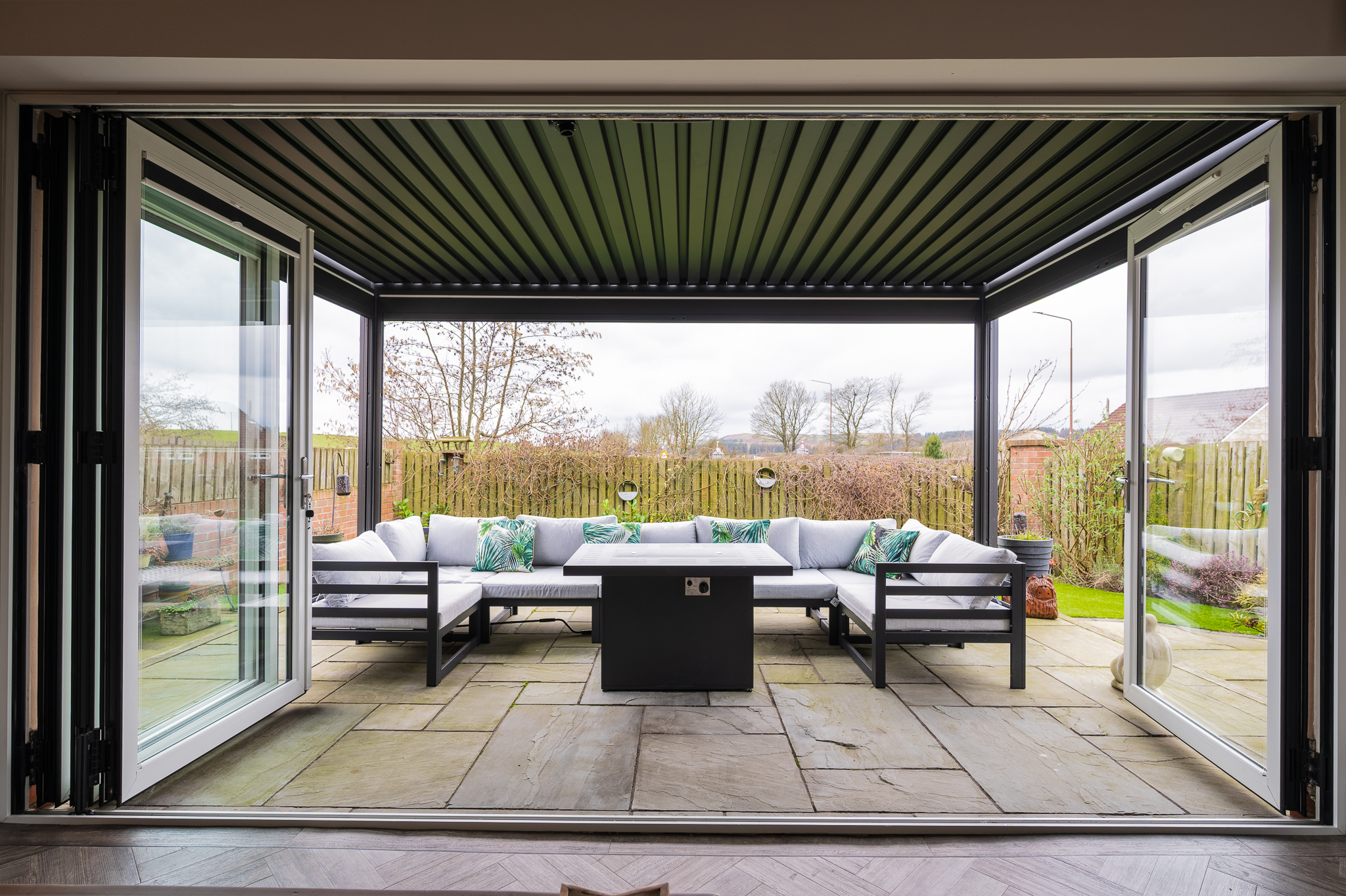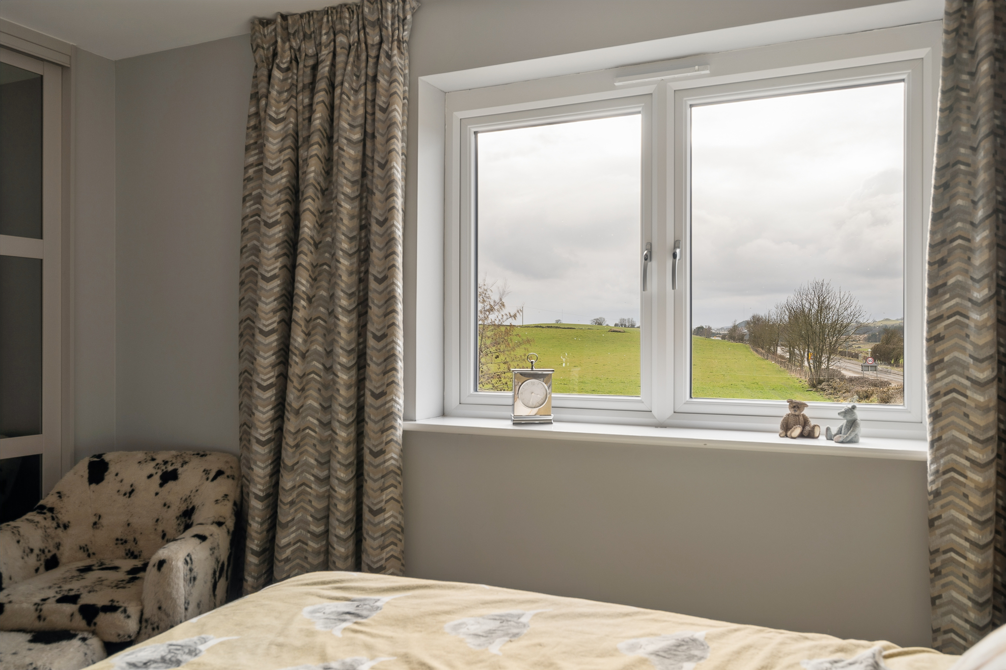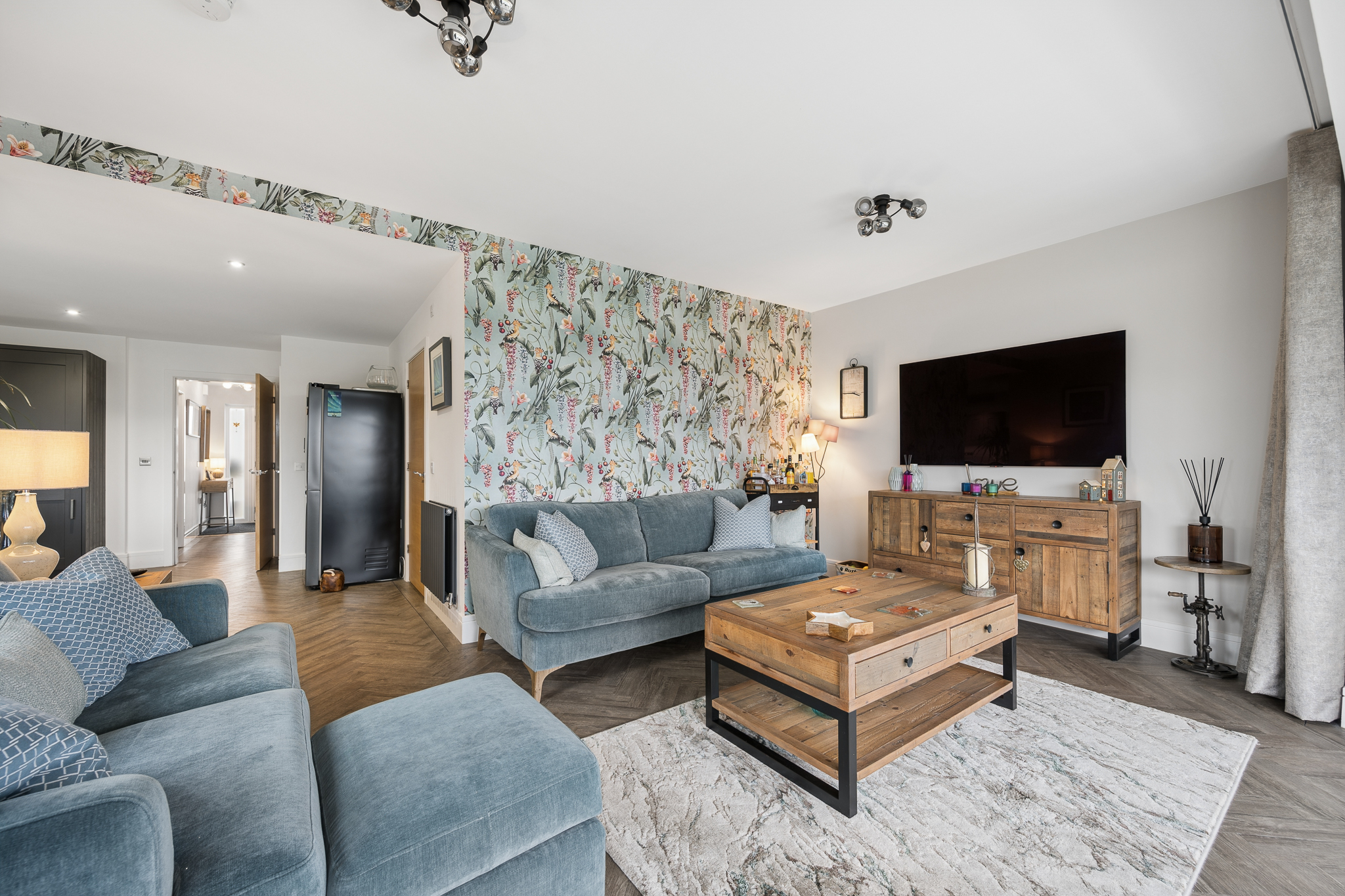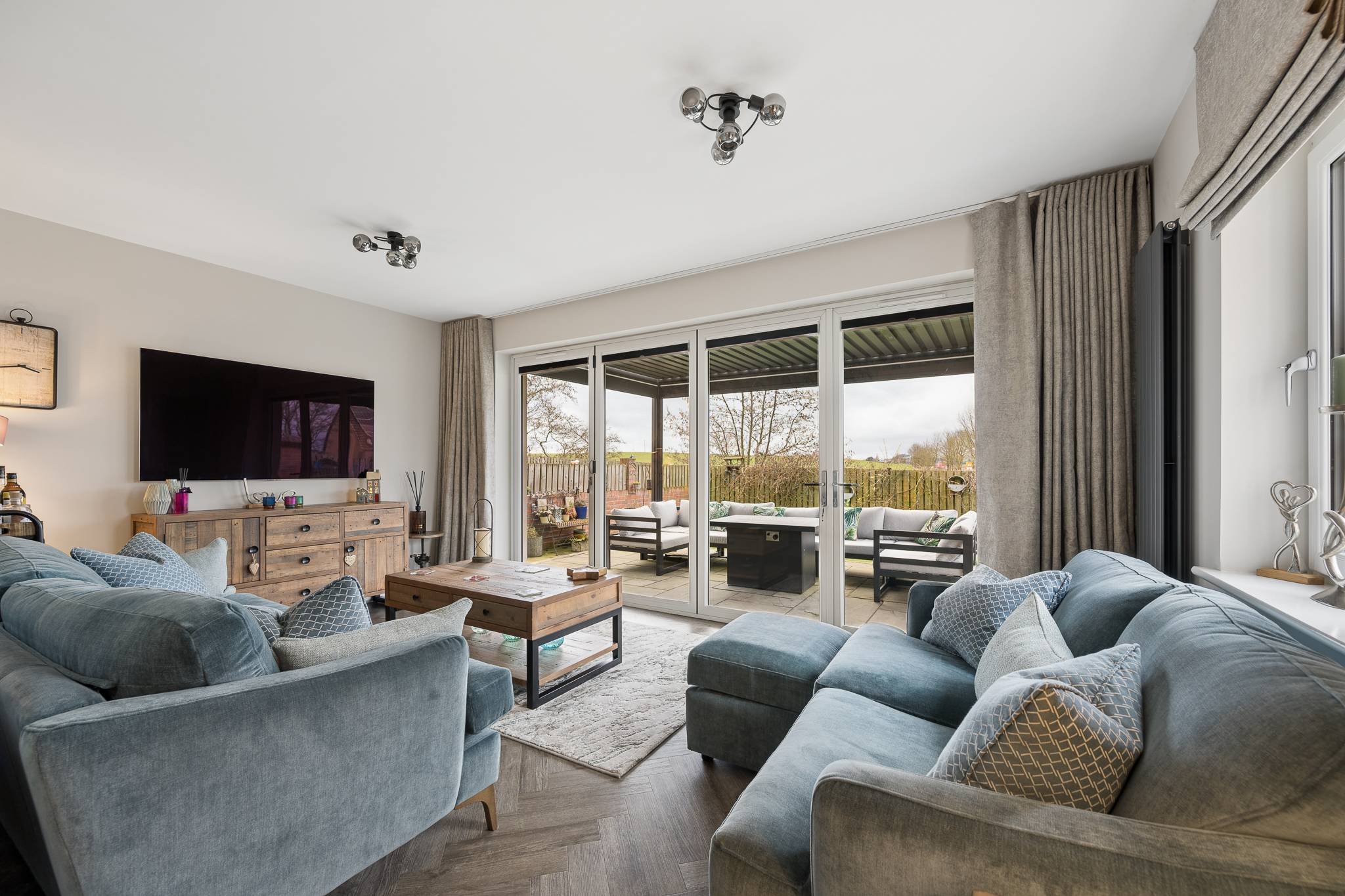 Just off the kitchen is the rear lounge, a beautifully private living space that enjoys bifold doors opening directly onto the south west facing garden. This room comfortably accommodates two large sofas and a media wall and offers the perfect setting for hosting or relaxing while enjoying views over the countryside. The connection between the kitchen, dining area and rear lounge creates a superb layout for modern entertaining.