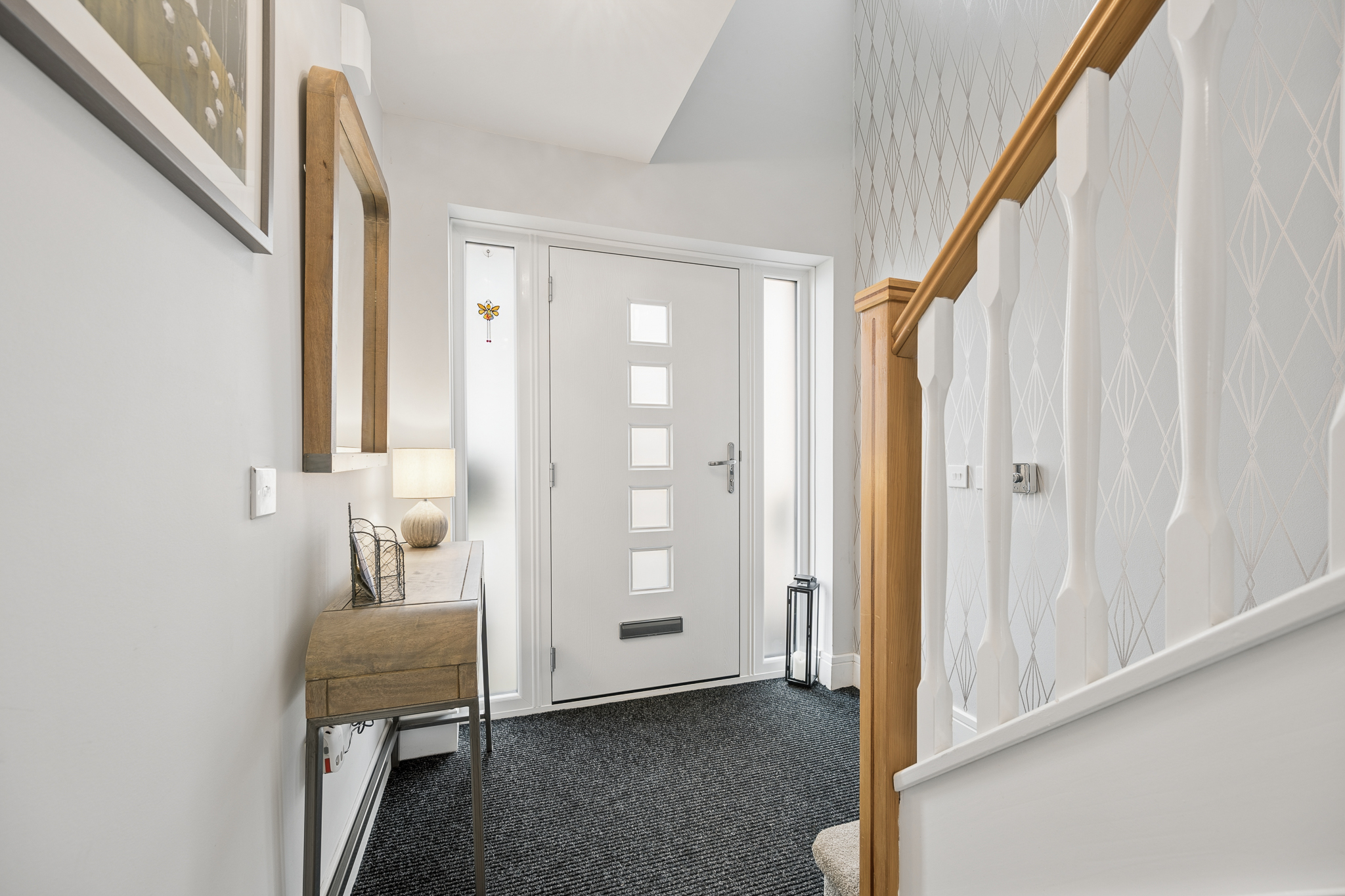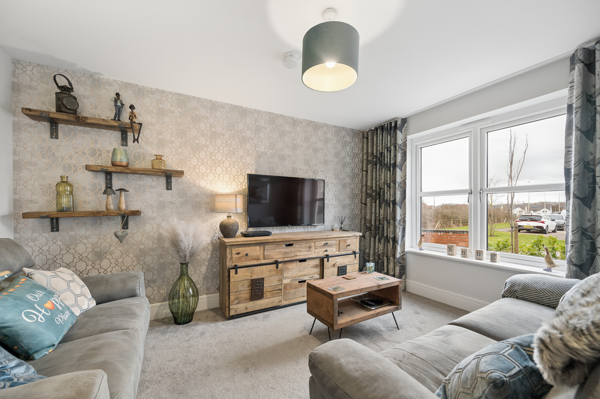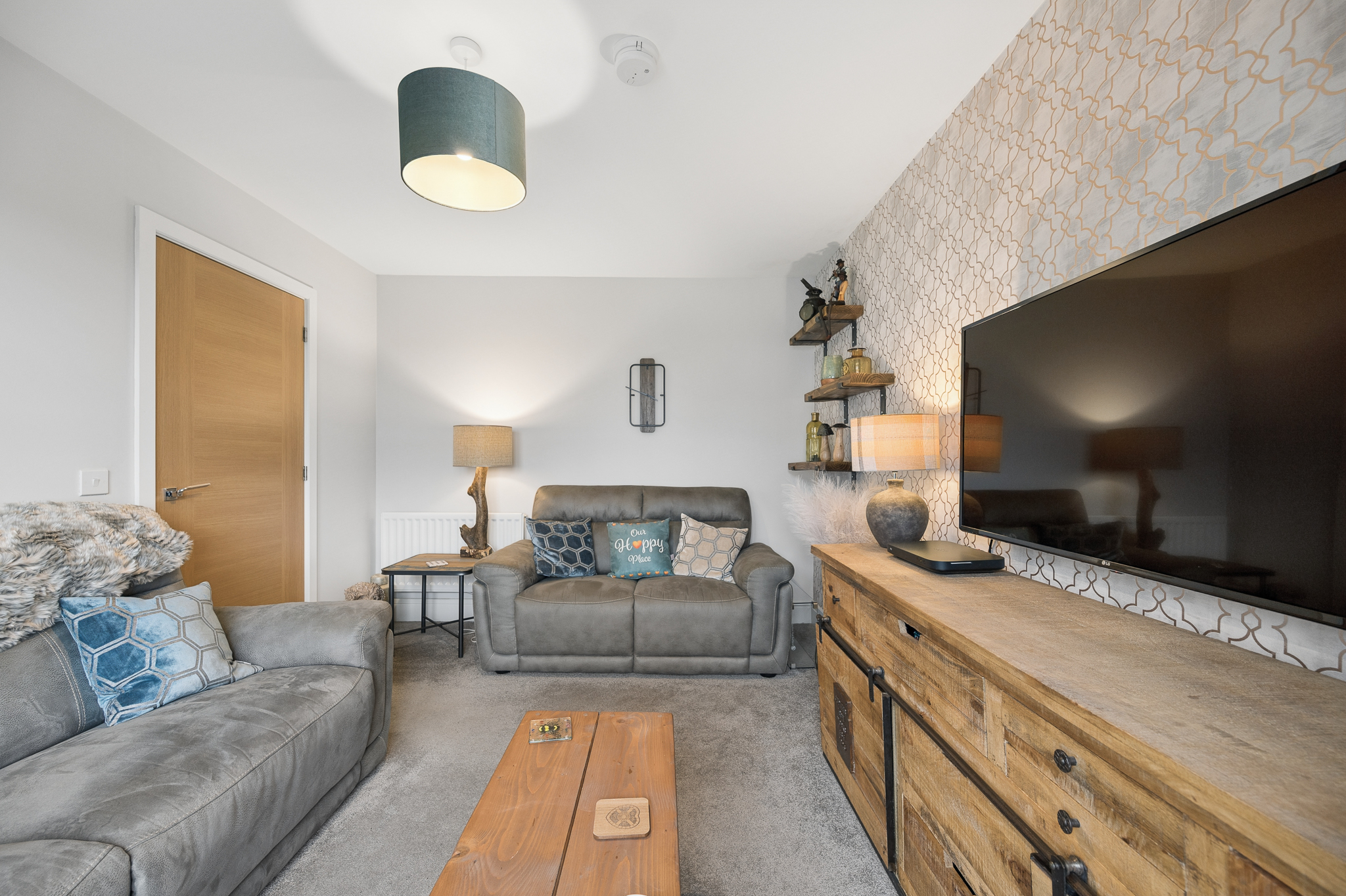 Upon entering, you are welcomed into a bright and spacious hallway that immediately sets the tone for the quality throughout. Positioned to the right is the main lounge, a beautifully proportioned room that comfortably accommodates two large sofas and a media wall. A large front facing window allows natural light to fill the space while maintaining privacy from neighbouring homes, creating a warm and comfortable setting for relaxing or entertaining.