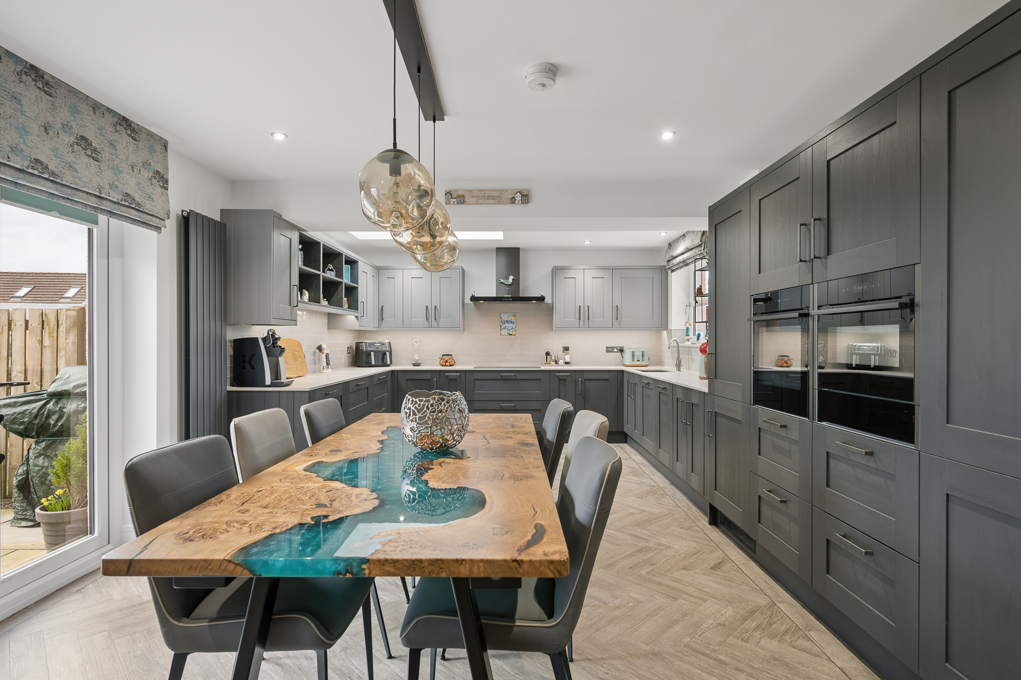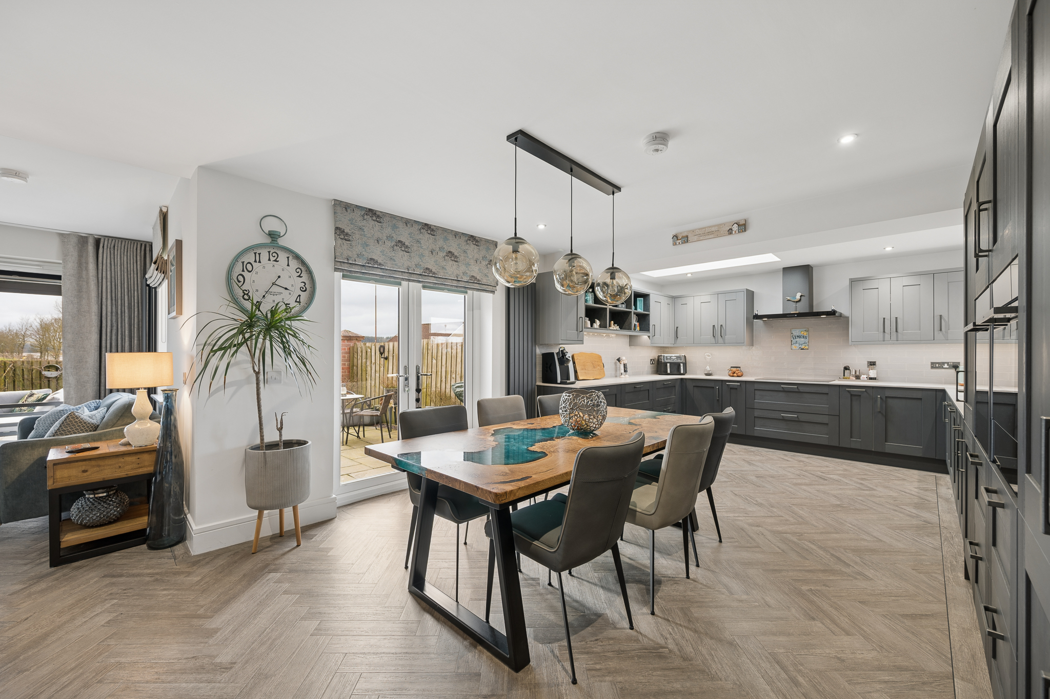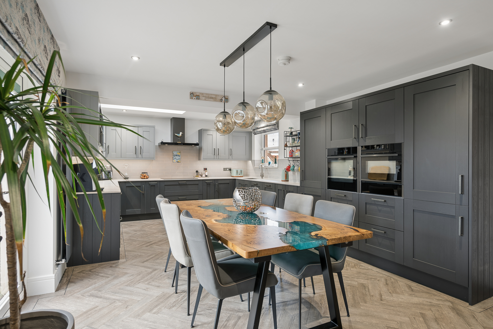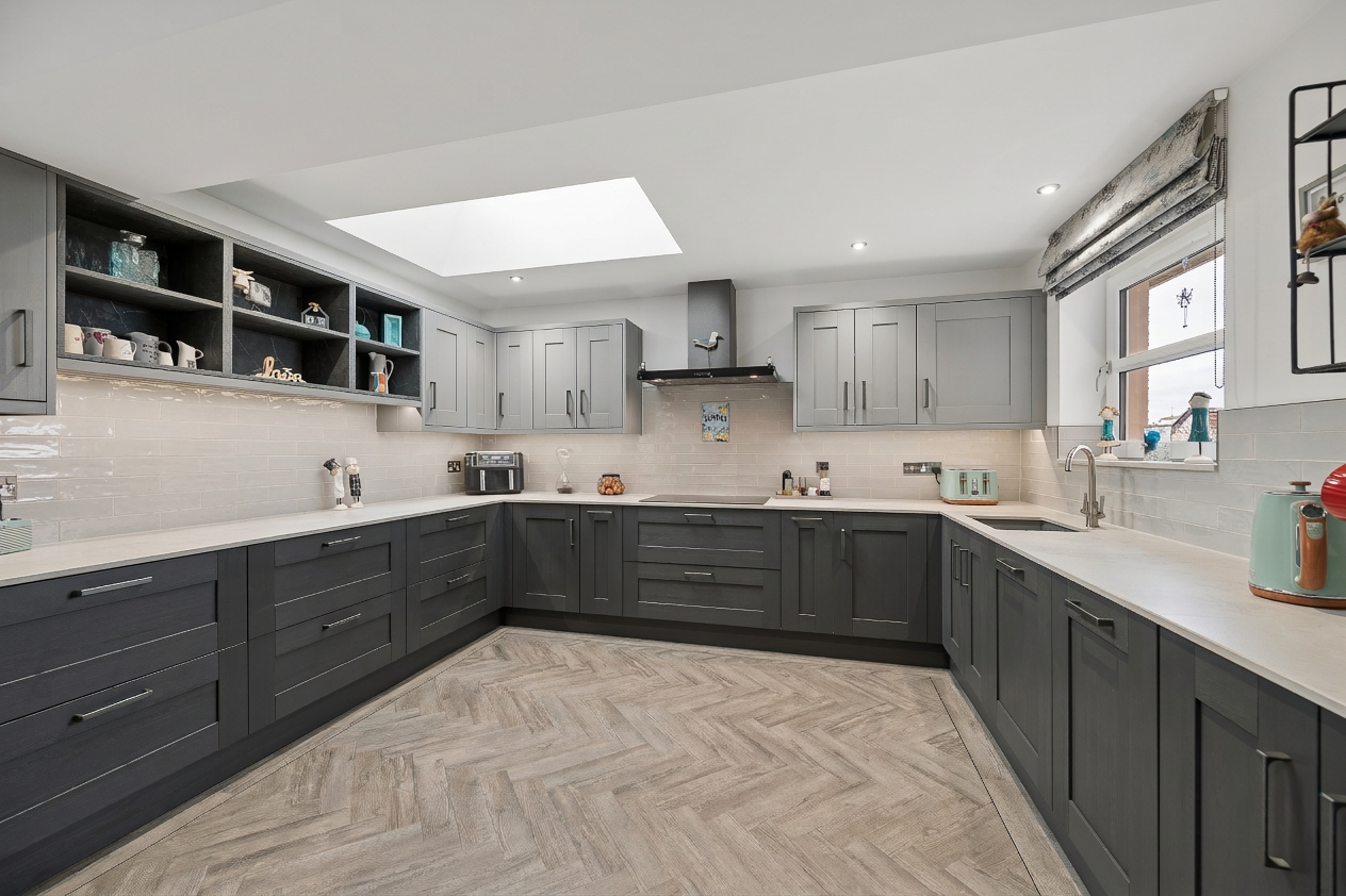 Moving through the hallway towards the rear of the property, you are introduced to the heart of the home, the stunning open plan kitchen and dining area. The kitchen has been extended to the side of the property, providing an exceptional amount of worktop and preparation space, ideal for modern family living and entertaining. Finished with stylish matte grey cabinetry, the kitchen includes integrated appliances such as a fridge freezer, oven, microwave, dishwasher and a five point induction hob with extractor. A skylight above floods the space with natural light, while the dining area comfortably accommodates six to eight people. Herringbone flooring runs throughout the kitchen and rear living space, adding a striking design element. Patio doors open directly onto the garden, creating a seamless indoor outdoor flow.