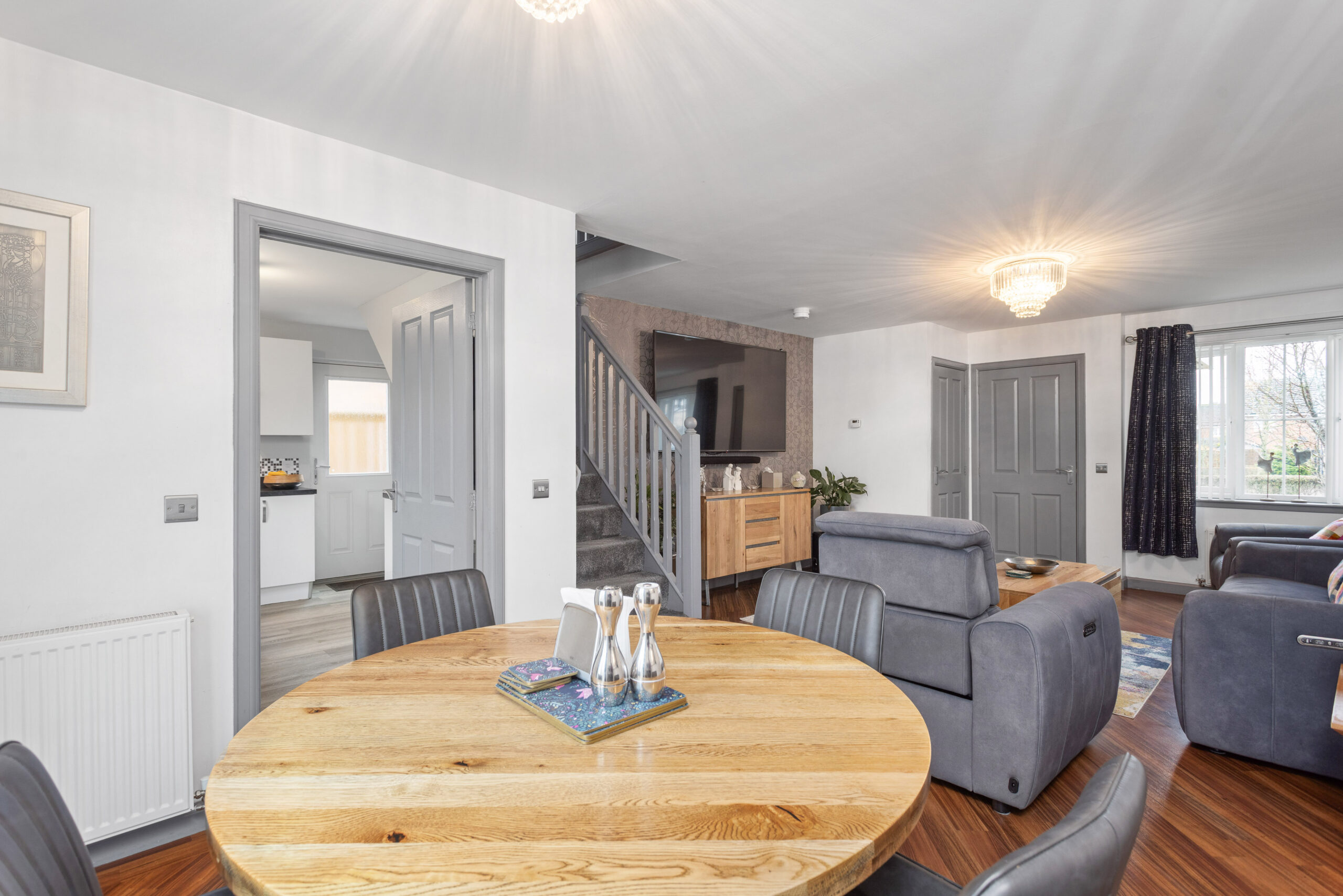 Upon entering, you are welcomed into a bright entrance hallway that sets the tone for the rest of the home. To the right hand side is the convenient downstairs WC, finished with splashback tiling and contemporary fittings. Moving through, you are introduced to the spacious open plan lounge and dining area, the true heart of the home. This beautifully styled space comfortably accommodates two large sofas and a media wall, while the dining area to the rear provides room for four to six guests. Patio doors open directly onto the south east facing rear garden, flooding the room with natural light and creating a seamless indoor outdoor flow, perfect for entertaining.