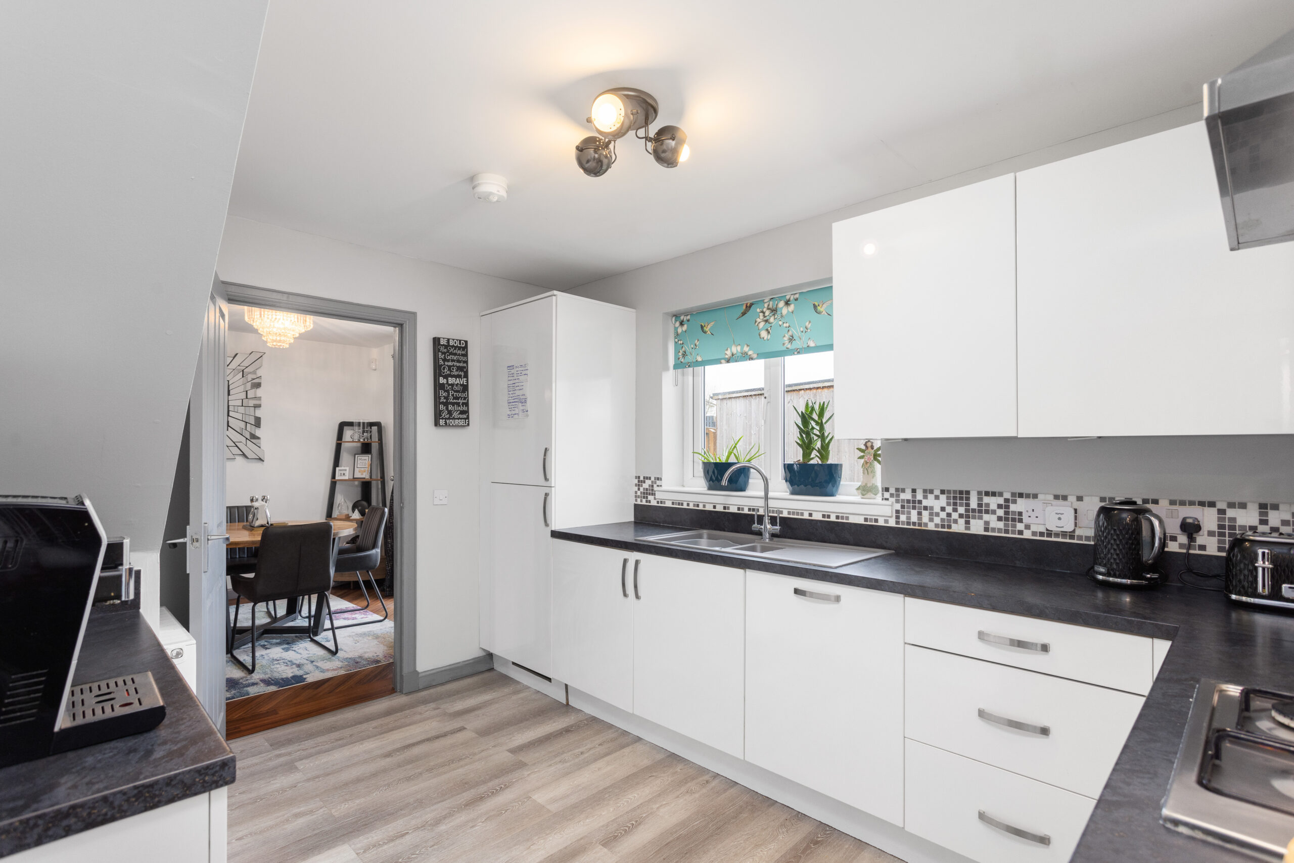 Just off the dining area sits the modern kitchen, finished with white gloss cabinetry, dark worktop and splashback tiling. The kitchen is fully equipped with integrated appliances including a fridge freezer, dishwasher, four point gas hob, oven and grill, offering both practicality and style. A door from the kitchen leads to the partially converted garage, currently used as a gaming room. This versatile space could easily function as a home office, second lounge, or playroom and also incorporates a useful utility area for everyday convenience while still retaining valuable storage space.